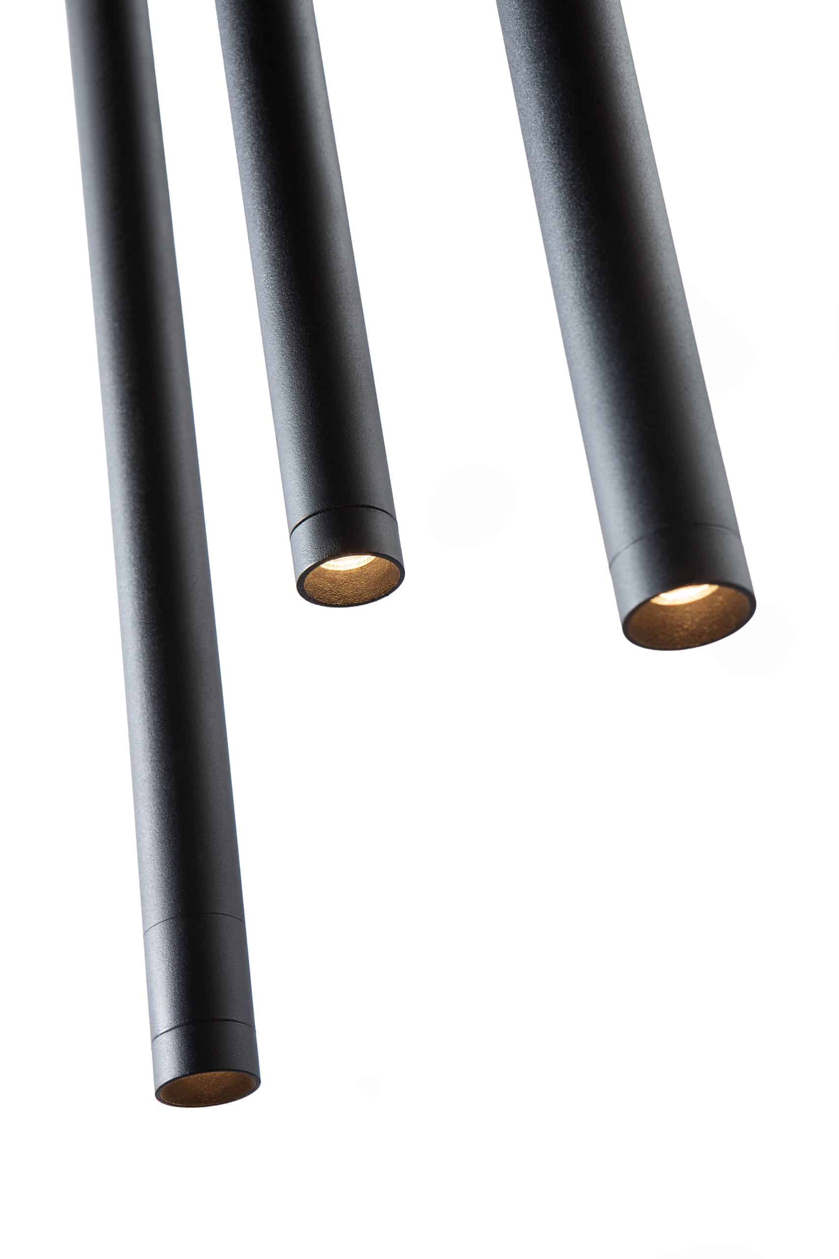 Uma luz focada, que ilumina o tampo de uma mesa e rebate com uma luz confortável aos olhos, criando aquele ambiente mais íntimo, perfeito para a mesa de jantar. Os pendentes Lineas Chuva podem ser dispostos de maneira descontraída ou, ainda, em linha, formando um desenho especial, proposto pelos designers. Estão disponíveis em três alturas diferentes: 23, 32 e 50cm, o que enriquece a composição. Os tubos metálicos de design minimalista alojam o Led integrado levemente recuado dentro do metal para evitar ofuscamento. Além disso, possuem em seu corpo o dispositivo honeycomb.