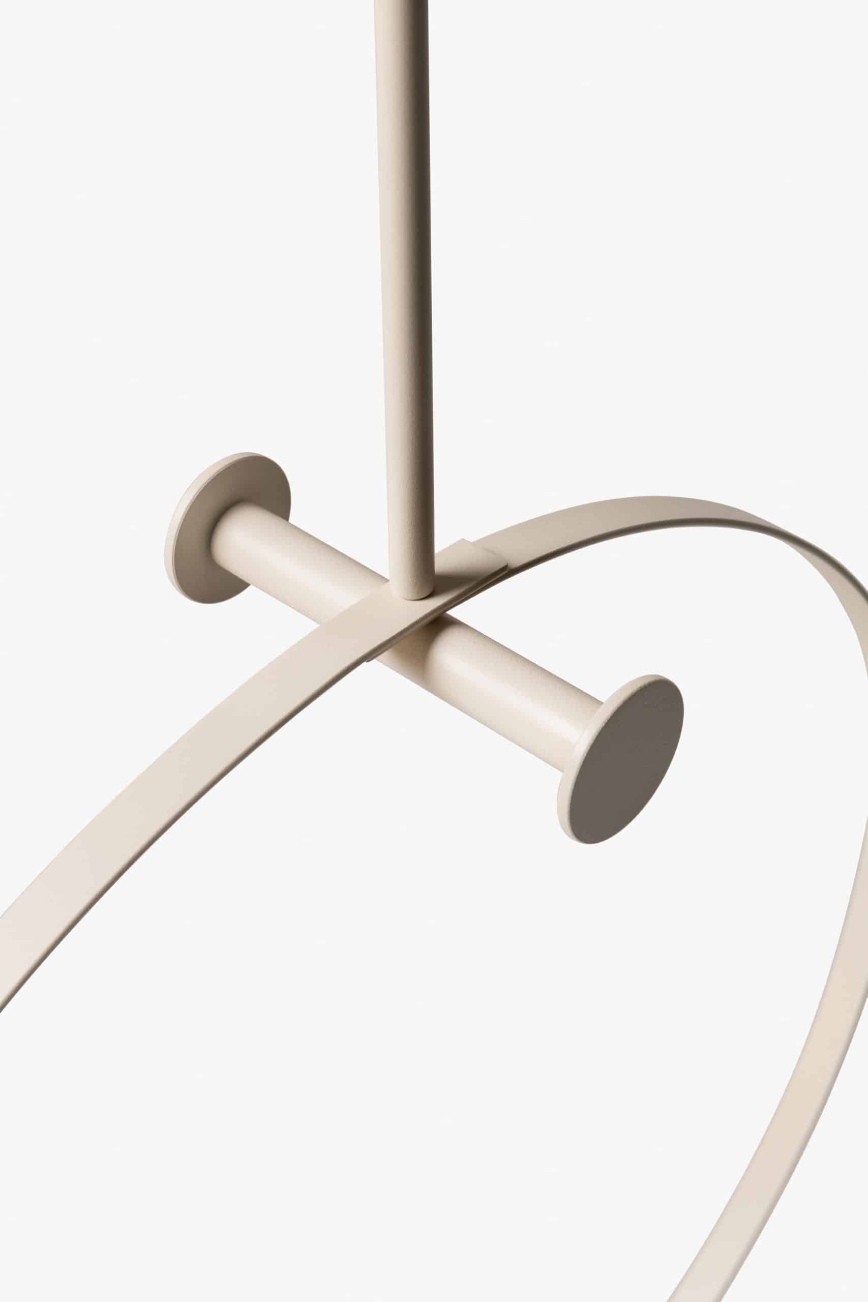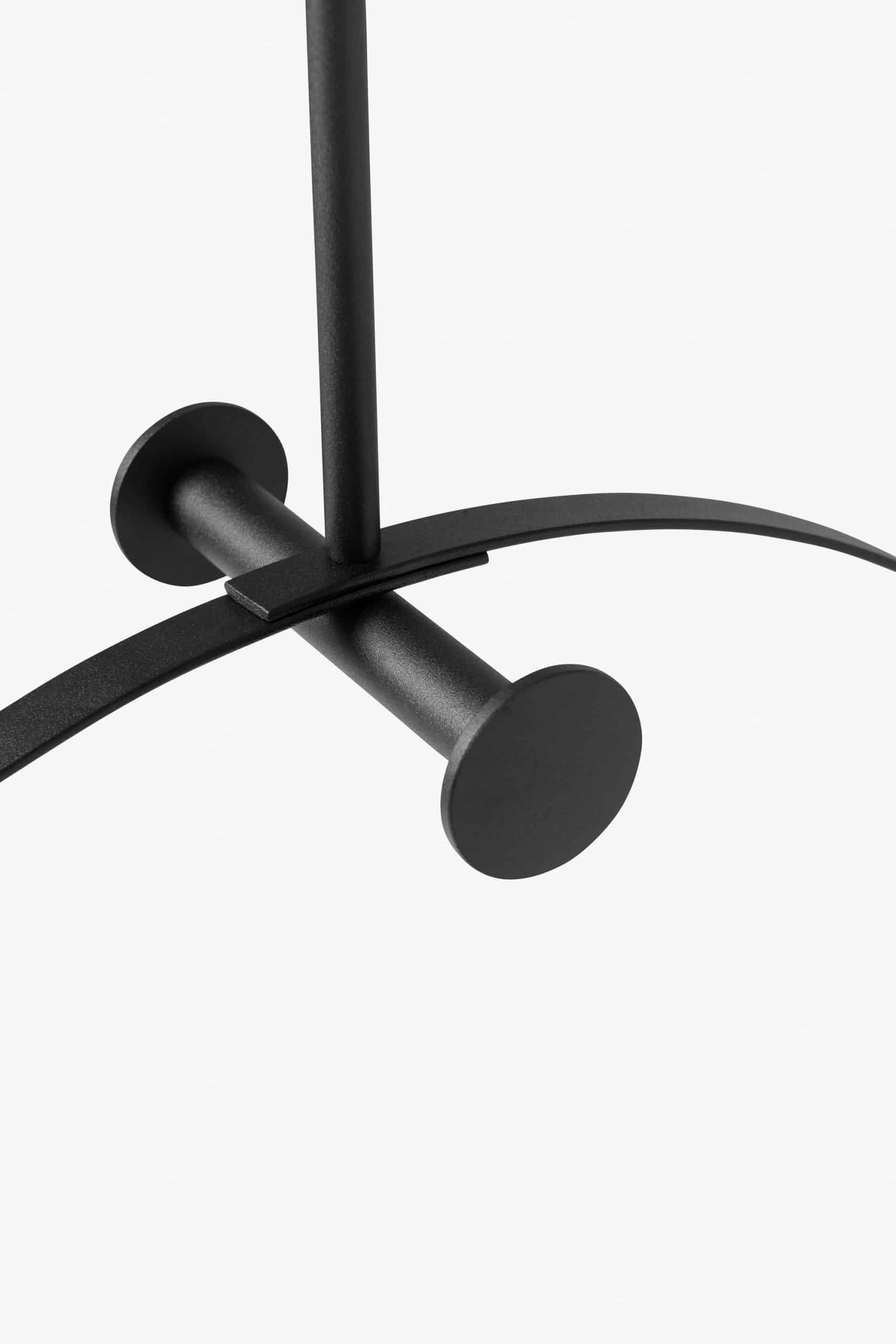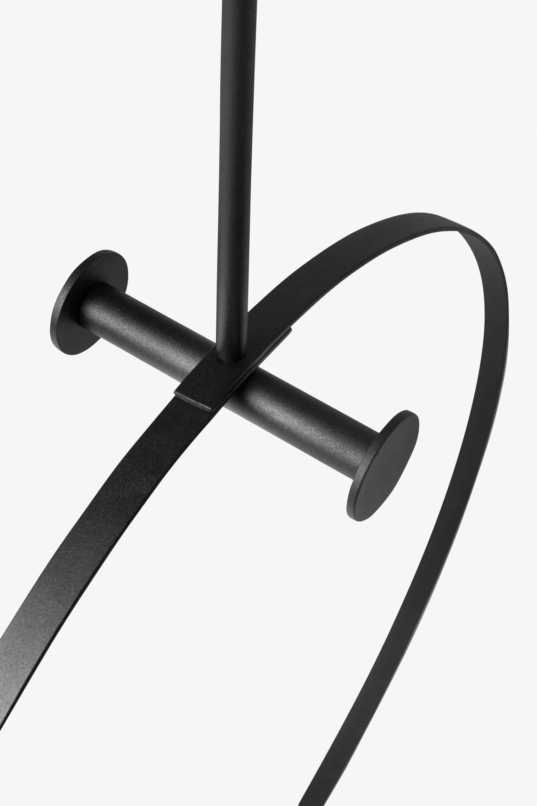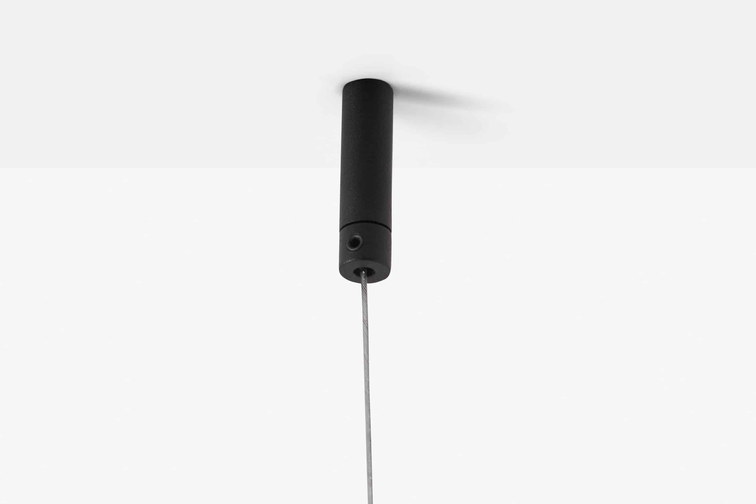 Cabideiro suspenso em metal. Estrutura de aço com pintura eletrostática texturizada (versões Preto e Areia) ou aço inox polido. Suspensão por cabo de aço com regulagem de altura.