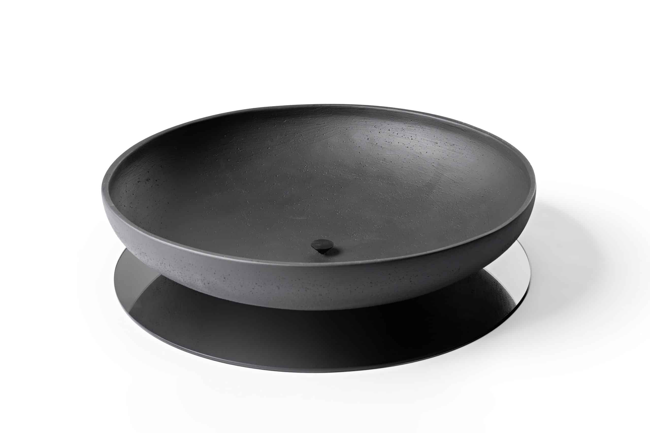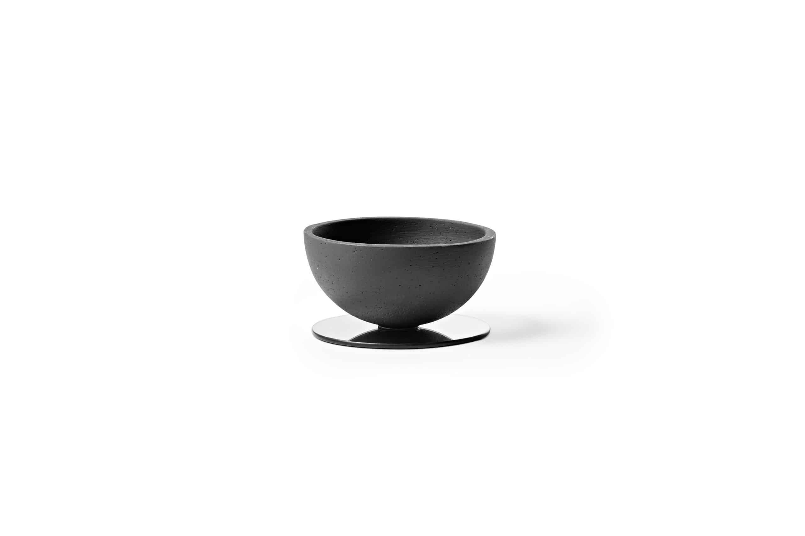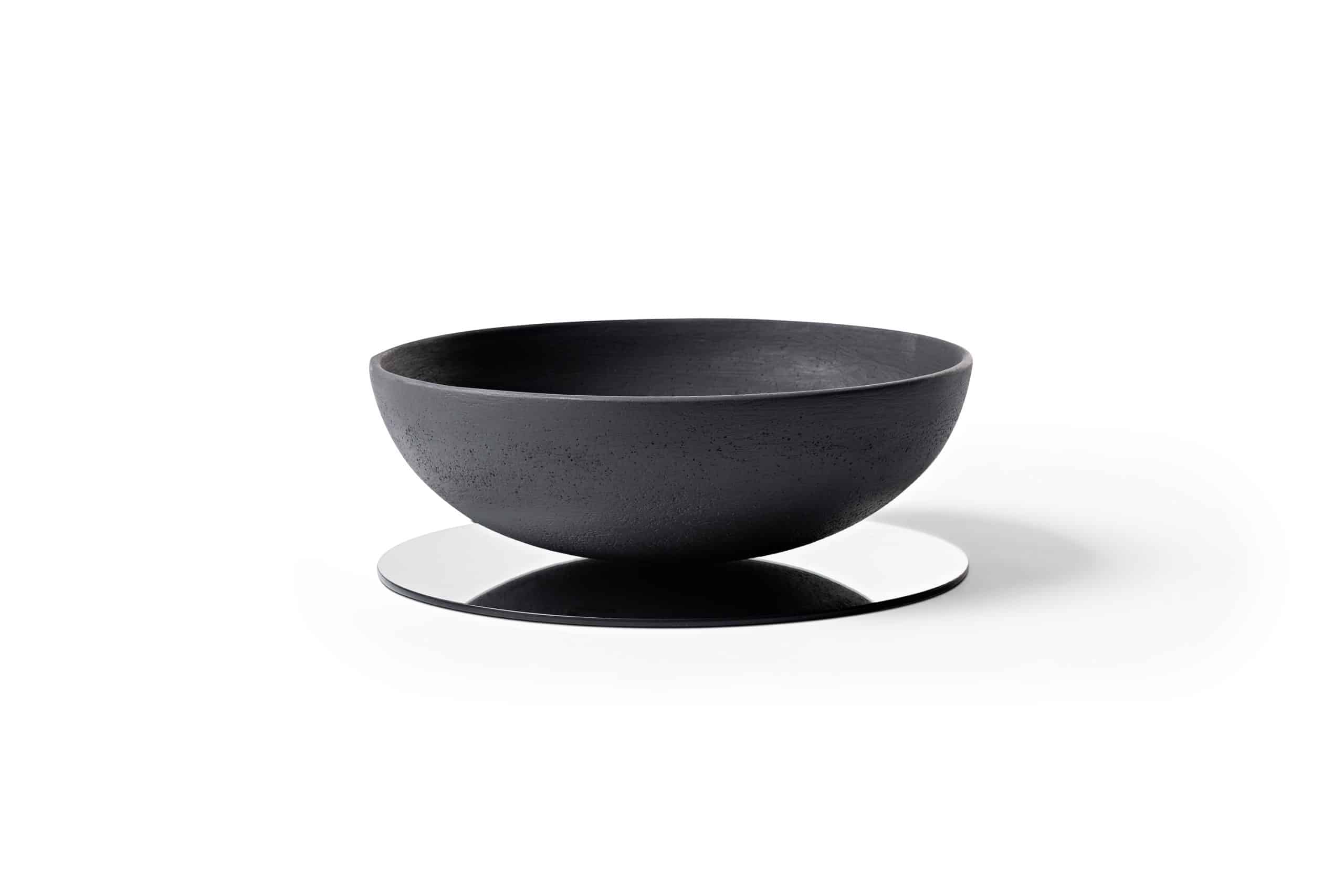 Bowl decorativo de cerâmica com base de espelho. O bowl é fixado à base com um peça usinada em alumínio anodizado (versão Preto) ou cobre maciço escovado com verniz fosco (versão Terracota).