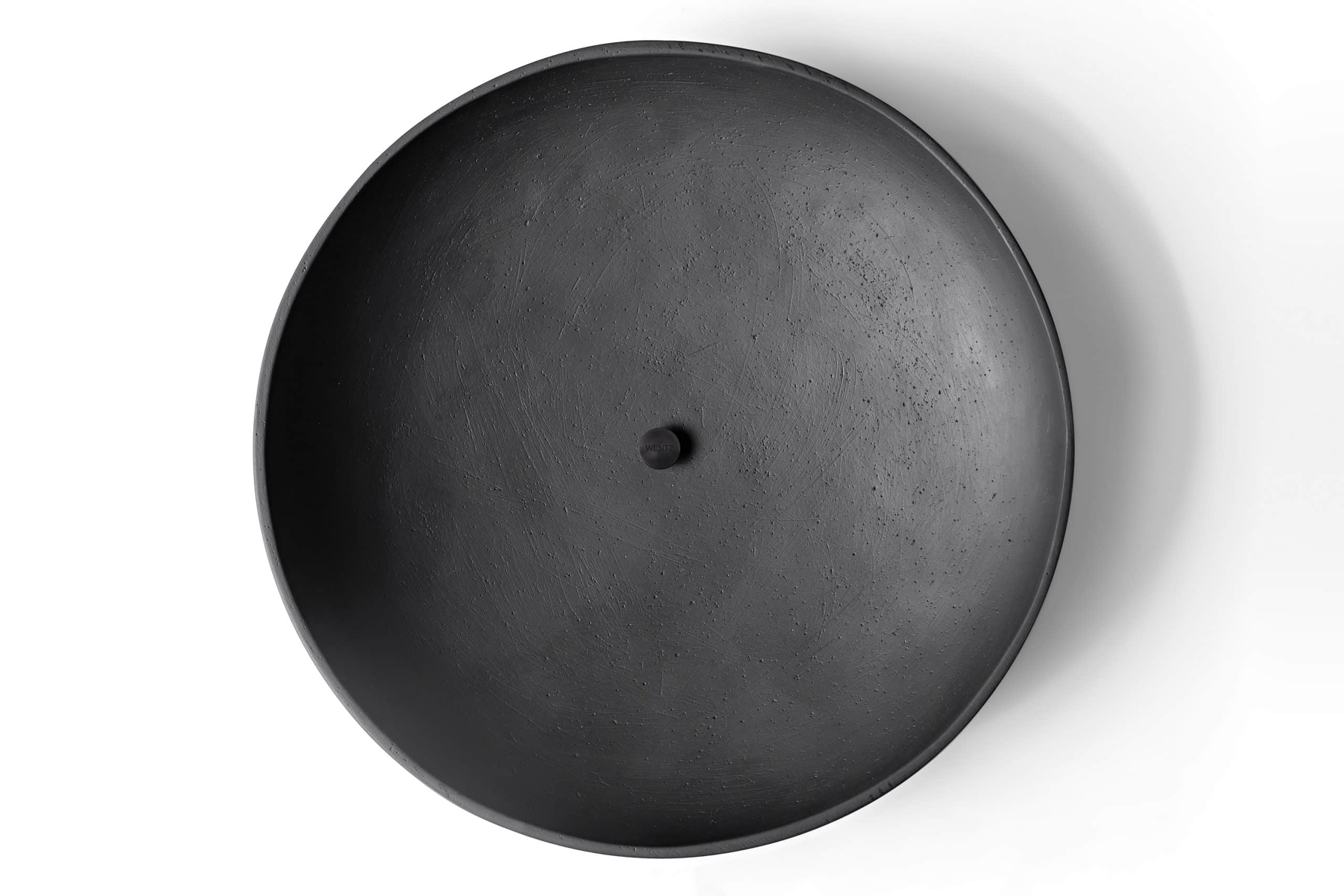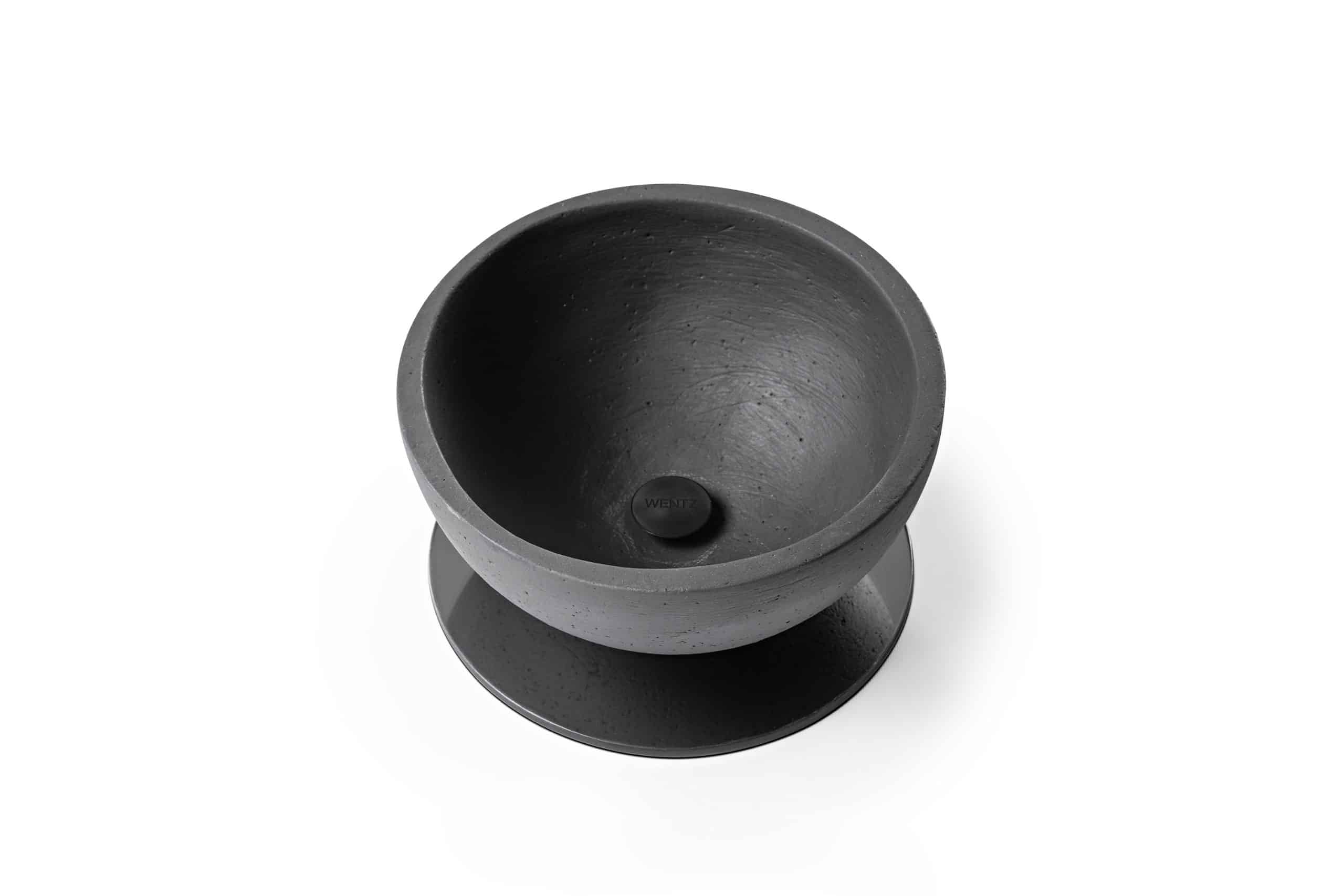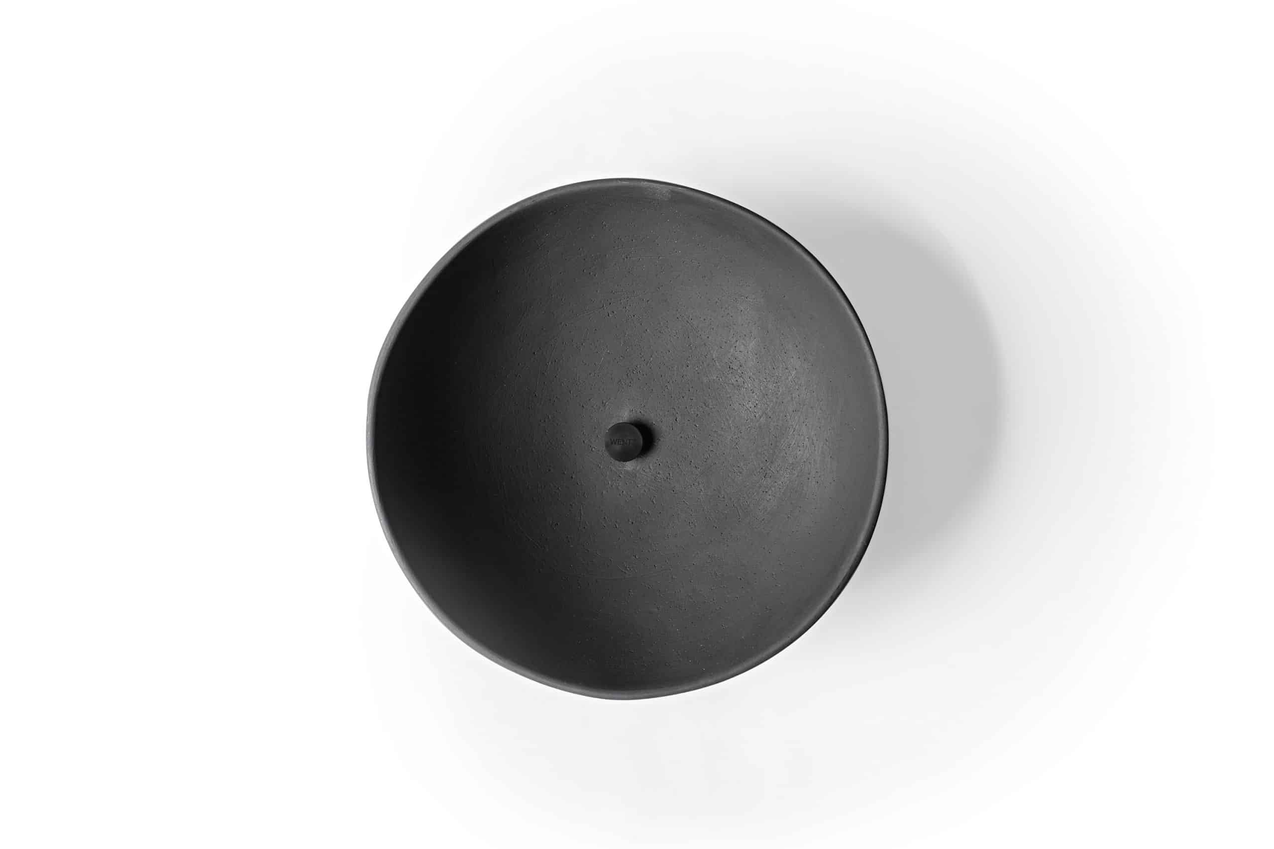 Bowl decorativo de cerâmica com base de espelho. O bowl é fixado à base com um peça usinada em alumínio anodizado (versão Preto) ou cobre maciço escovado com verniz fosco (versão Terracota).