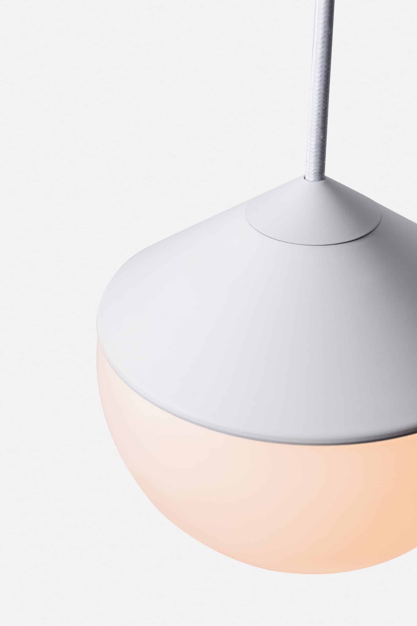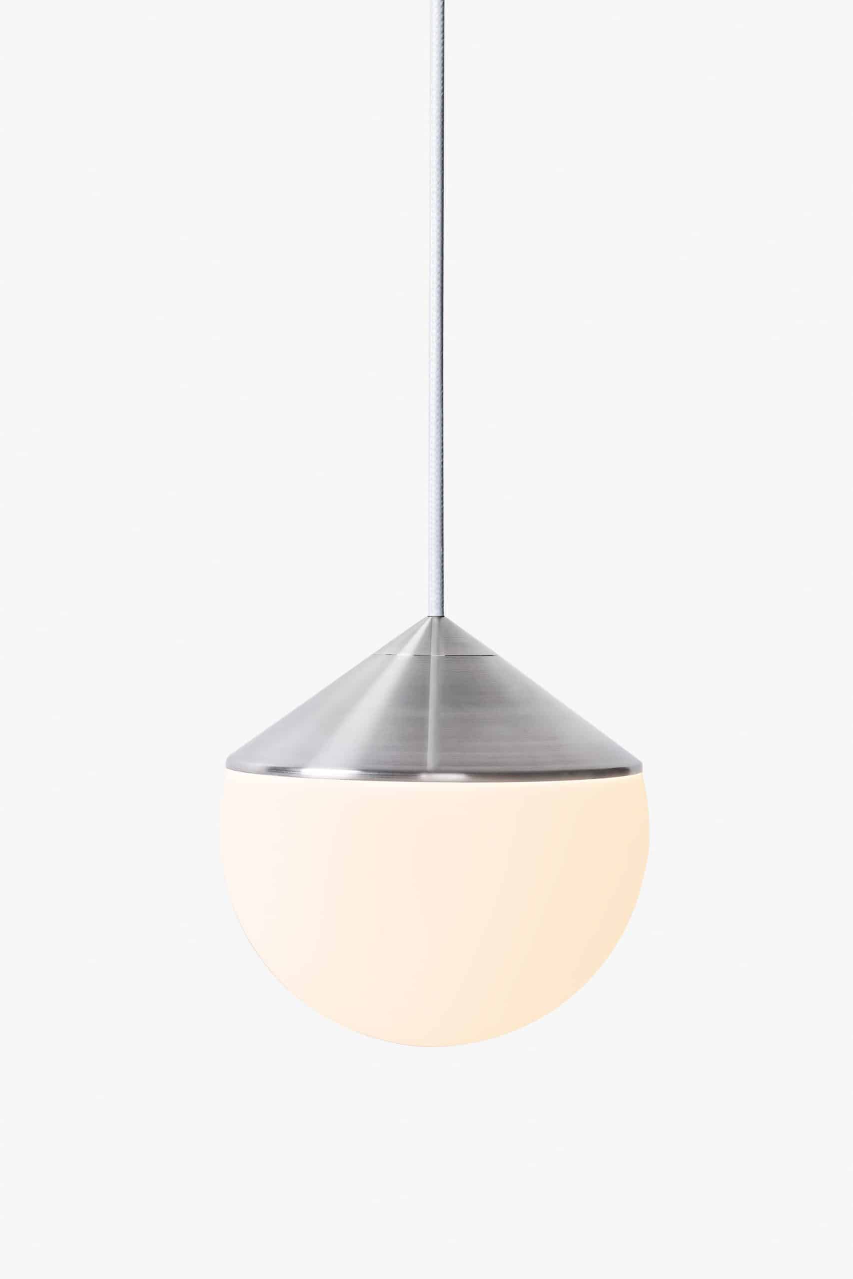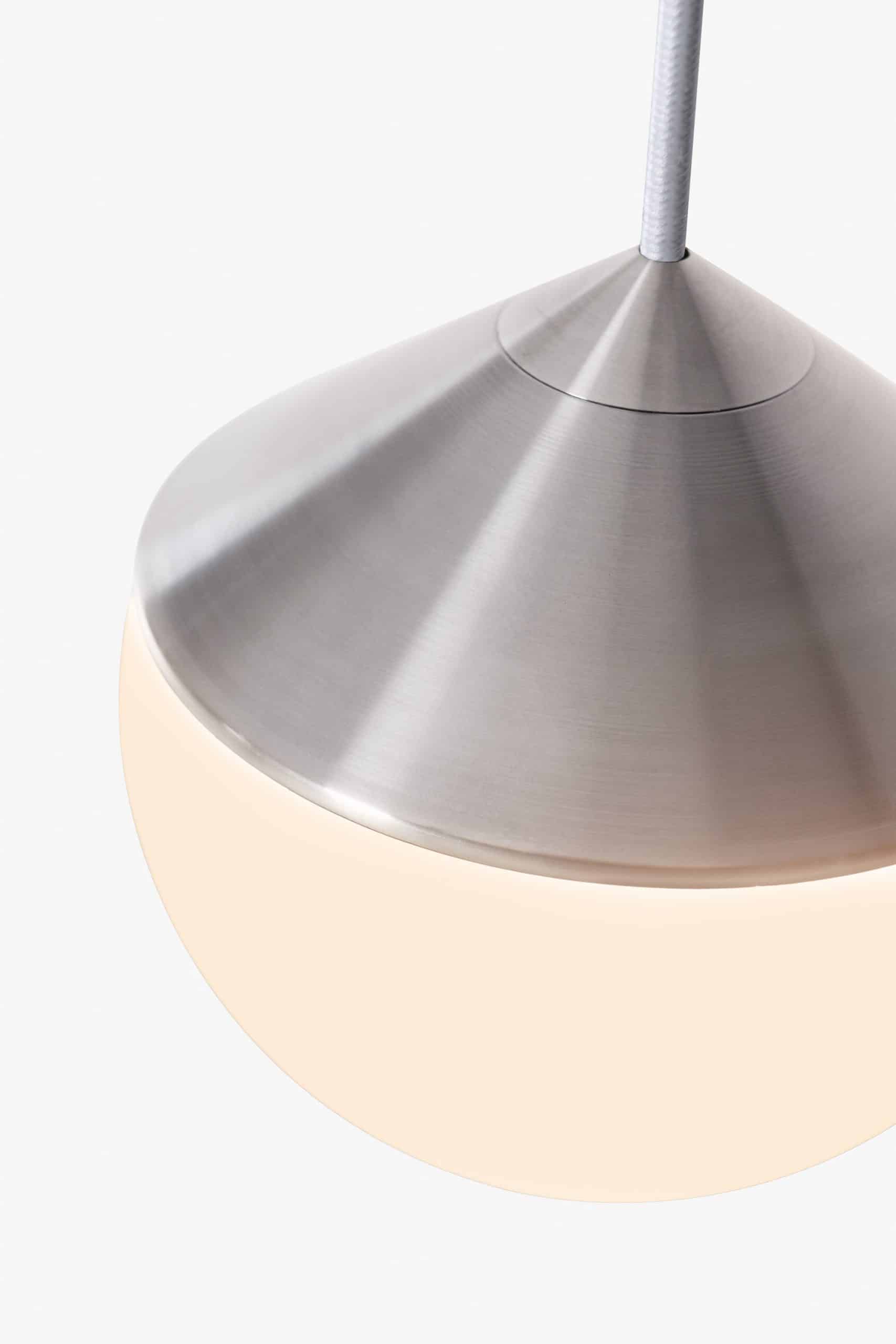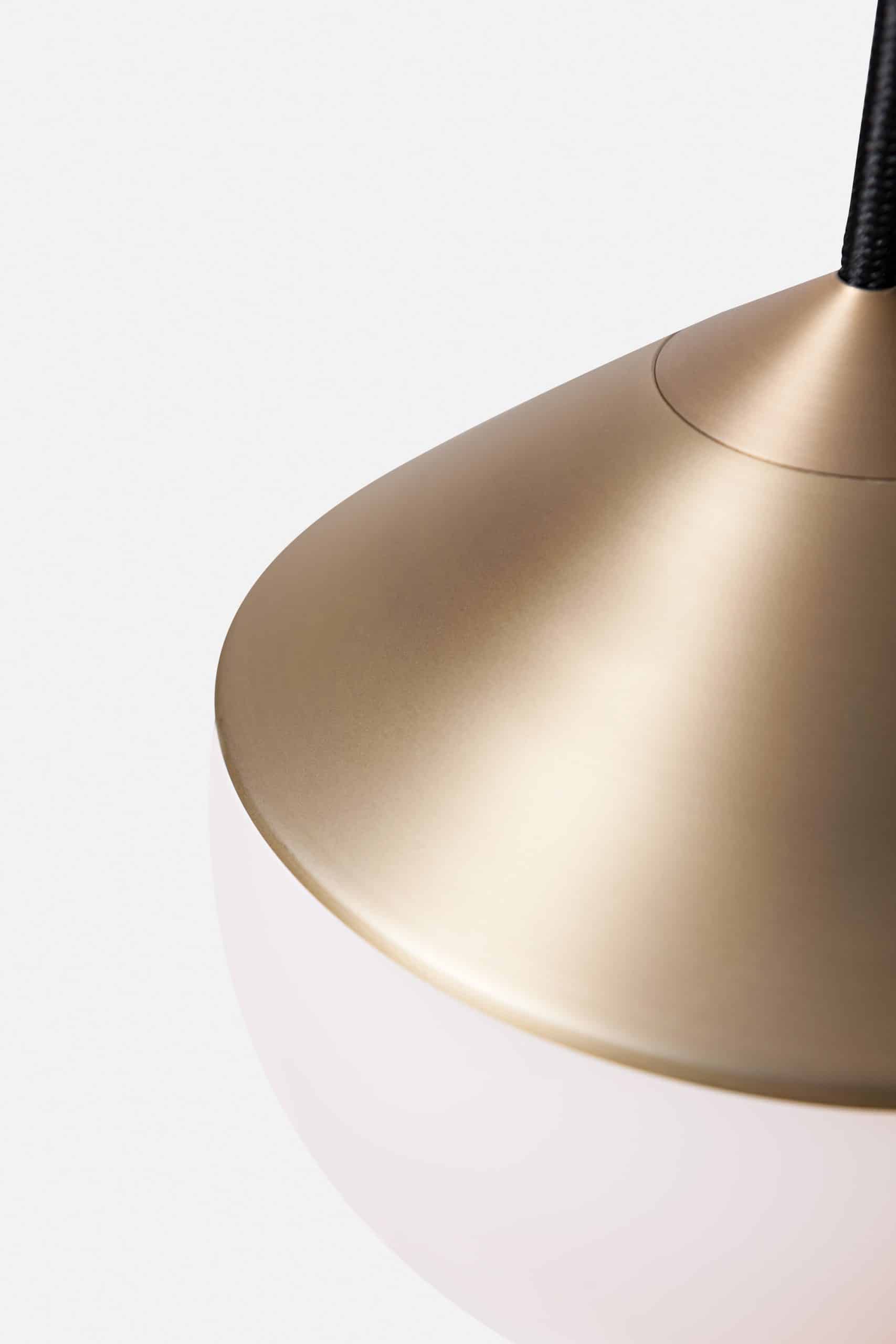 Luminária de mesa com luz difusa. Base de alumínio com pintura líquida e verniz soft-touch (versões Off White e Off Black); latão escovado com verniz fosco; ou aço inox escovado nas opções natural ou com verniza preto. Difusor de vidro soprado com acabamento fosco. Cabo revestido de tecido. LED integrado.