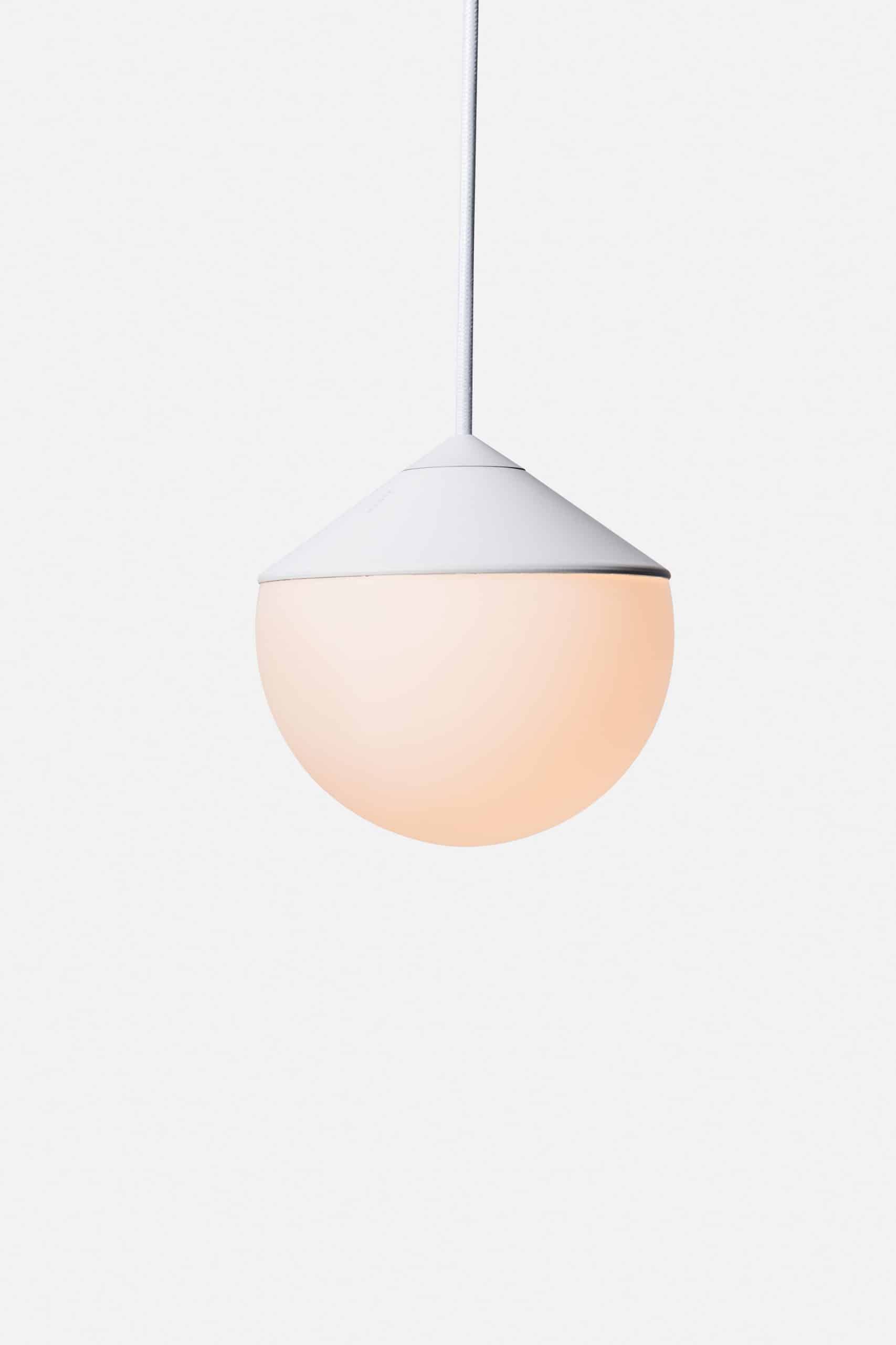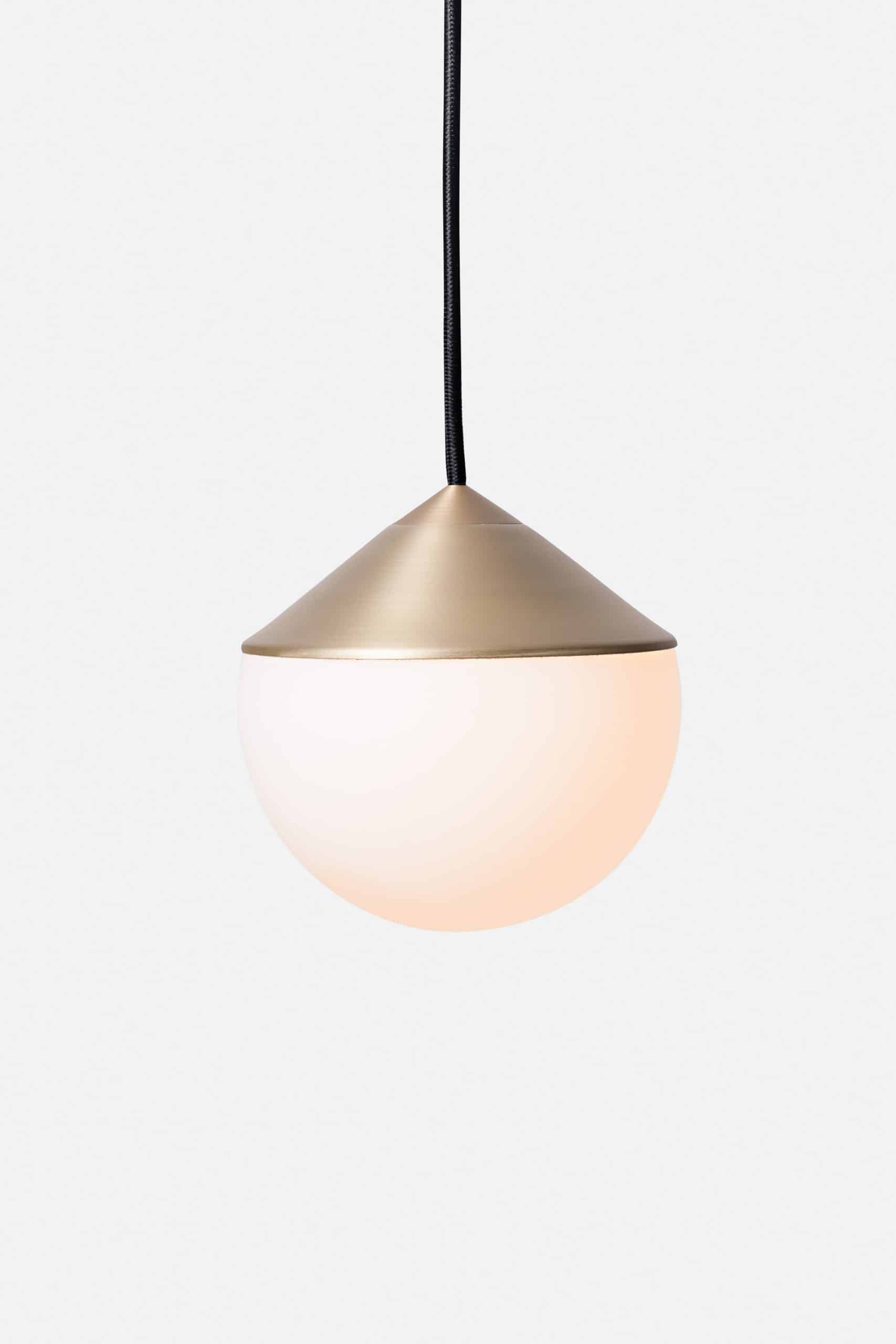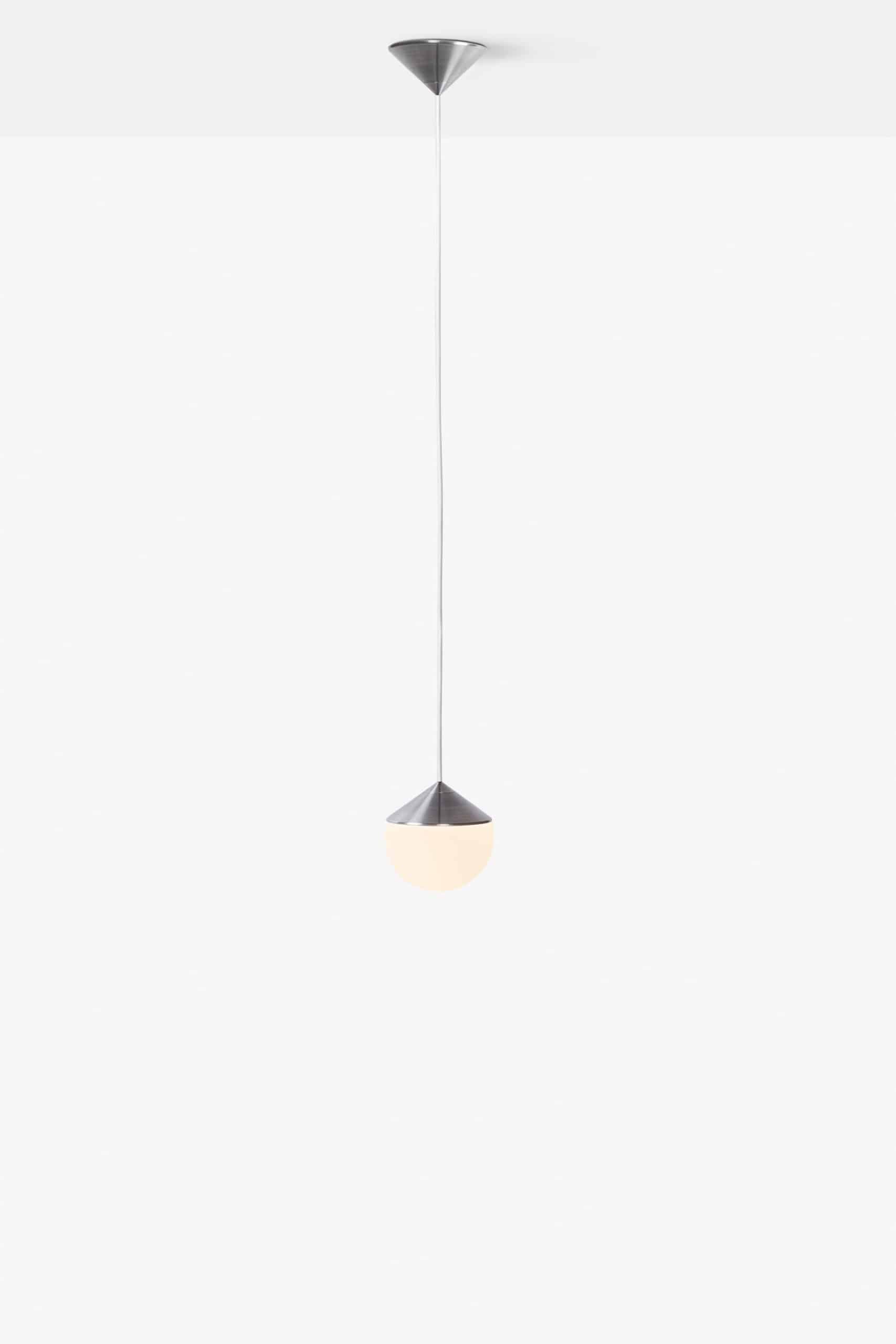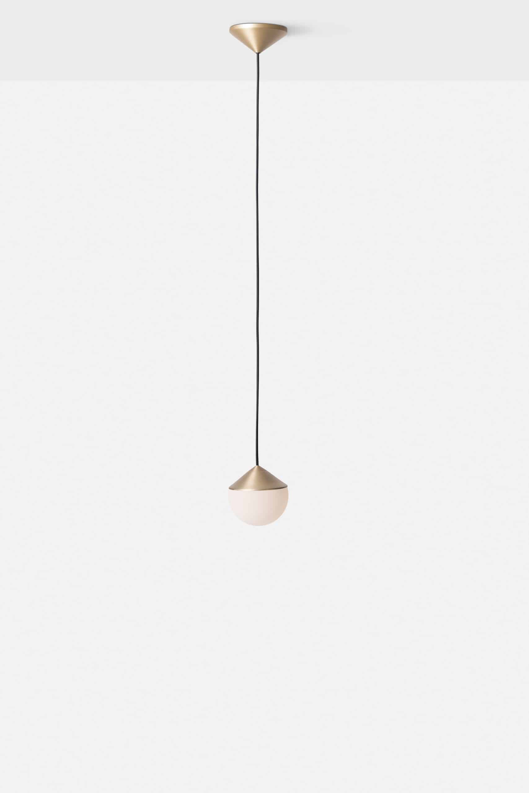Luminária de mesa com luz difusa. Base de alumínio com pintura líquida e verniz soft-touch (versões Off White e Off Black); latão escovado com verniz fosco; ou aço inox escovado nas opções natural ou com verniza preto. Difusor de vidro soprado com acabamento fosco. Cabo revestido de tecido. LED integrado.