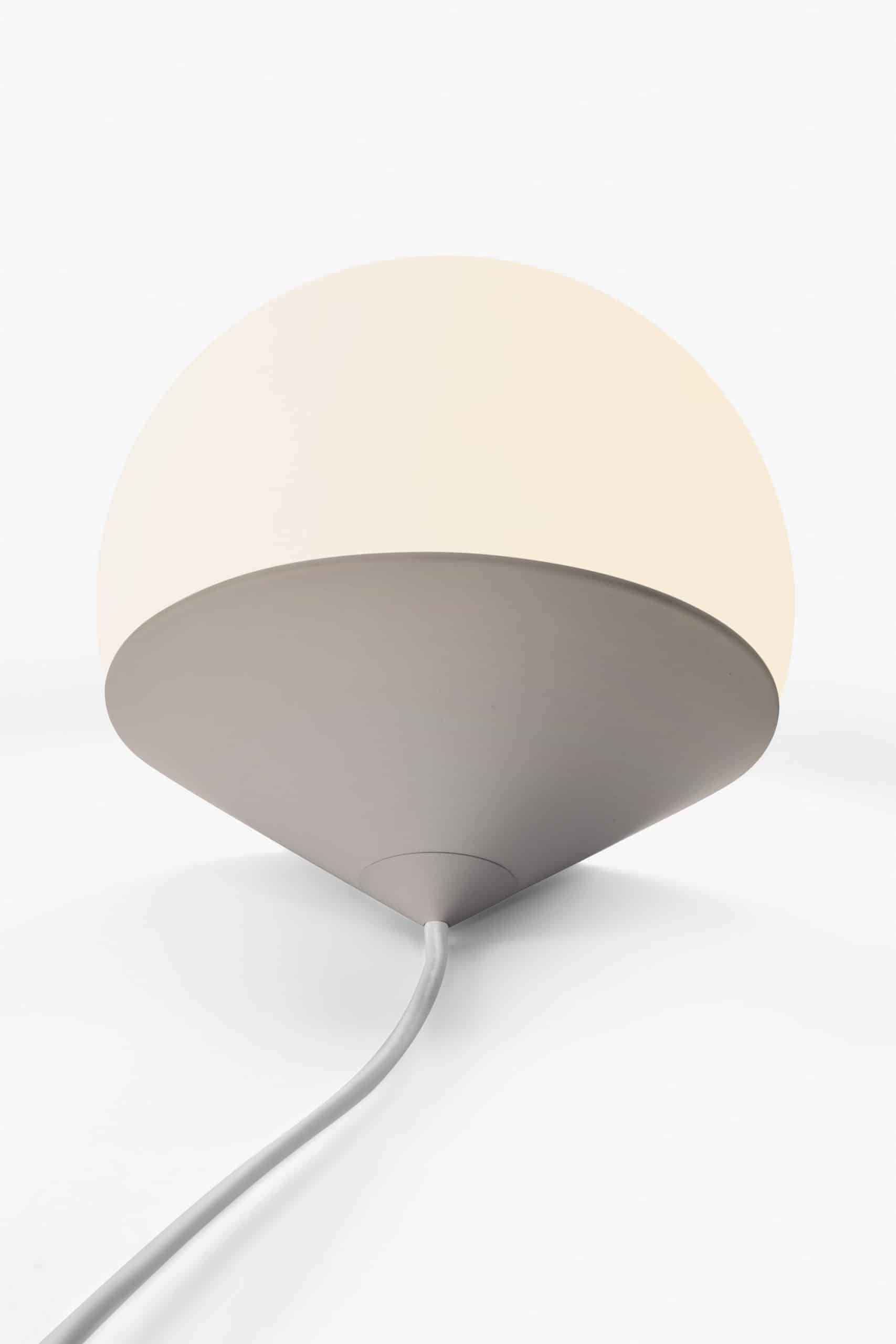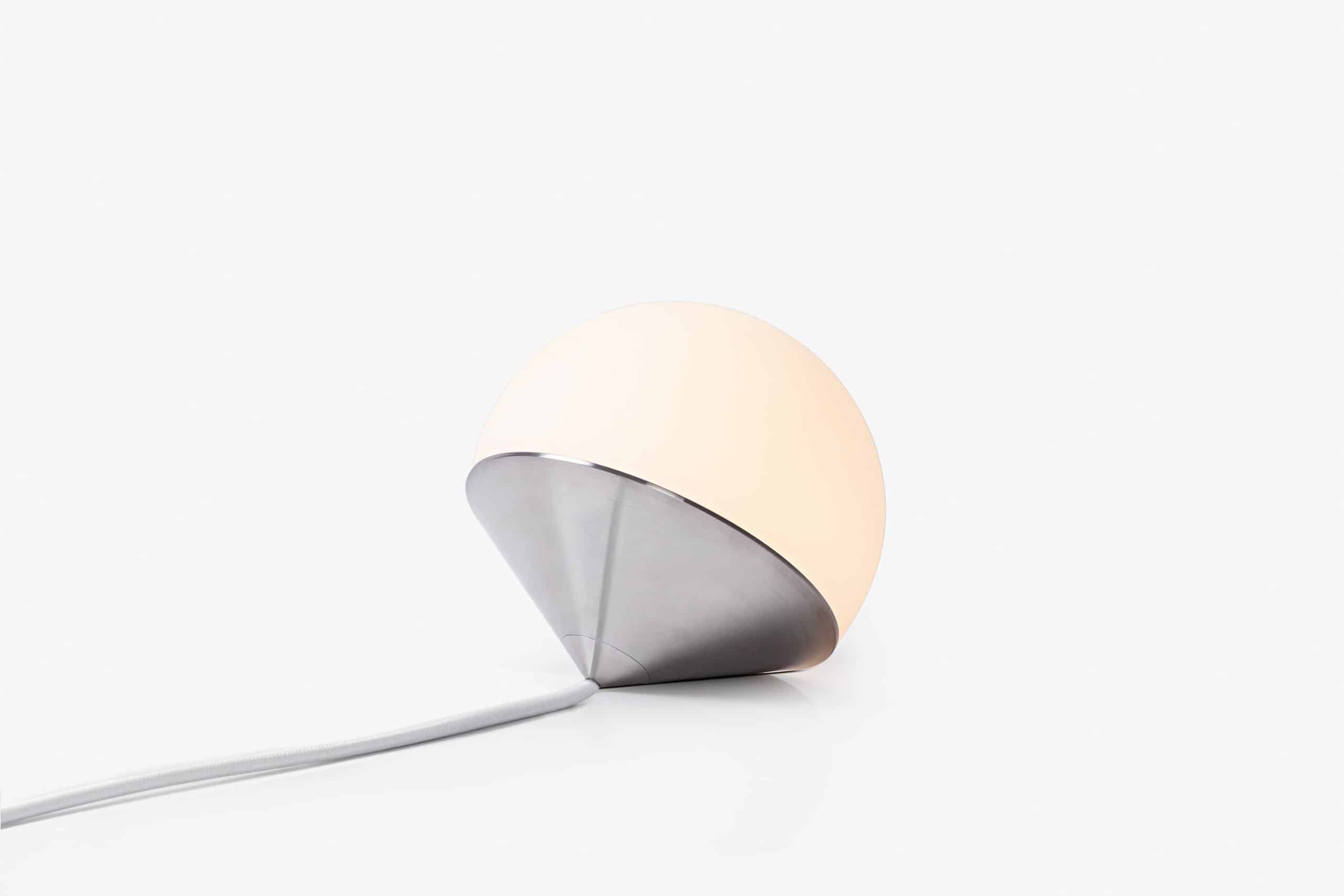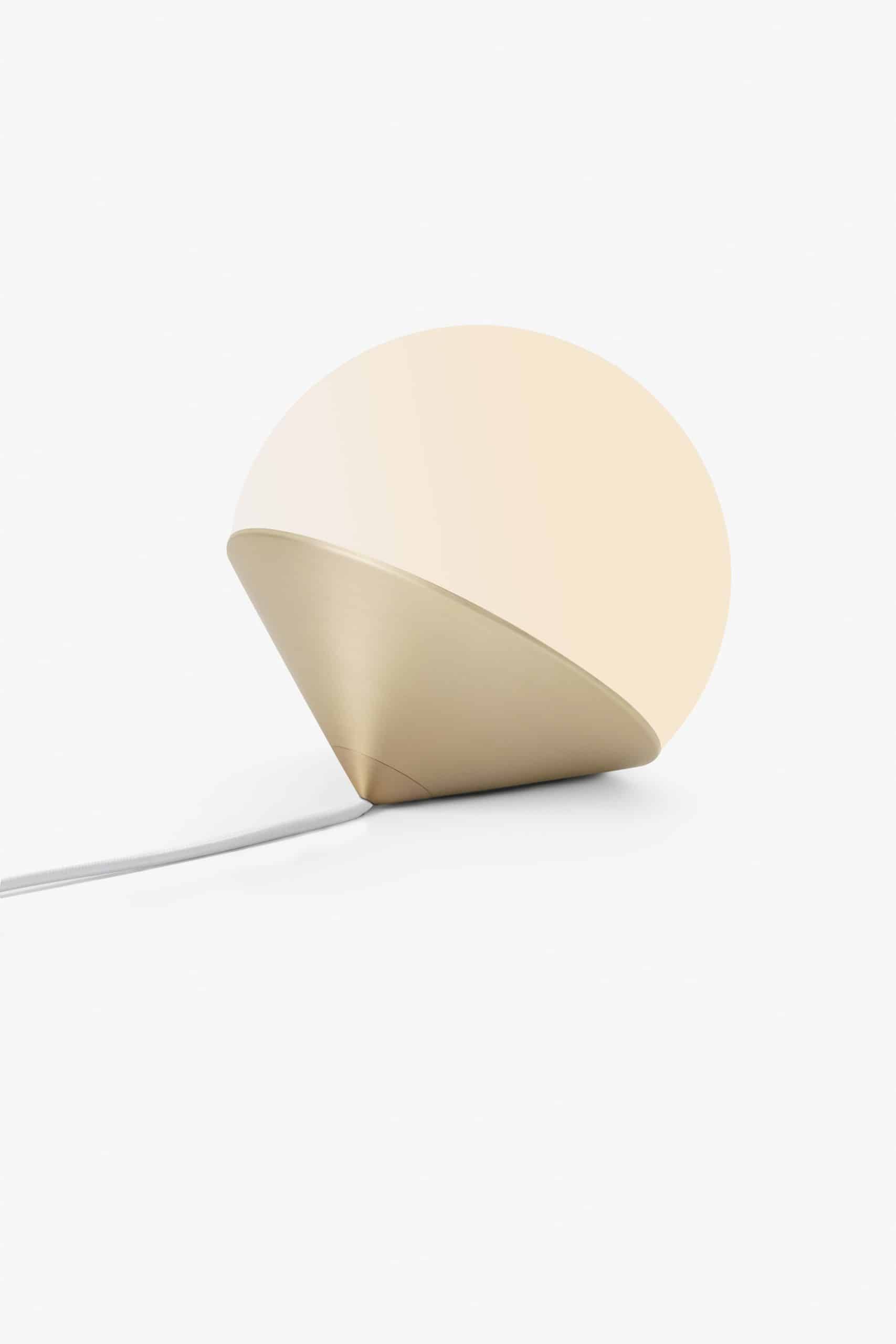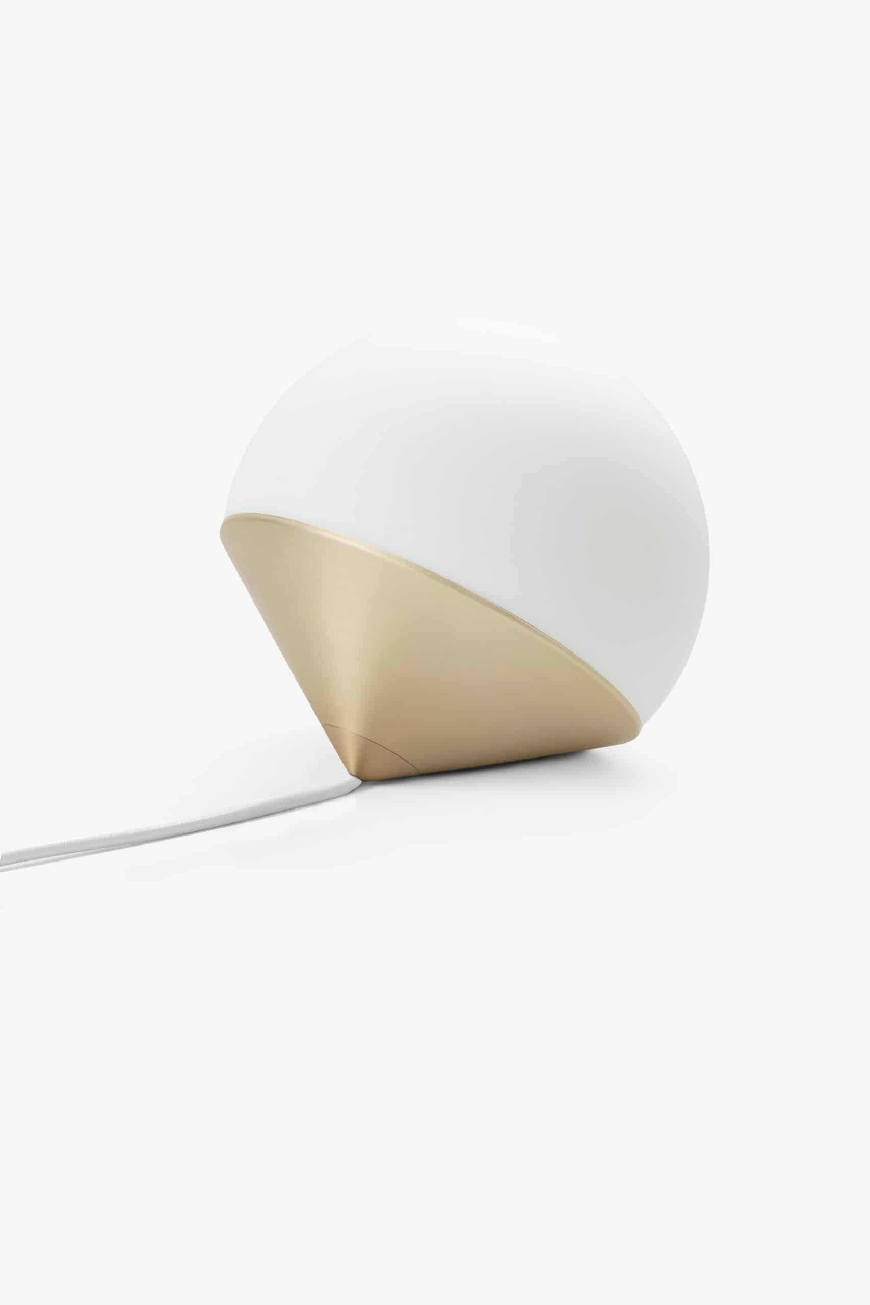 Luminária de mesa com luz difusa. Base de alumínio com pintura líquida e verniz soft-touch (versões Off White e Off Black); latão escovado com verniz fosco; ou aço inox escovado nas opções natural ou com verniza preto. Difusor de vidro soprado com acabamento fosco. Cabo revestido de tecido. LED integrado.