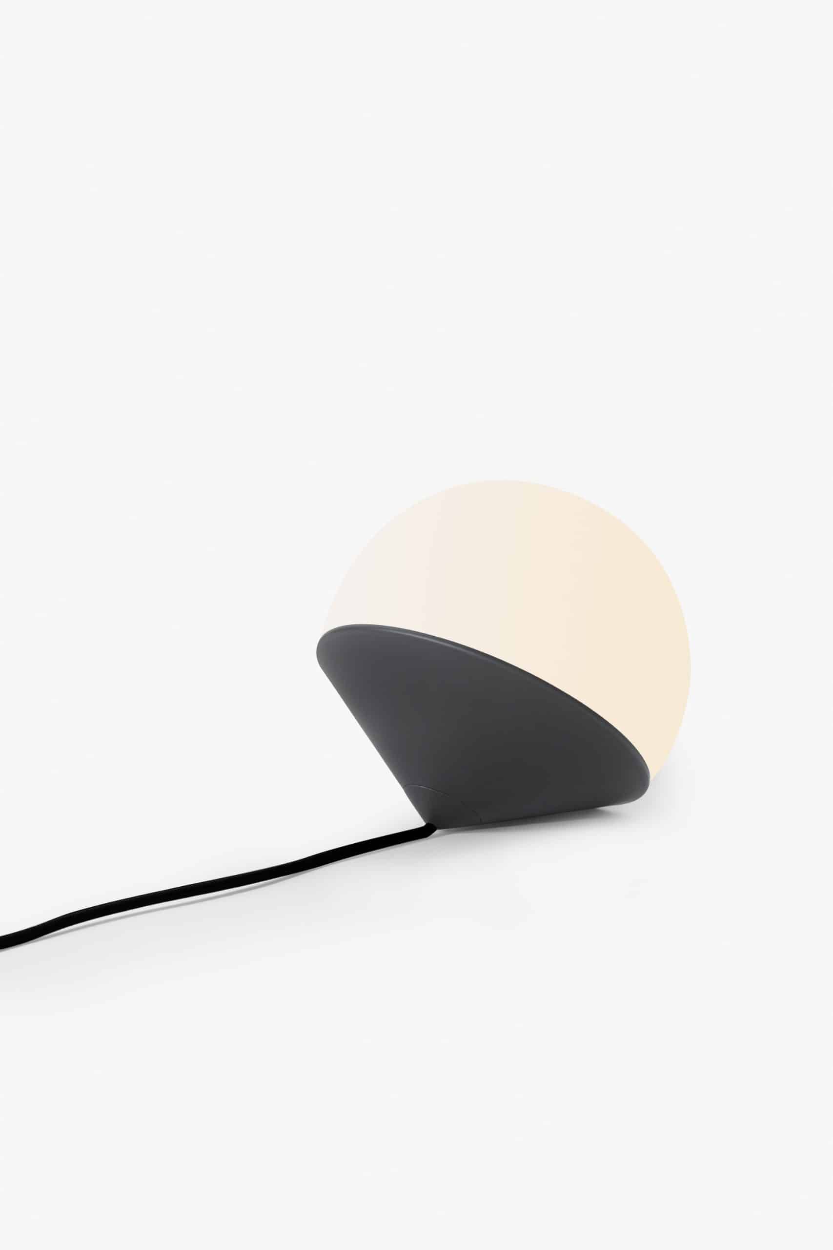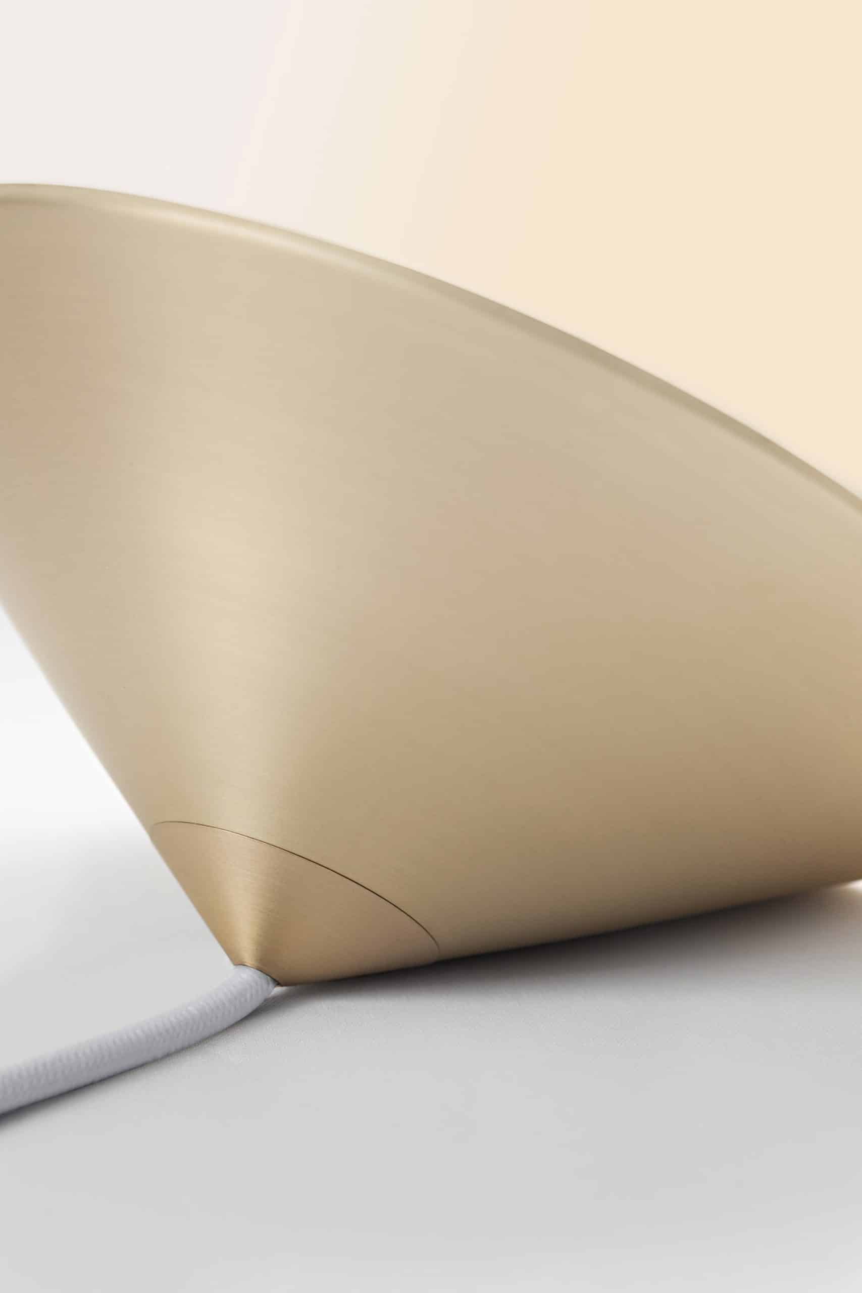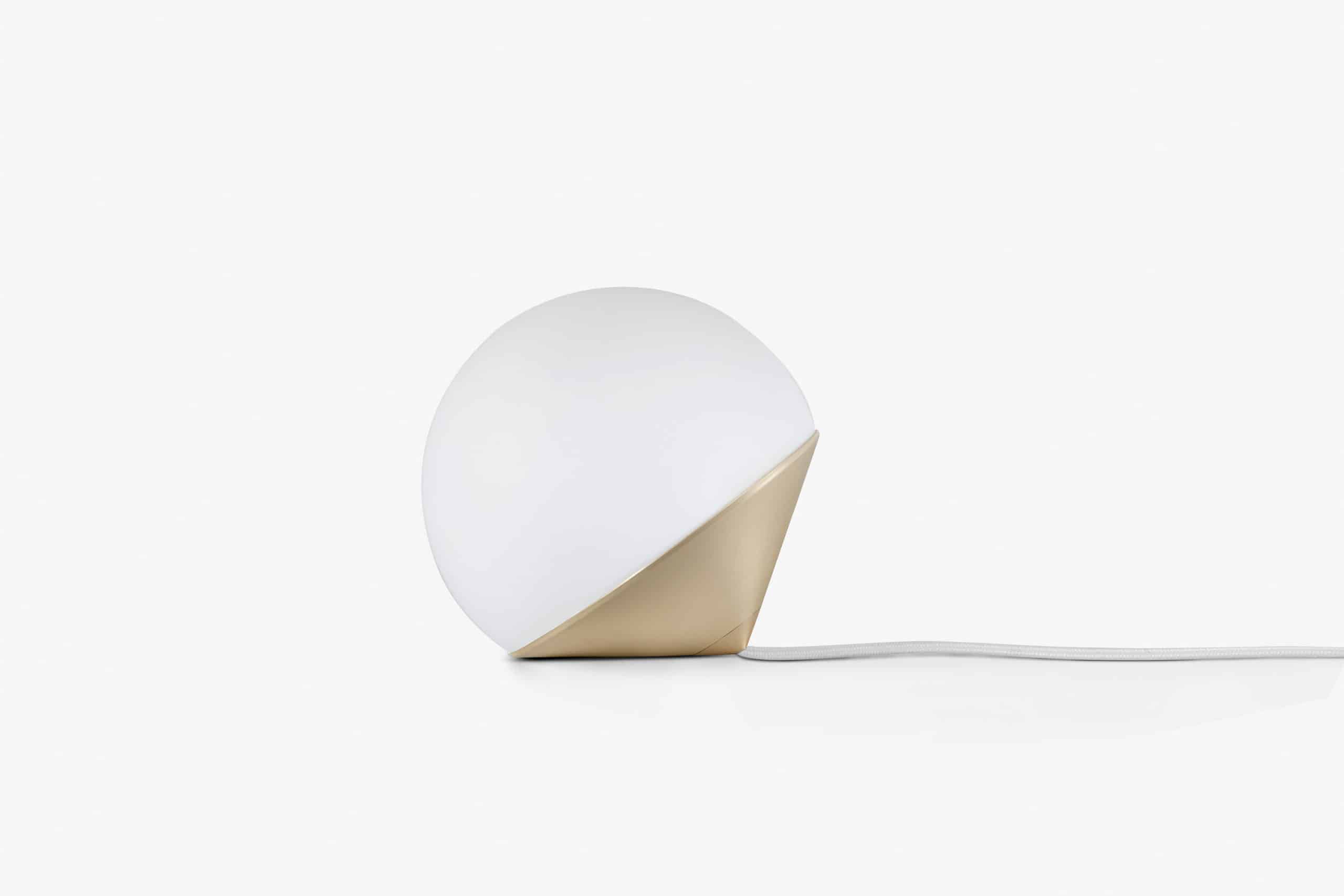 Luminária de mesa com luz difusa. Base de alumínio com pintura líquida e verniz soft-touch (versões Off White e Off Black); latão escovado com verniz fosco; ou aço inox escovado nas opções natural ou com verniza preto. Difusor de vidro soprado com acabamento fosco. Cabo revestido de tecido. LED integrado.