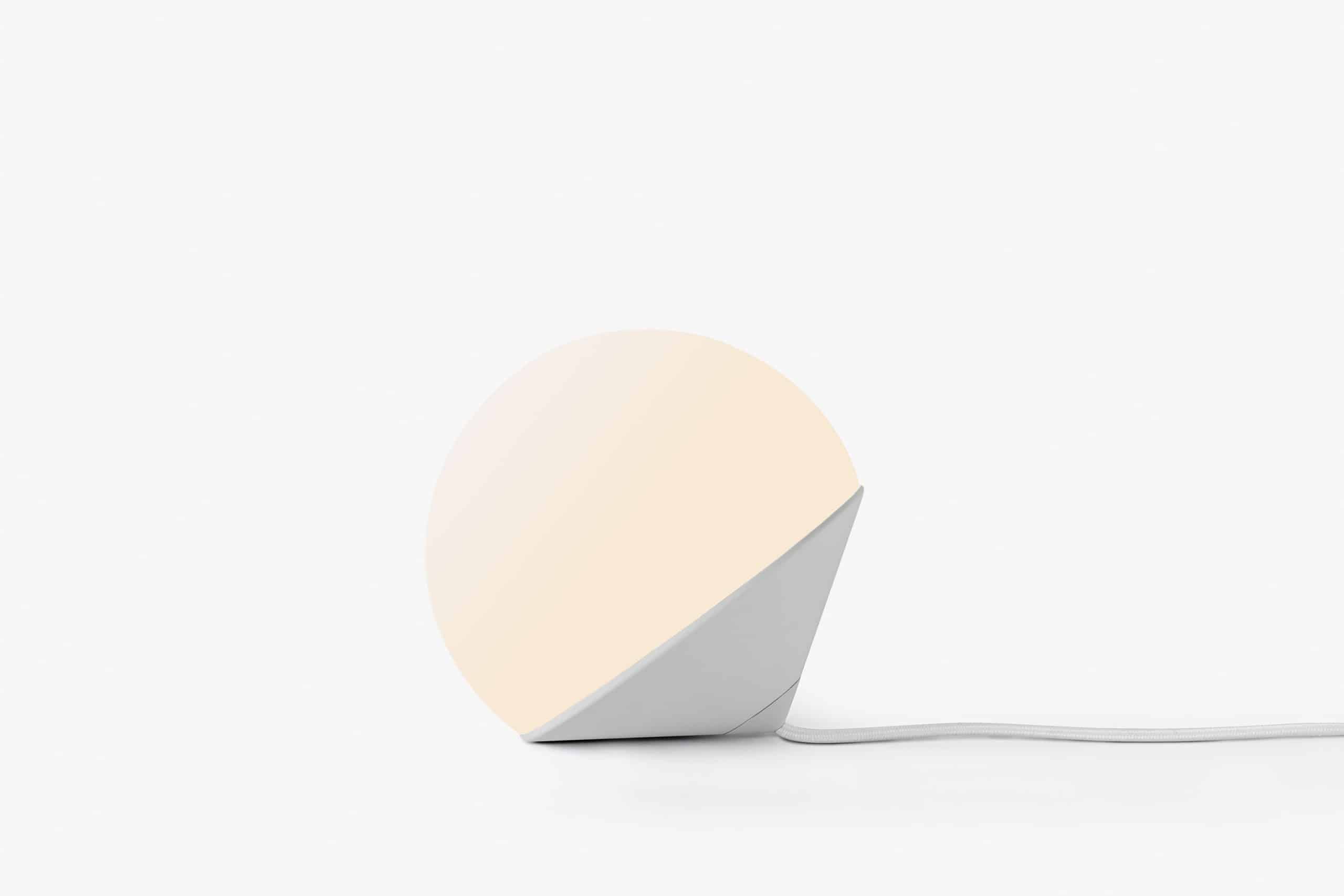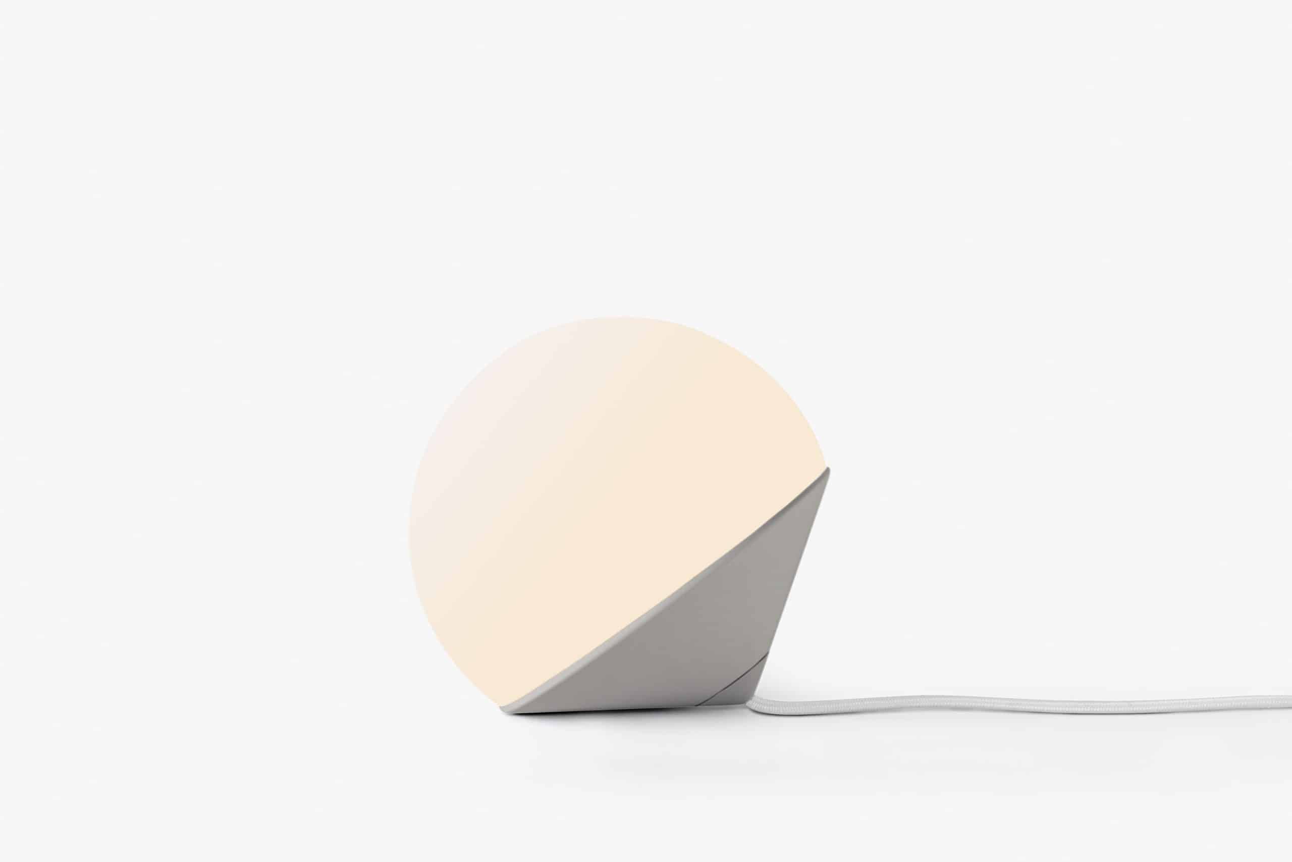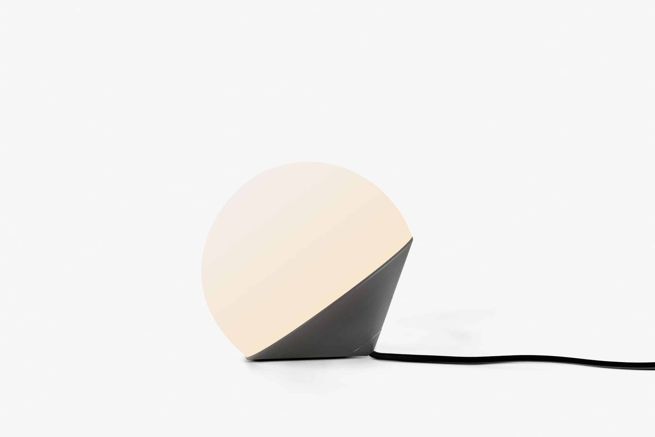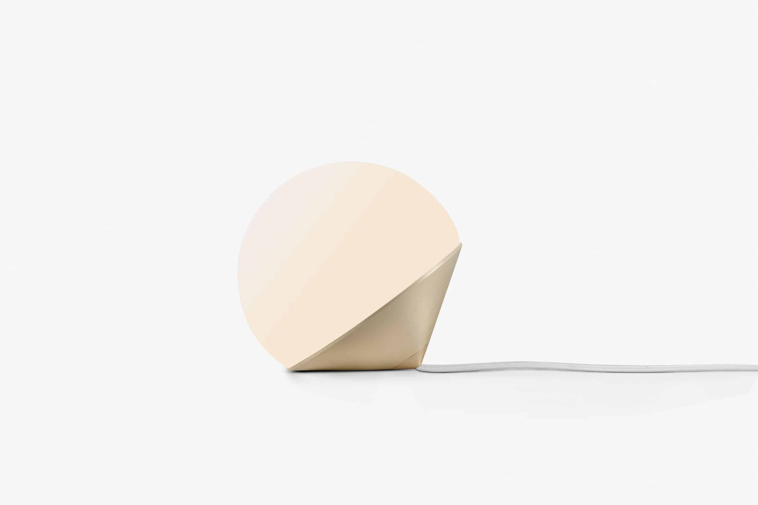 Luminária de mesa com luz difusa. Base de alumínio com pintura líquida e verniz soft-touch (versões Off White e Off Black); latão escovado com verniz fosco; ou aço inox escovado nas opções natural ou com verniza preto. Difusor de vidro soprado com acabamento fosco. Cabo revestido de tecido. LED integrado.