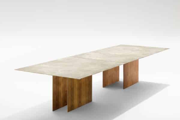 Na mesa de jantar Fio, a pedra ganha leveza, dando a impressão de flutuar, quando os elementos, tampo e pés, parecem não ter espessura.