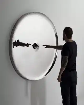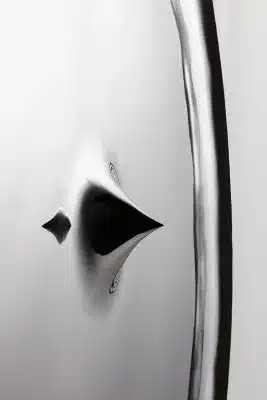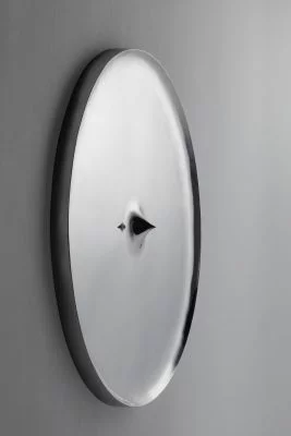 O painel Epicentro transgride a superfície vertical da parede que o sustenta assim como a imagem de quem se vê refletido. O elemento central distorce, incomoda e confunde assim como instiga e atrai o observador. A fluidez do material está presente, quando liberado pela alta temperatura, ao lembrar uma gota em suspensão.