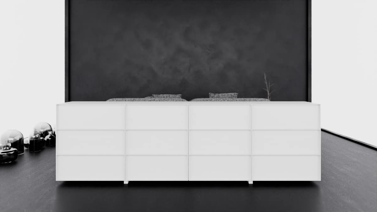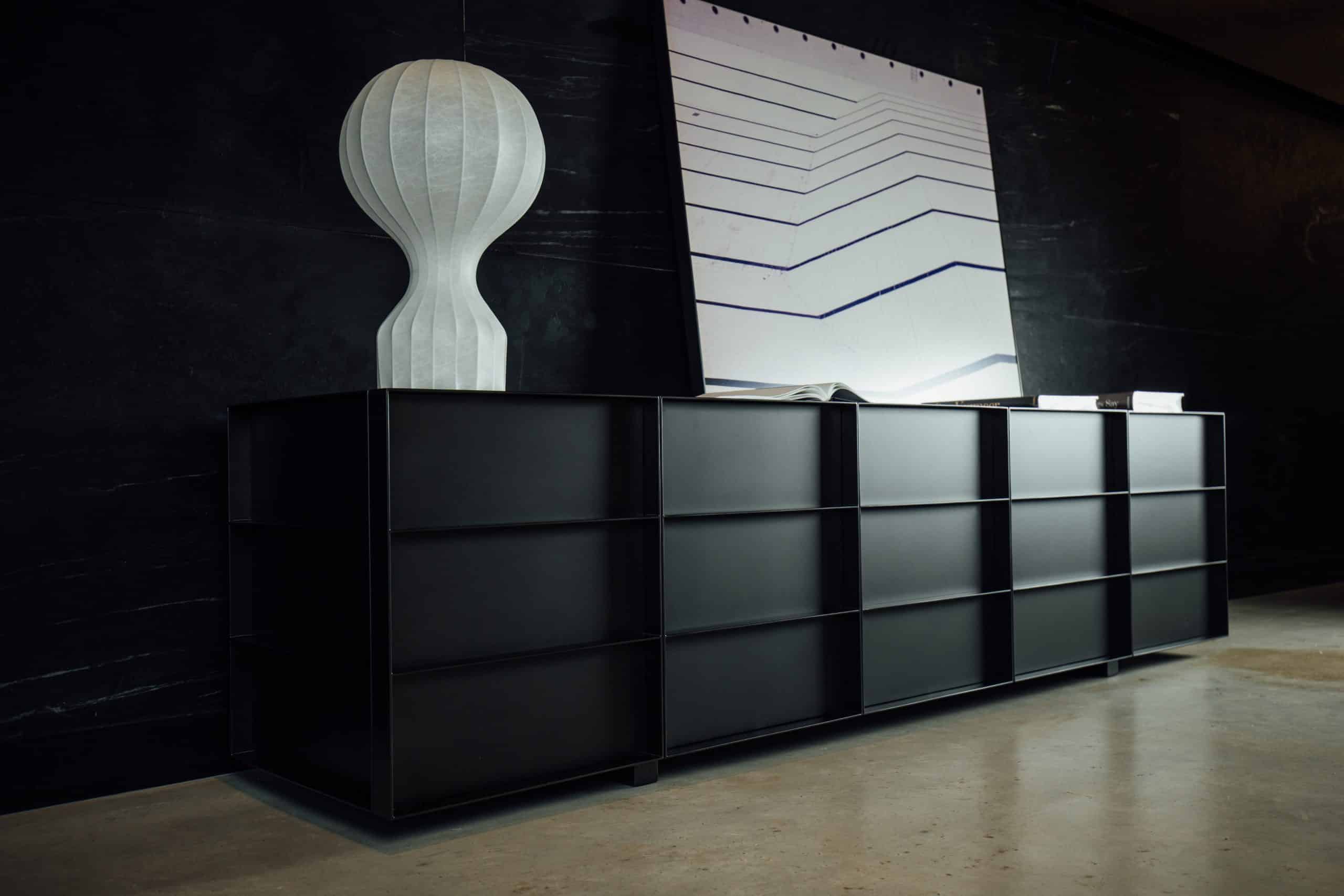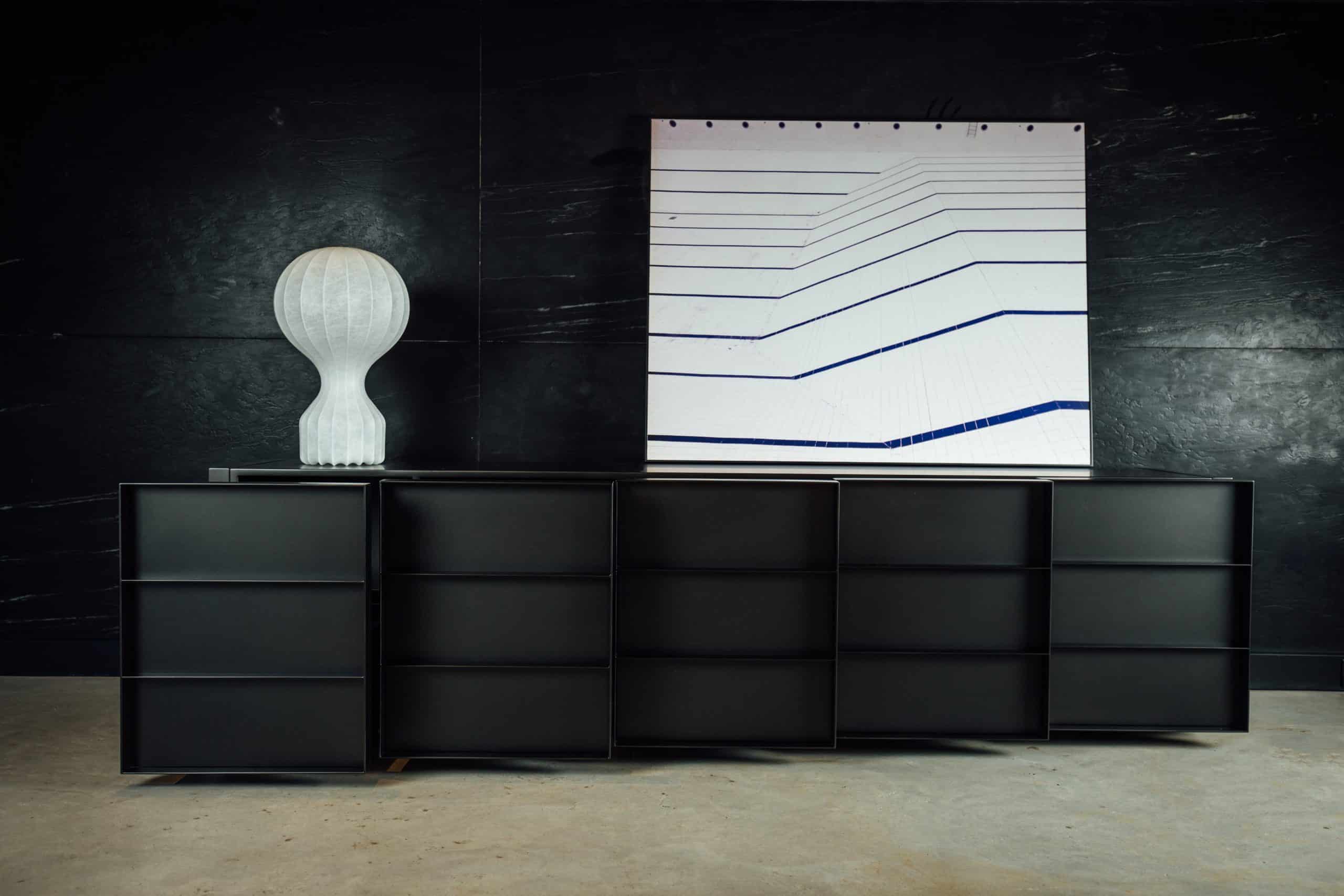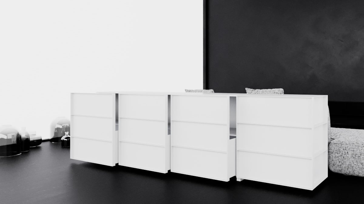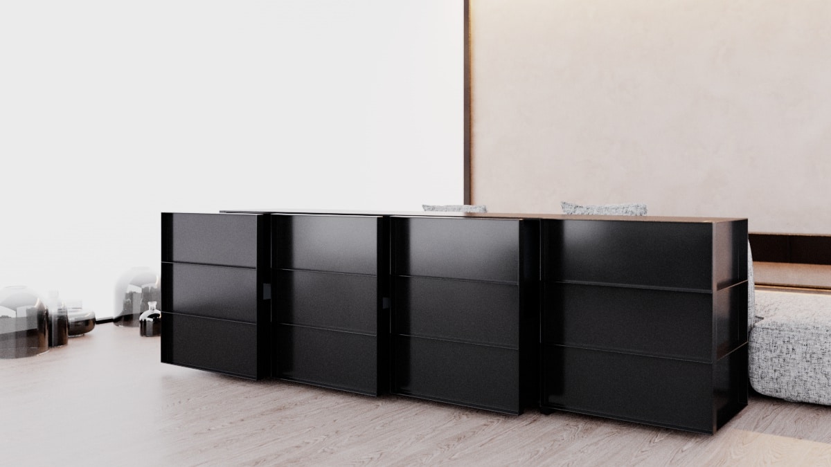 O design do aparador Container é inspirado nos containers industriais. Surpreendendo, ela possui gavetões em vez de portas, oferecendo uma organização impecável do espaço interno.