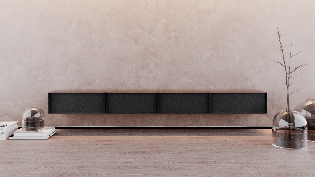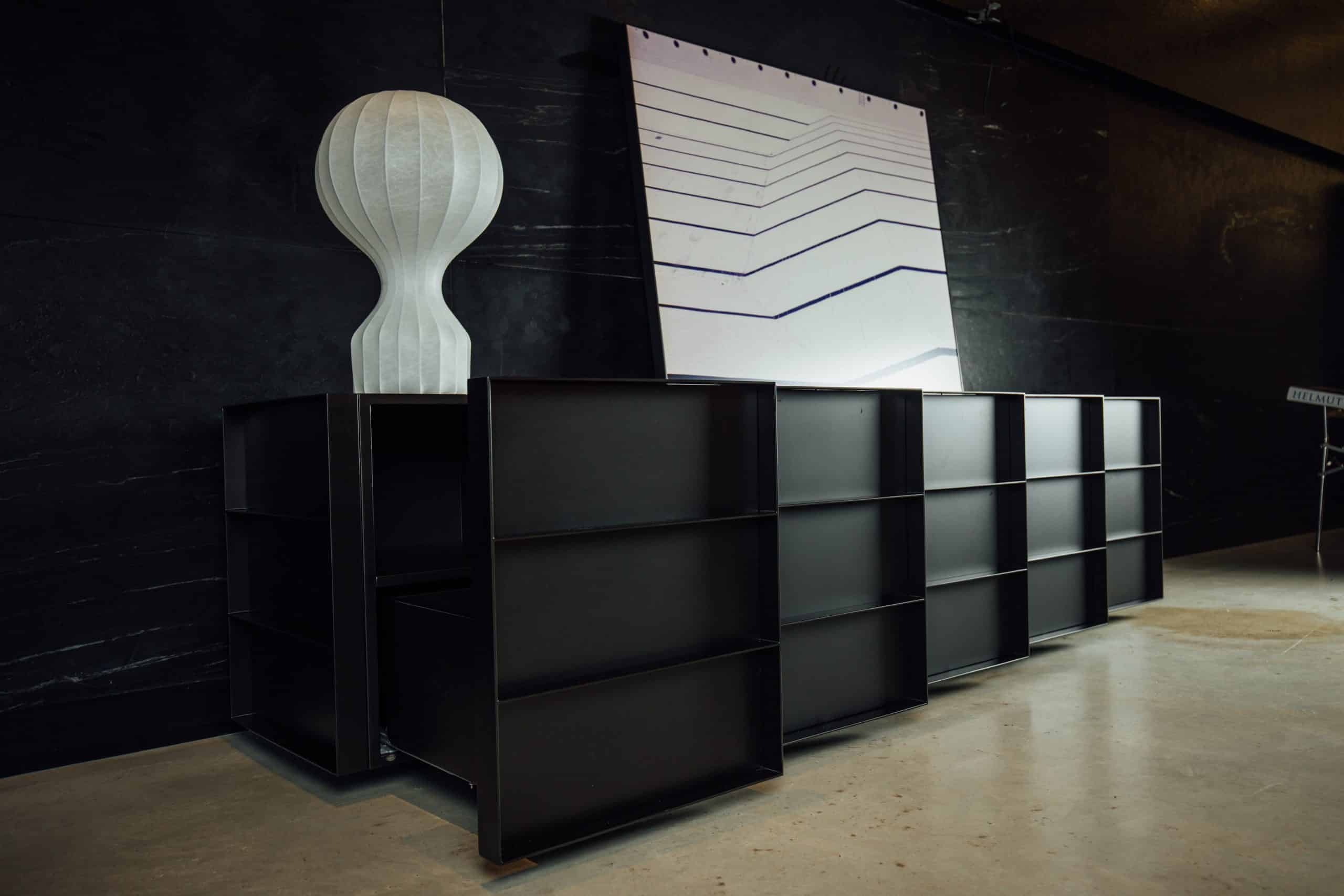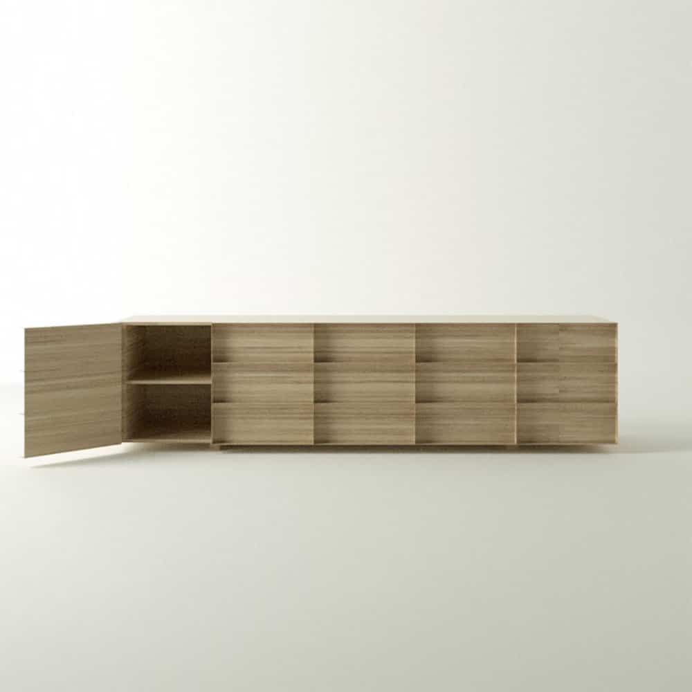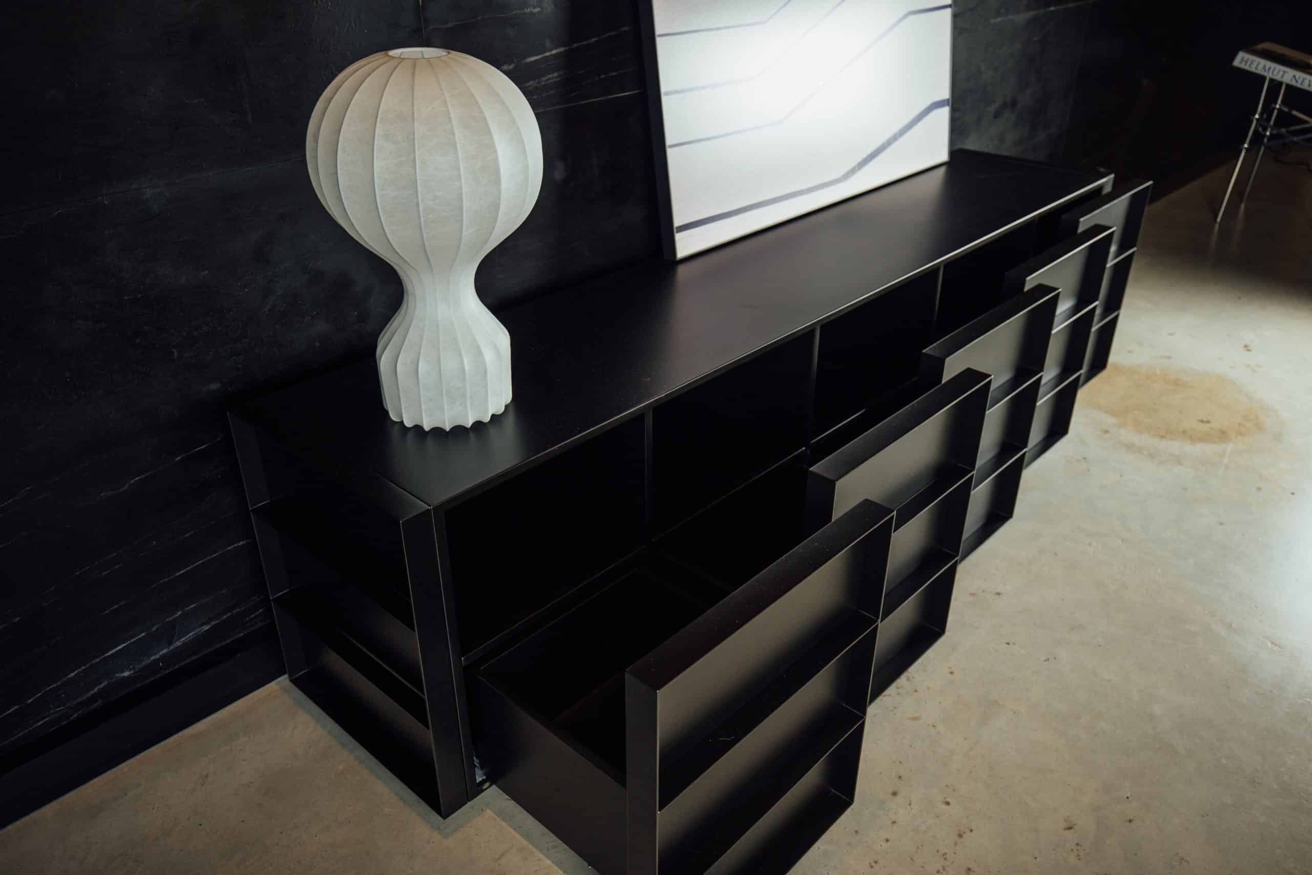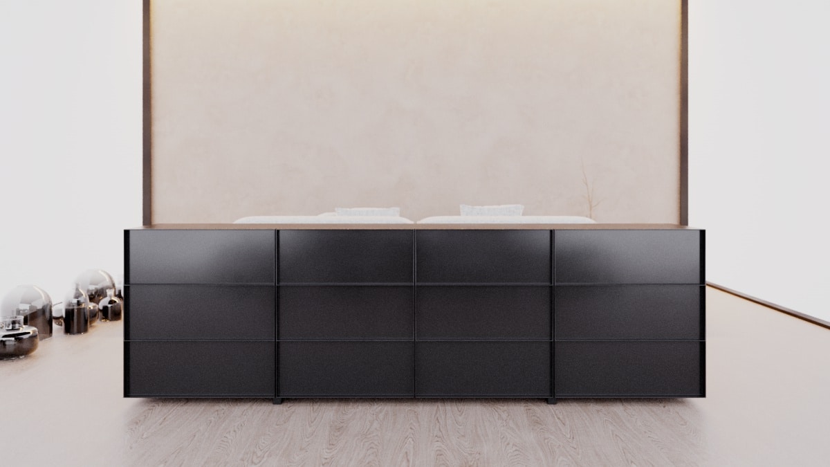 O design do aparador Container é inspirado nos containers industriais. Surpreendendo, ela possui gavetões em vez de portas, oferecendo uma organização impecável do espaço interno.