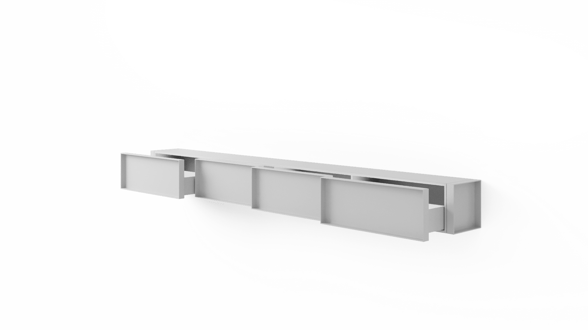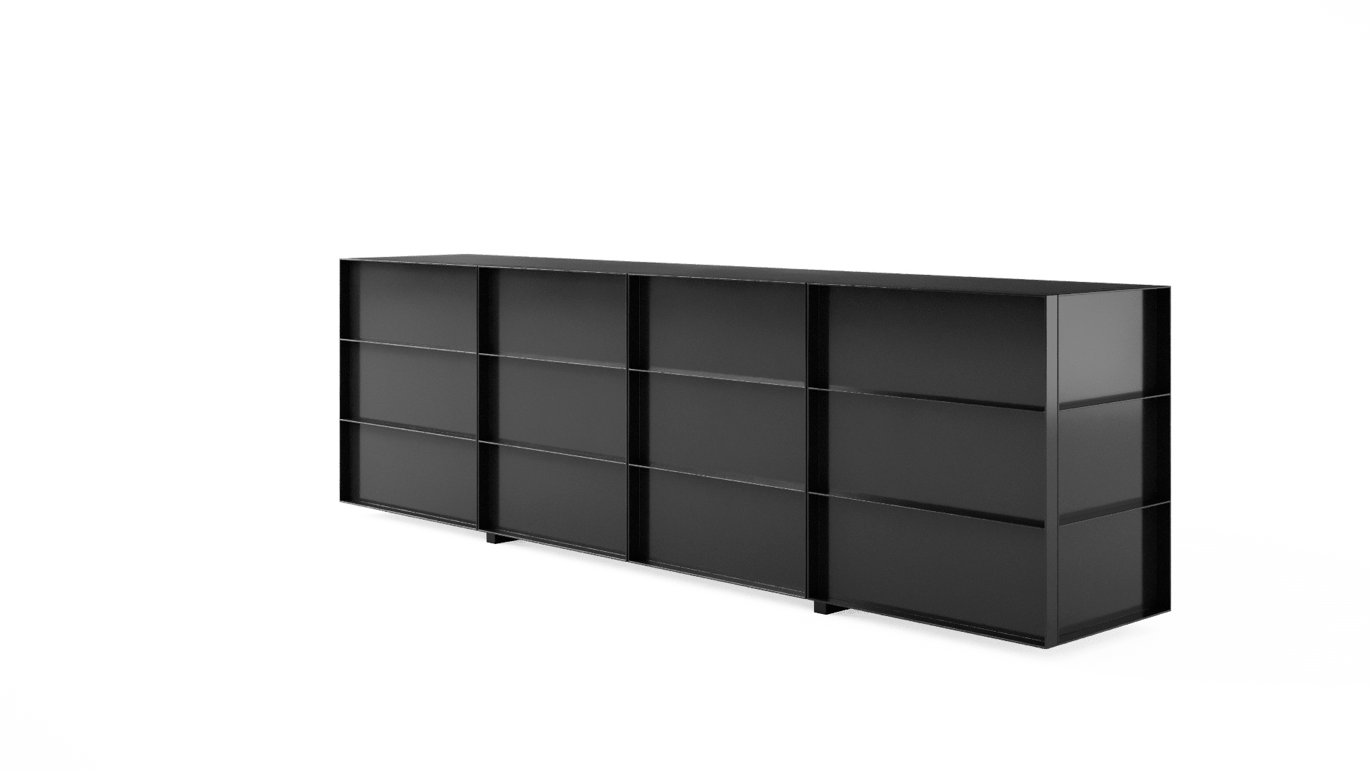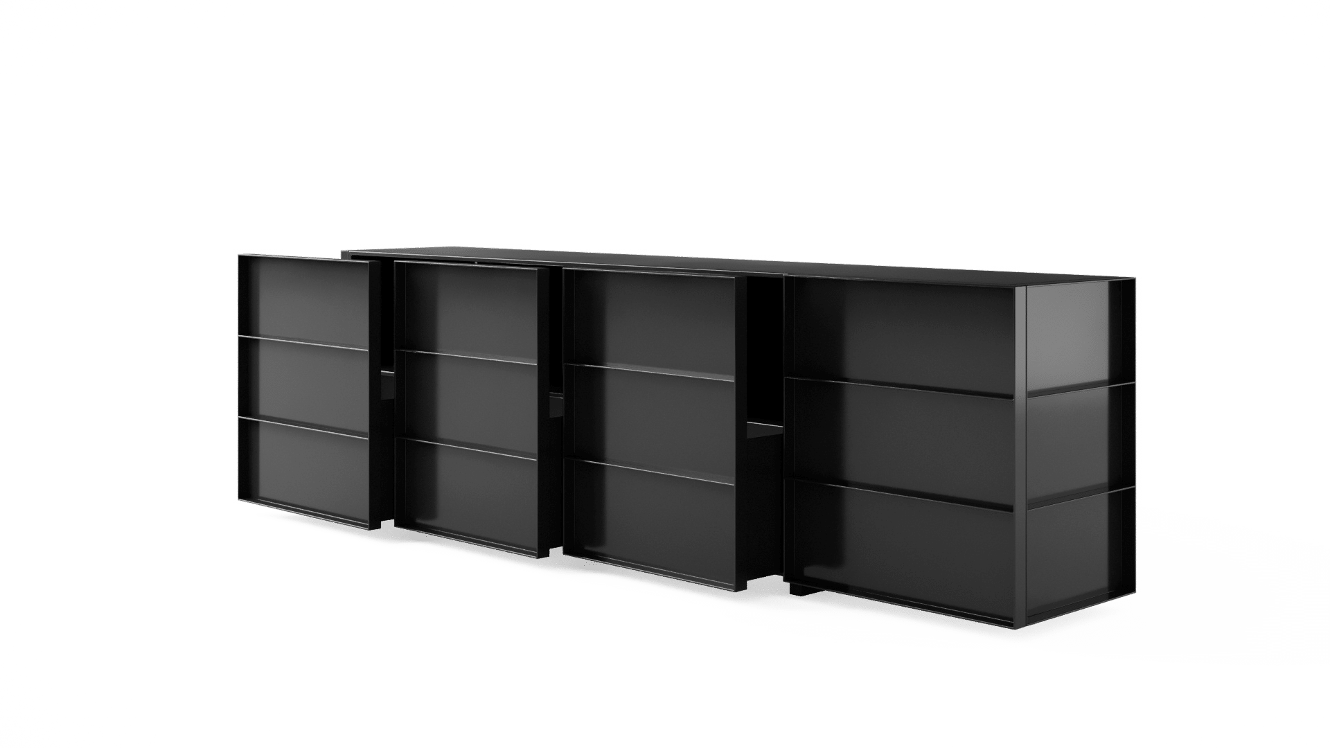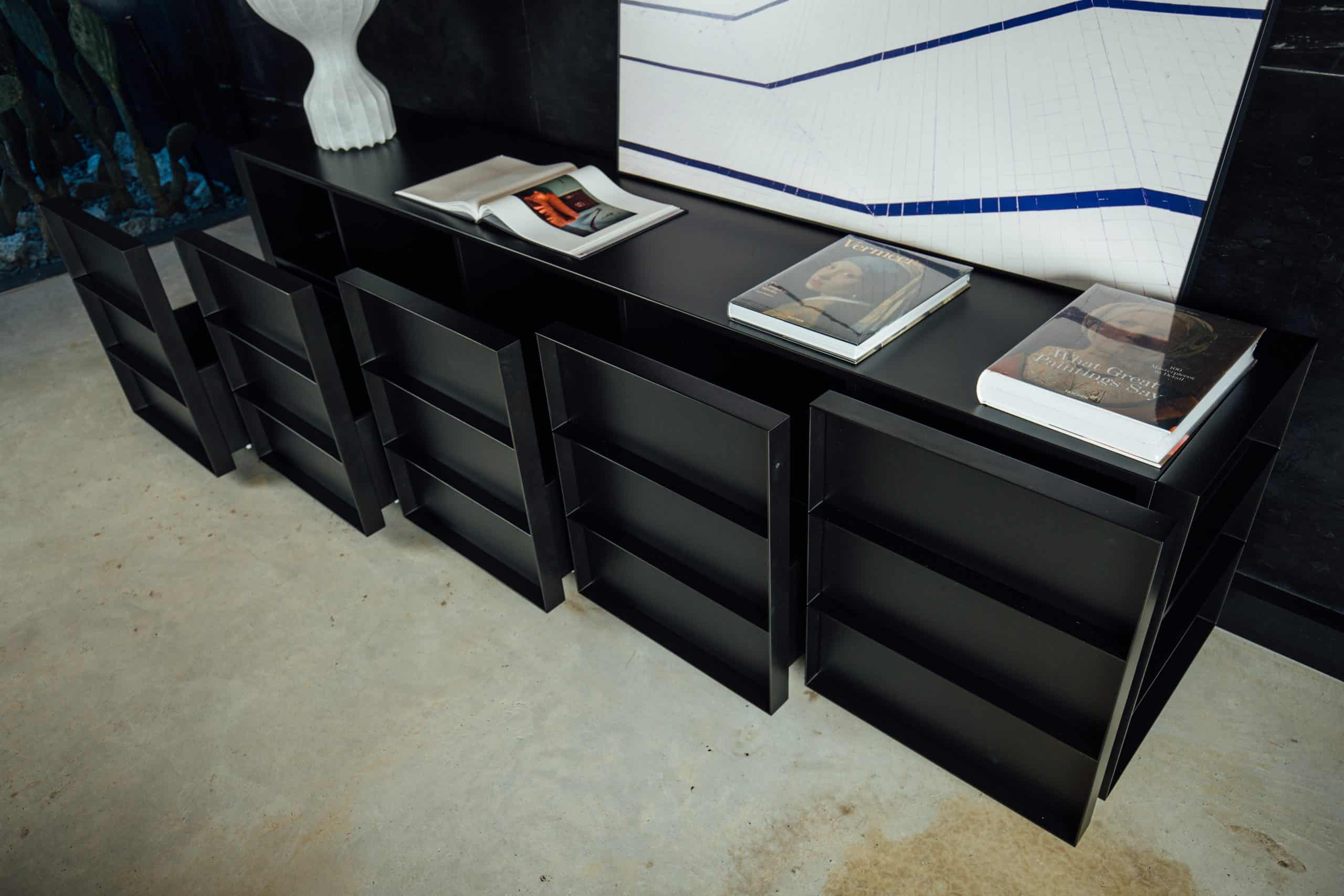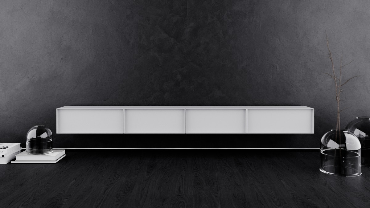 O design do aparador Container é inspirado nos containers industriais. Surpreendendo, ela possui gavetões em vez de portas, oferecendo uma organização impecável do espaço interno.