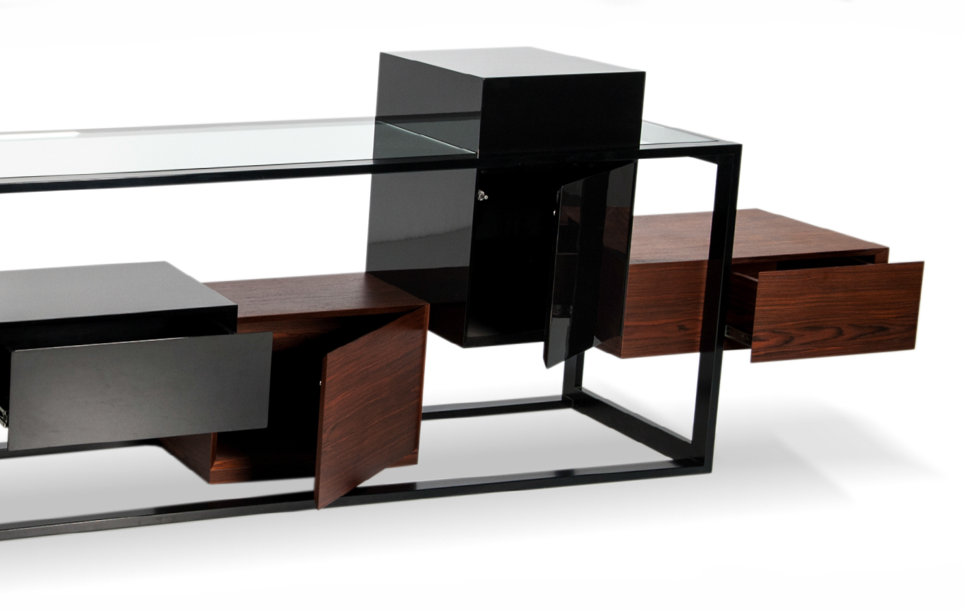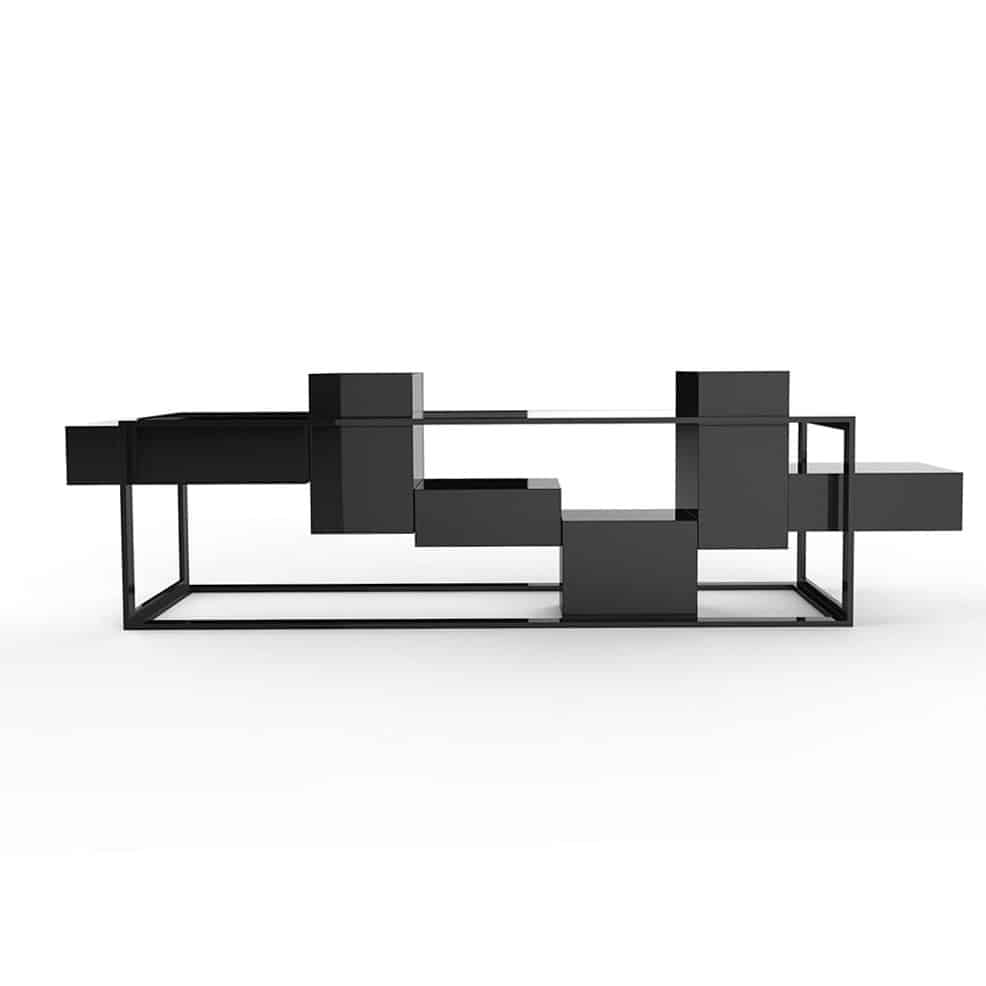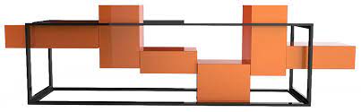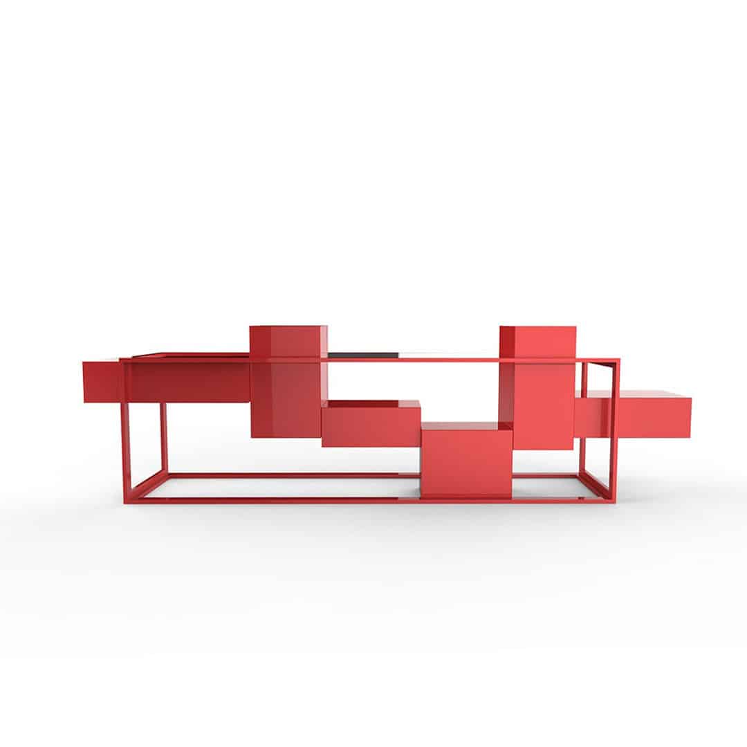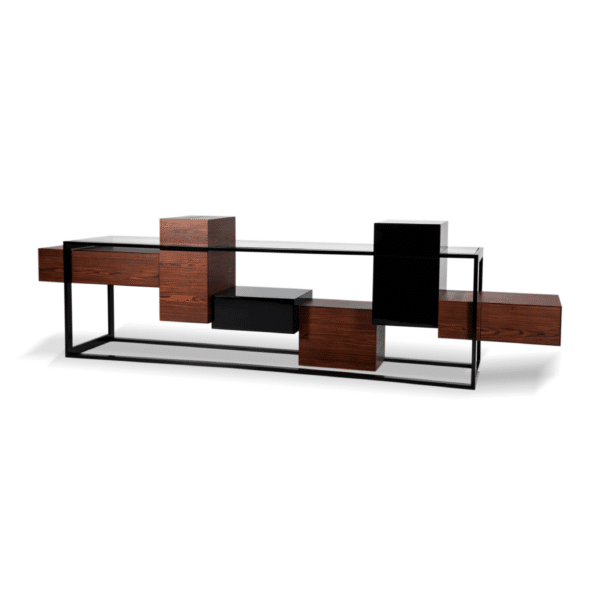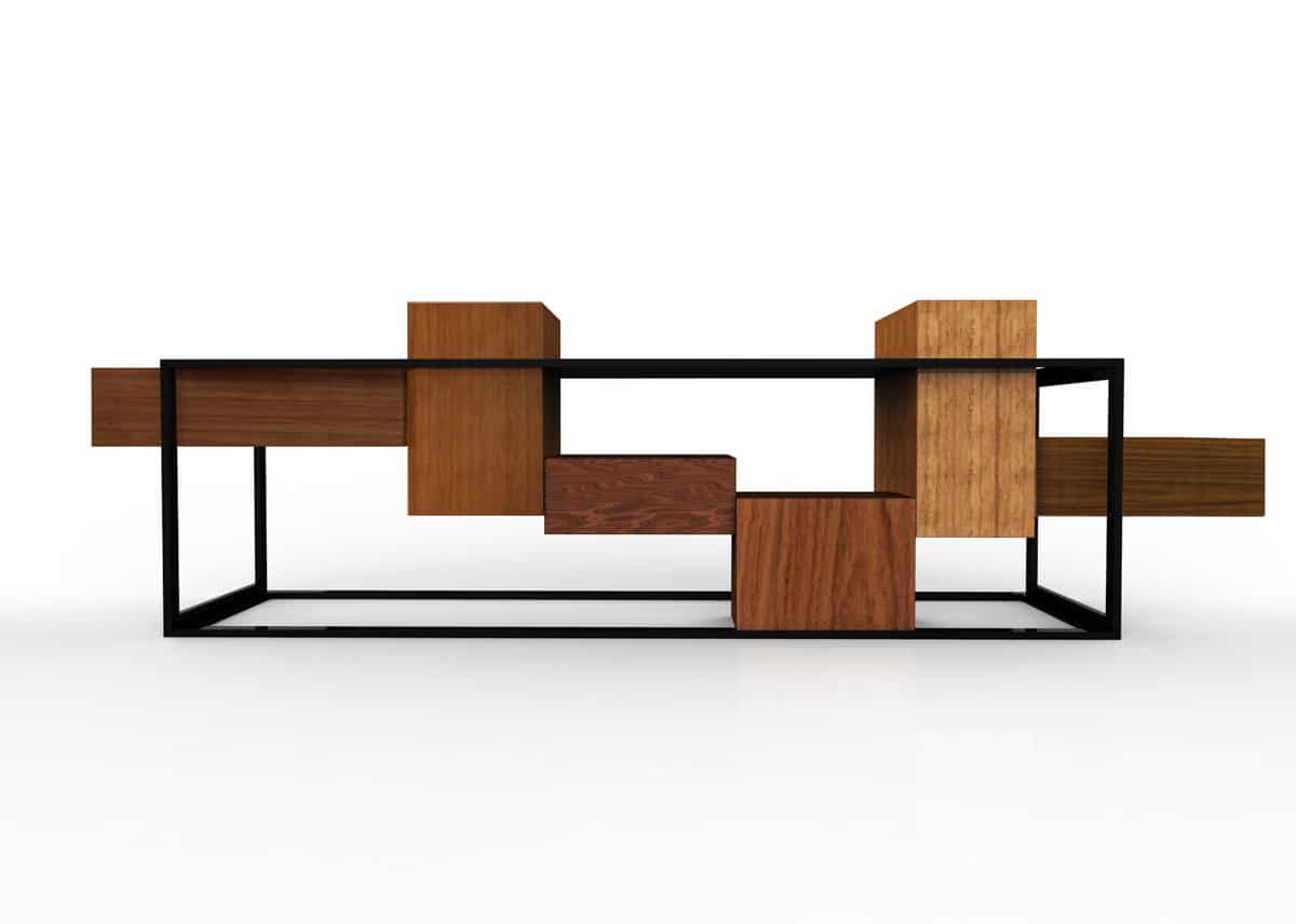 Com uma estrutura metálica sofisticada, essa peça envolve blocos de madeira que fazem uma alusão ao adorado jogo Tetris. O resultado é uma criação única, combinando elementos industriais e lúdicos.