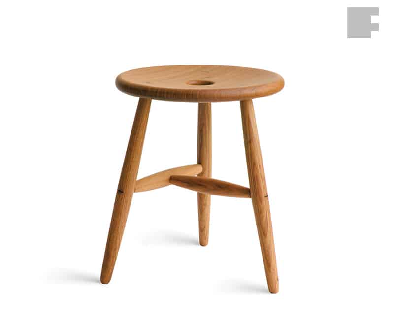 Banco simples e leve construído somente com peças torneadas: assento, três pés e duas travessas.