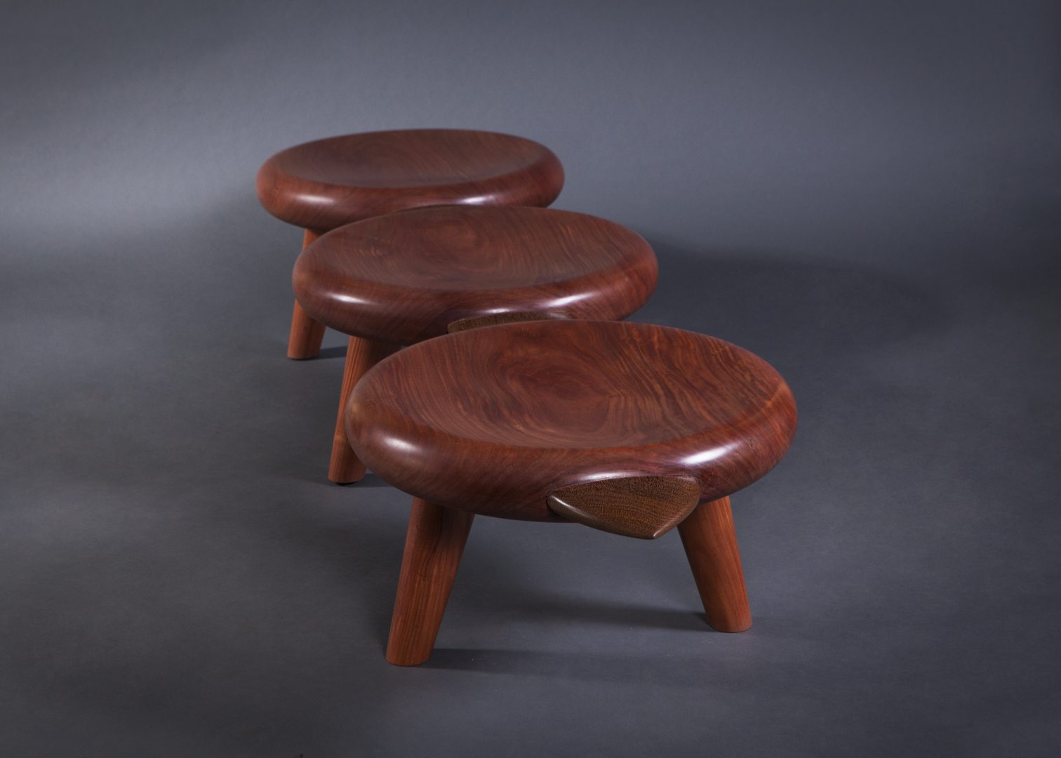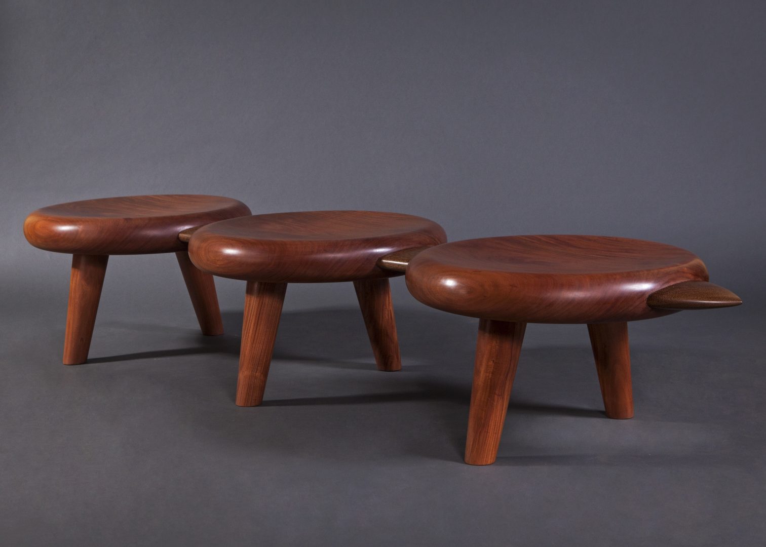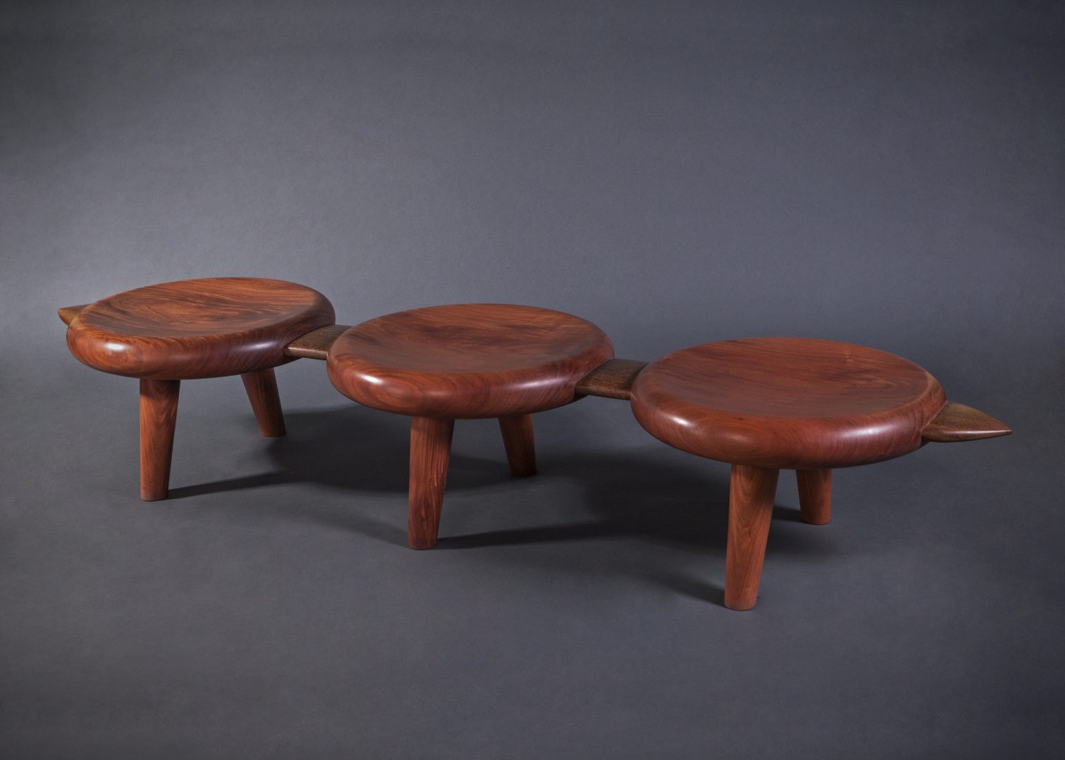 São três grandes discos torneados a mão, atravessados por uma seta de madeira Sucupira.