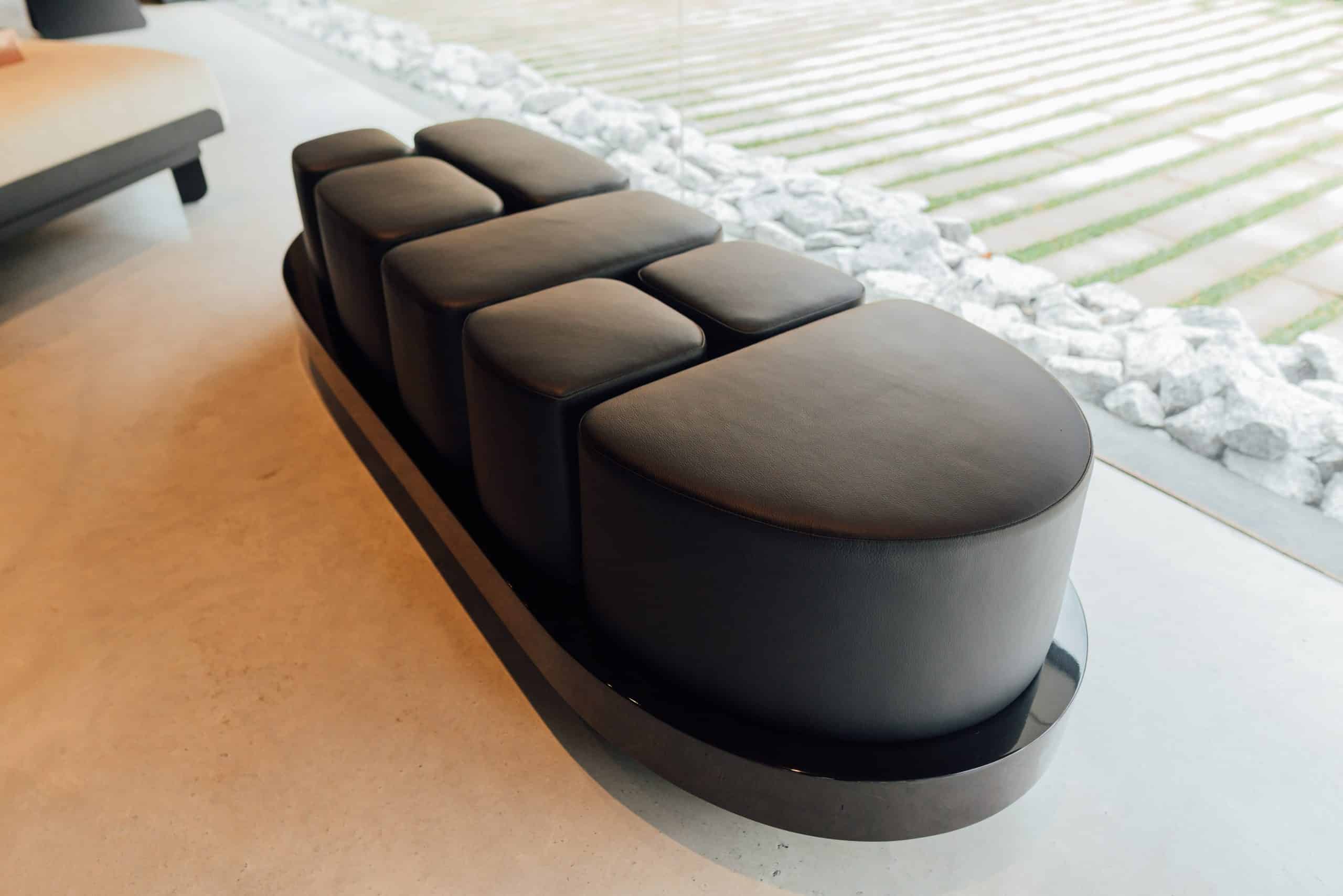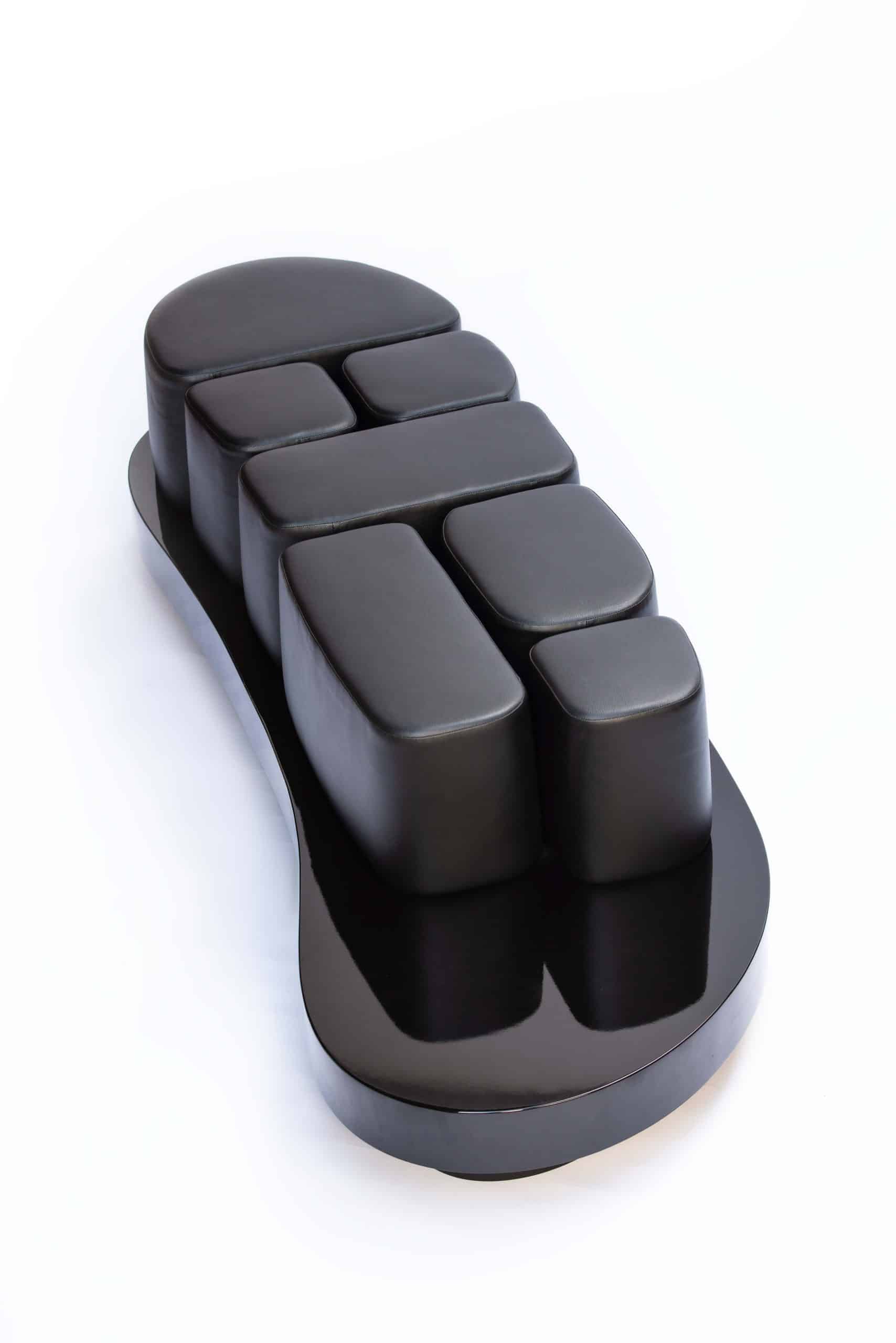 Lançado em 1970, o calçado Kichute marcou a vida de muitos brasileiros com sua resistência e design inovador. Em sua homenagem, nasceu o banco Kichute. Sua base possui o formato do calçado, enquanto os gomos em couro remetem às travas da chuteira.