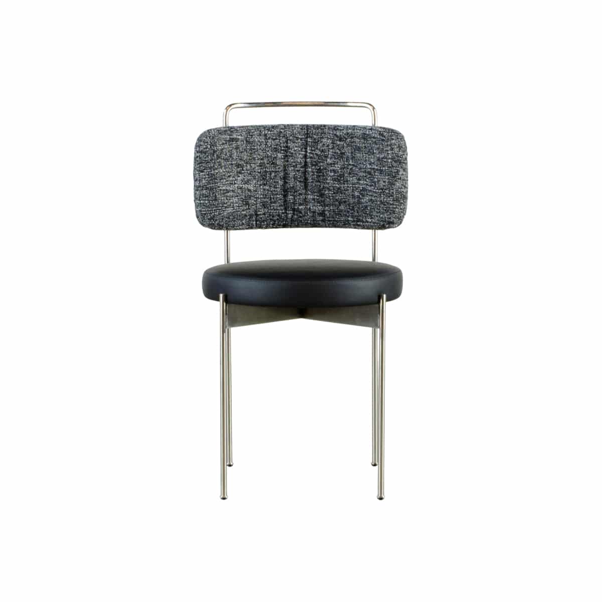 Cadeira de braços definida pela continuidade entre o encosto curvo e os apoios laterais, criando um volume envolvente de perfil orgânico. A estrutura metálica esguia sustenta o corpo estofado, resultando em uma peça que equilibra densidade visual e leveza estrutural com rigor geométrico.