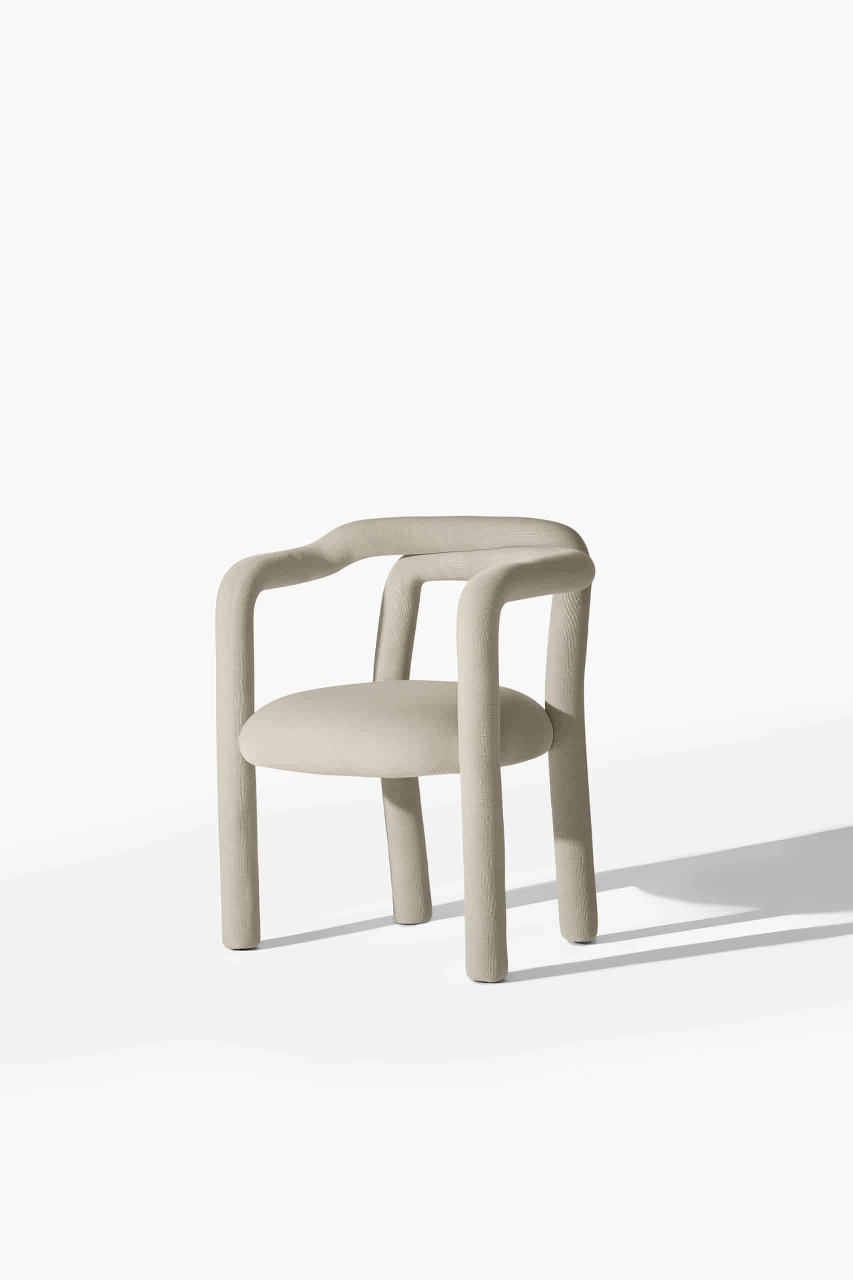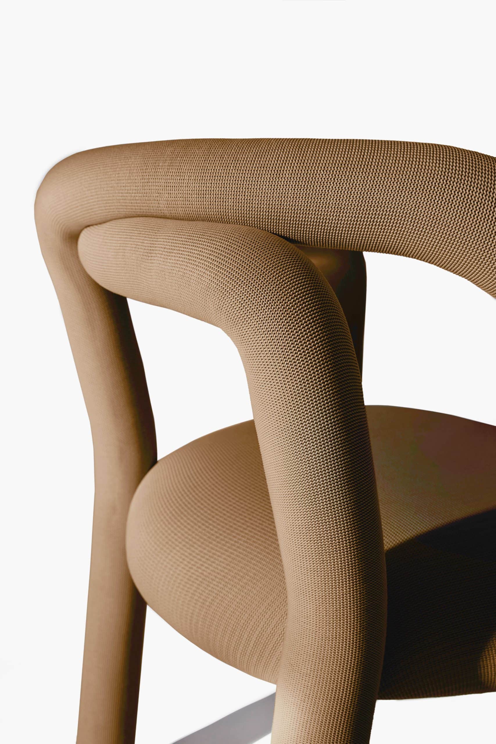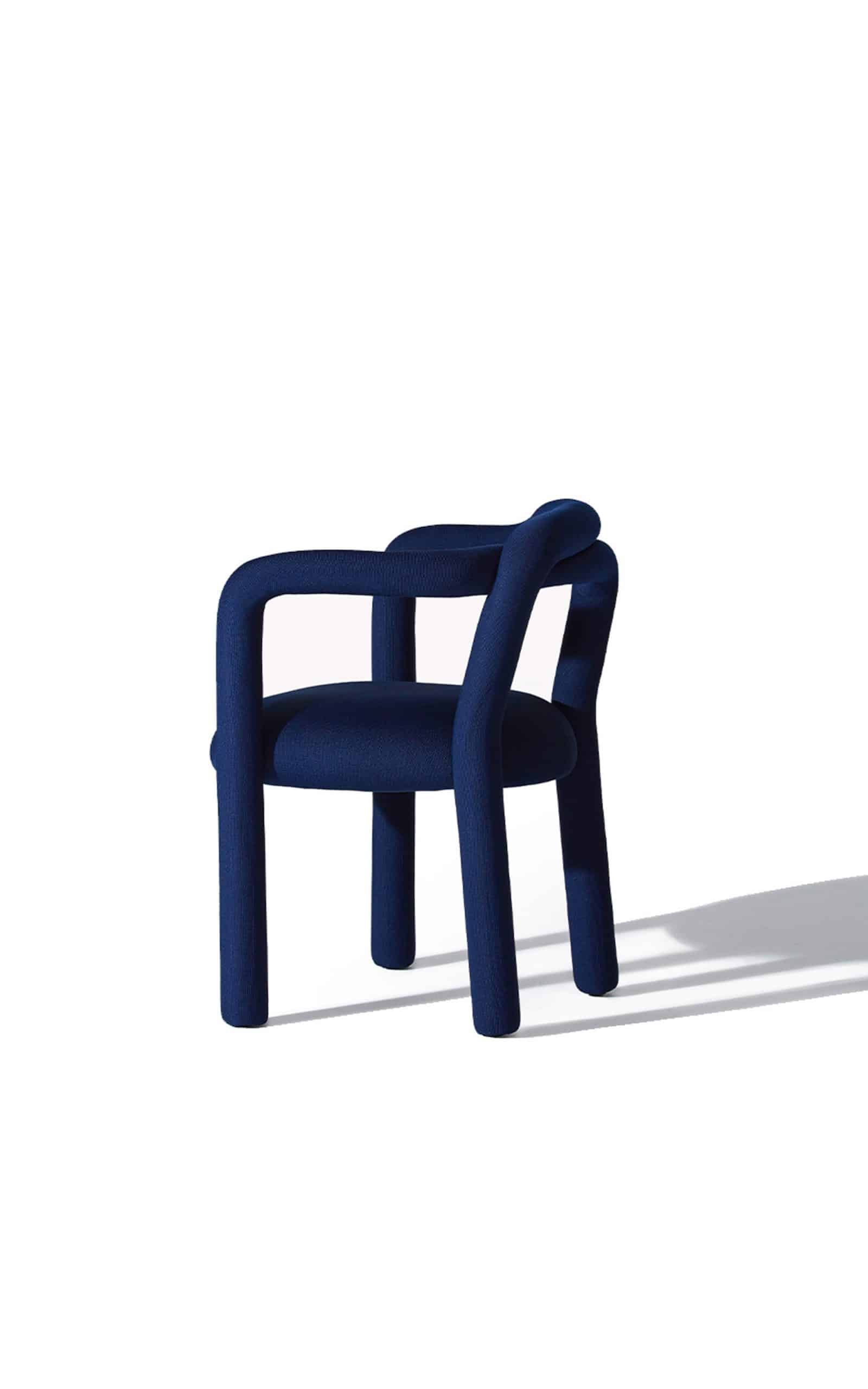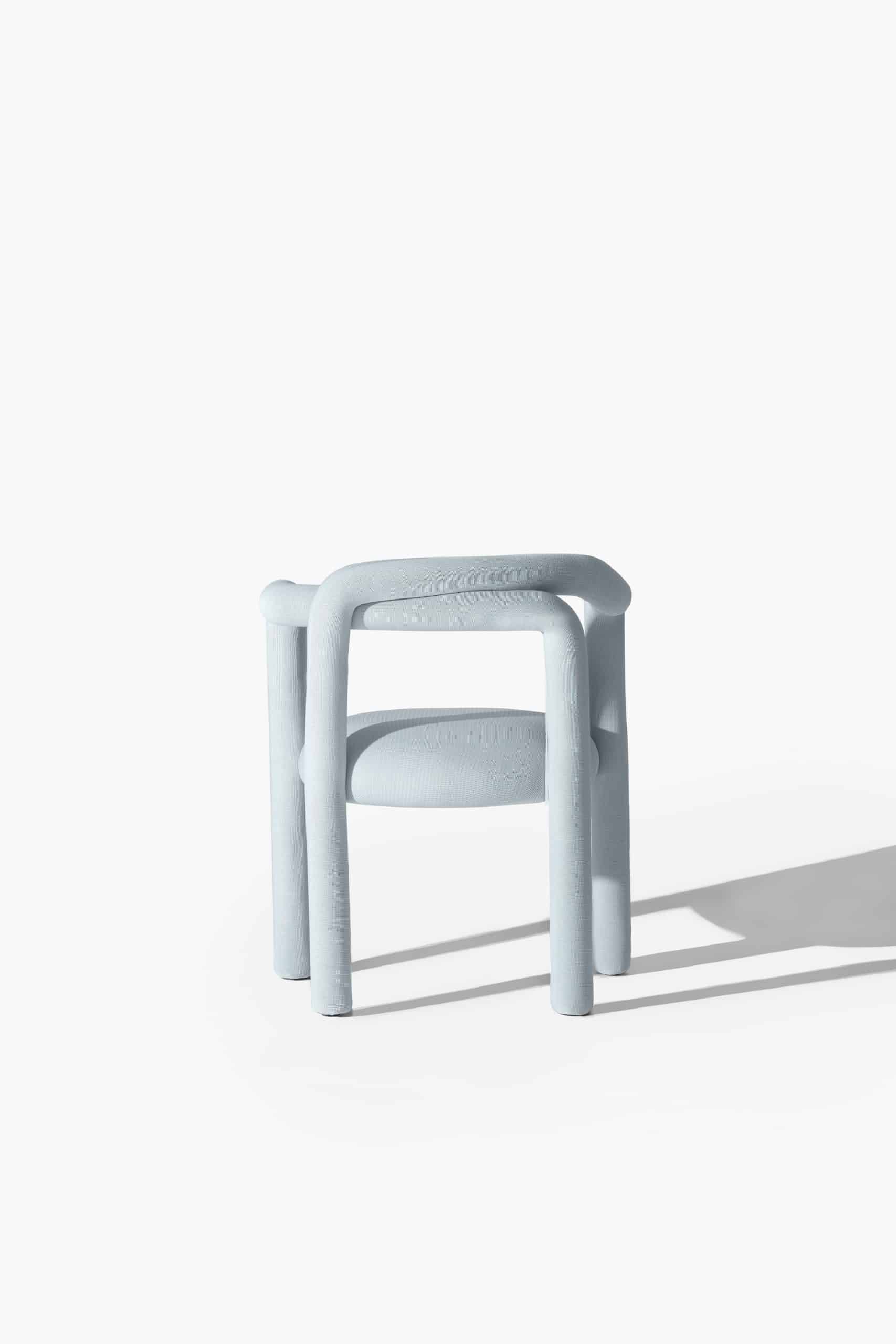 A cadeira Tubo é uma síntese macia. Num percurso sensorial e fluido, o tubo materializa um desenho longo e sinuoso que percorre as partes da cadeira em um fôlego só. Toda estofada em tecido WE–KNIT — malha 3D feita a partir de PET reciclado — protege e acolhe o gesto de sentar, mimetizando articulações humanas.