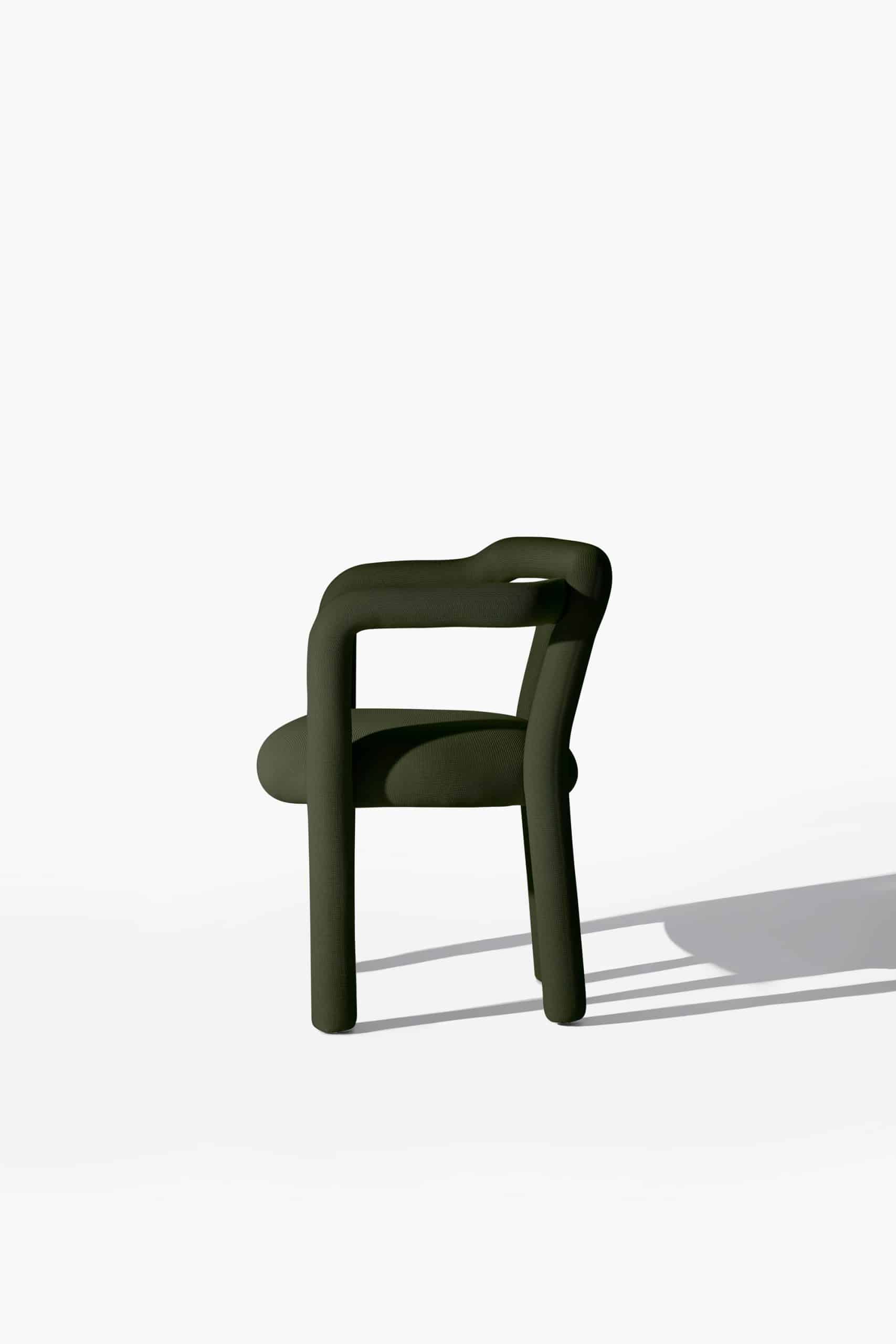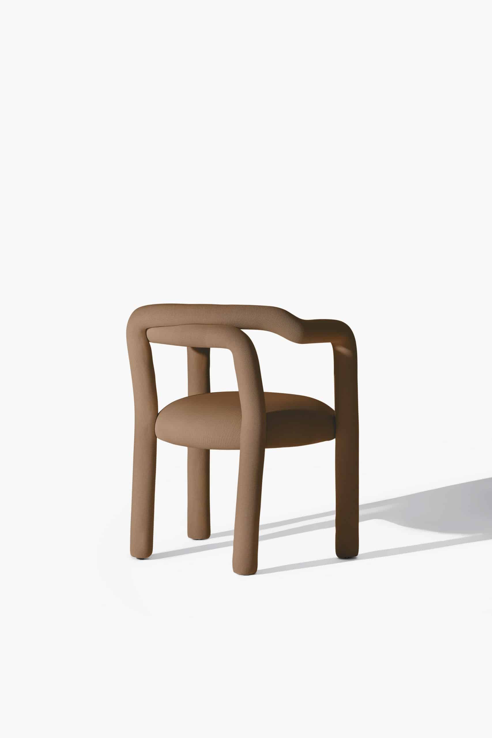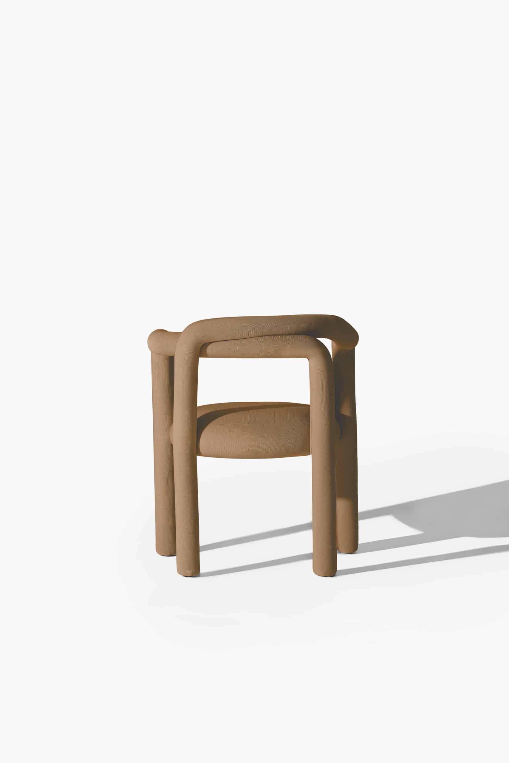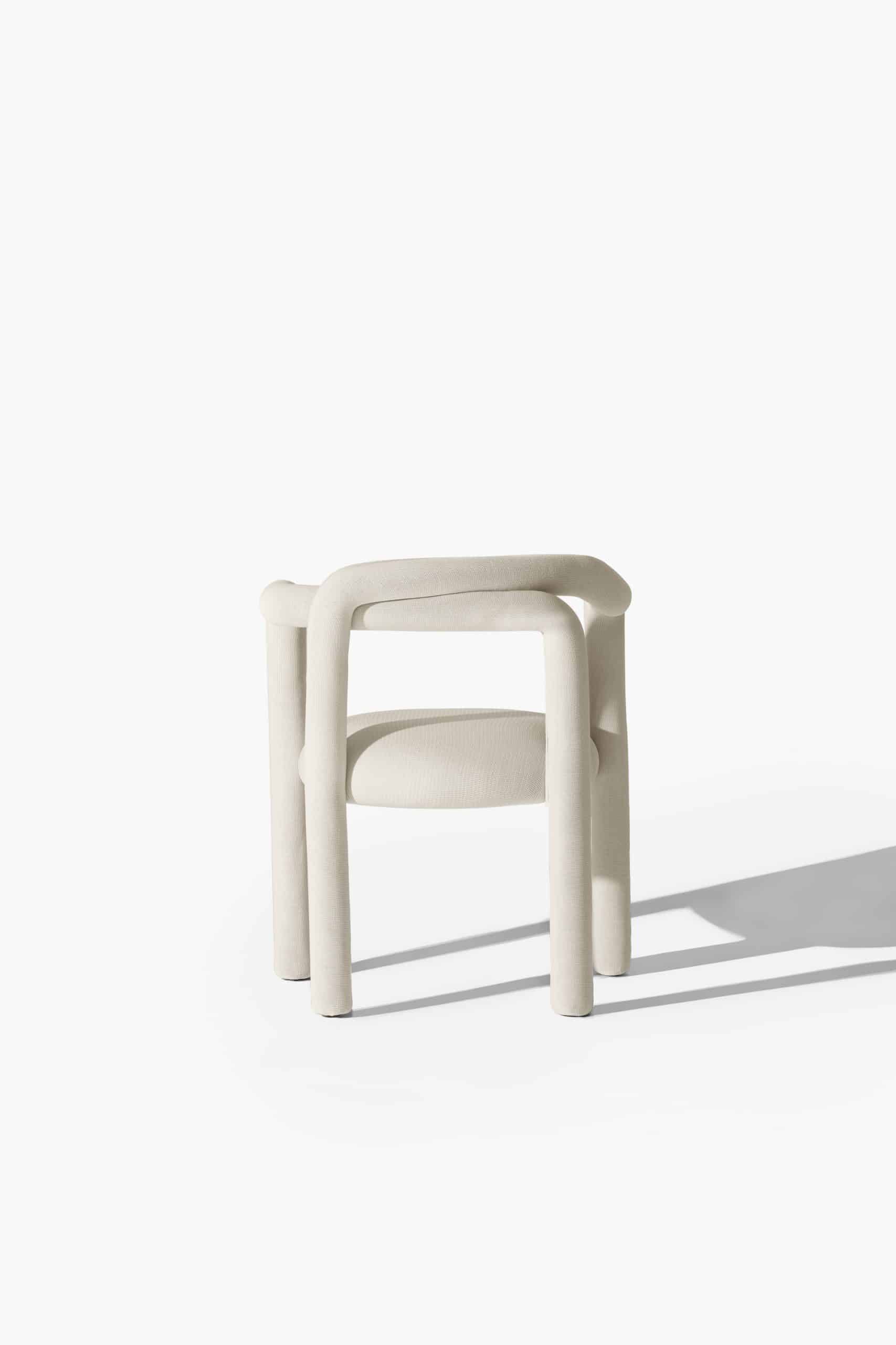 A cadeira Tubo é uma síntese macia. Num percurso sensorial e fluido, o tubo materializa um desenho longo e sinuoso que percorre as partes da cadeira em um fôlego só. Toda estofada em tecido WE–KNIT — malha 3D feita a partir de PET reciclado — protege e acolhe o gesto de sentar, mimetizando articulações humanas.