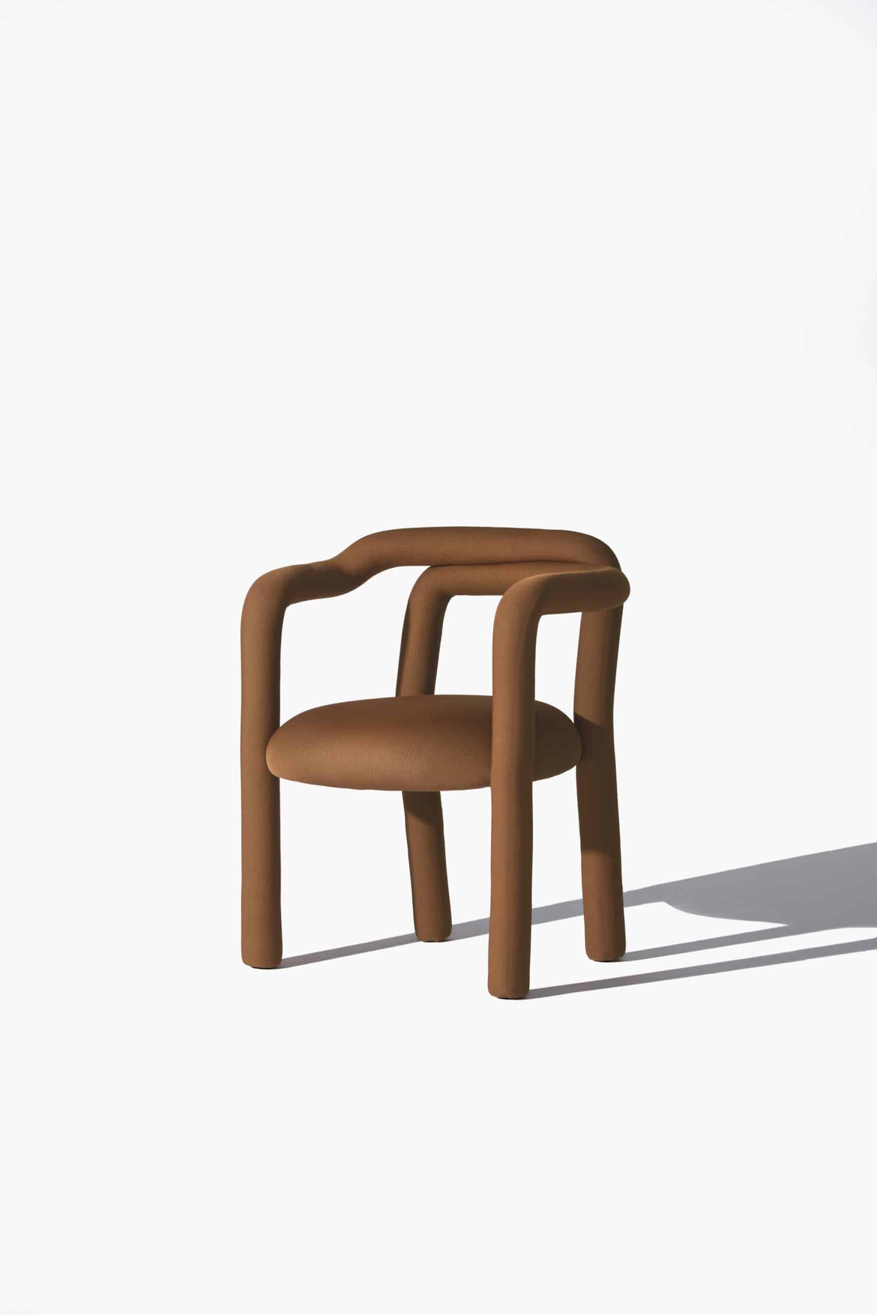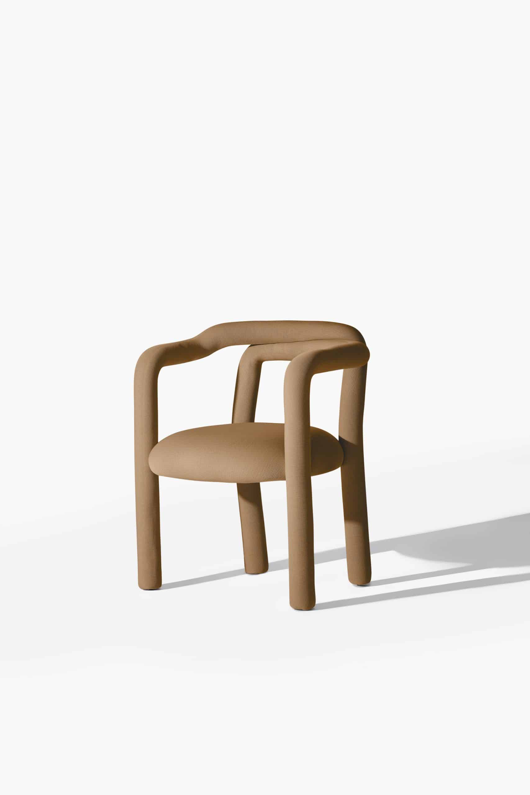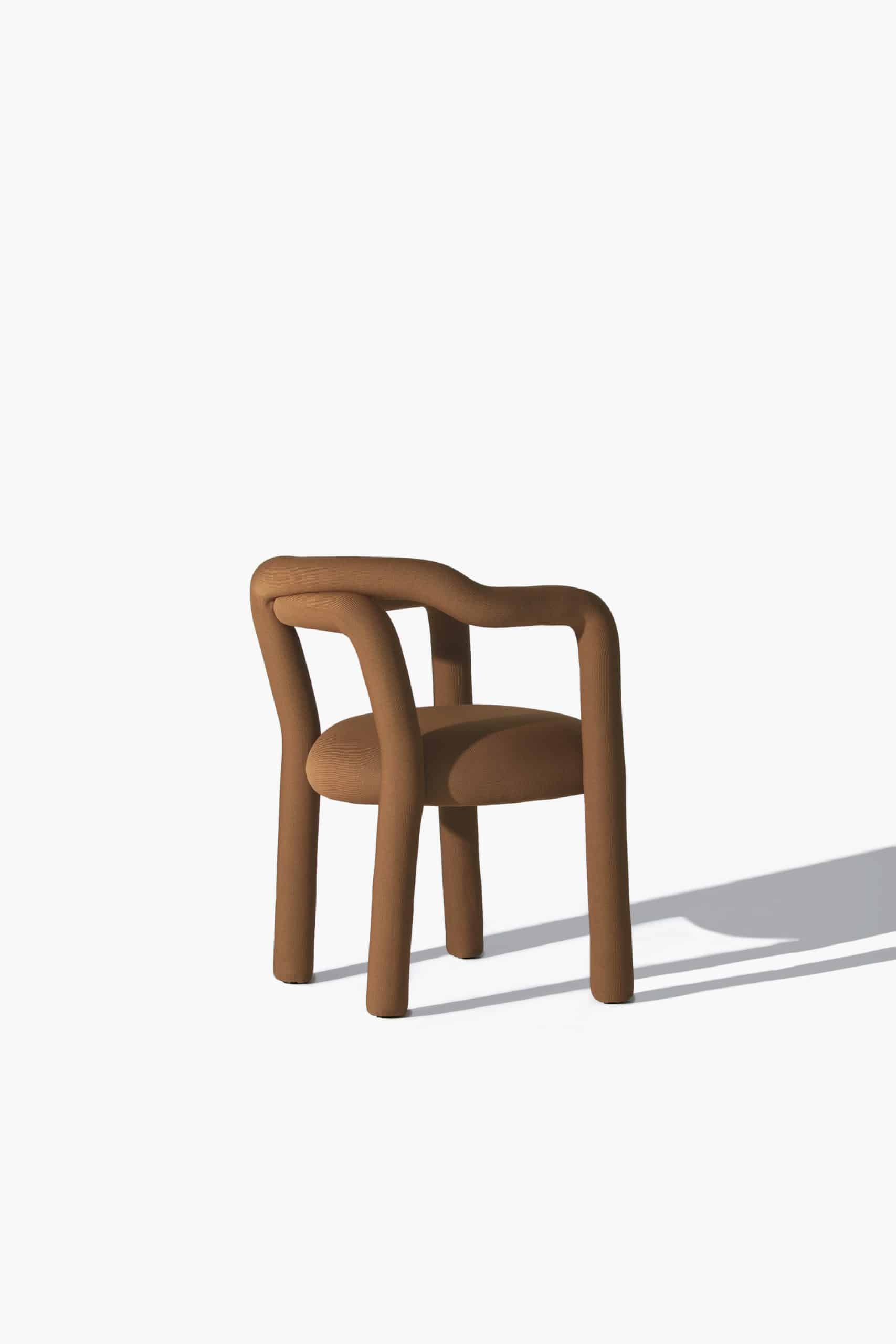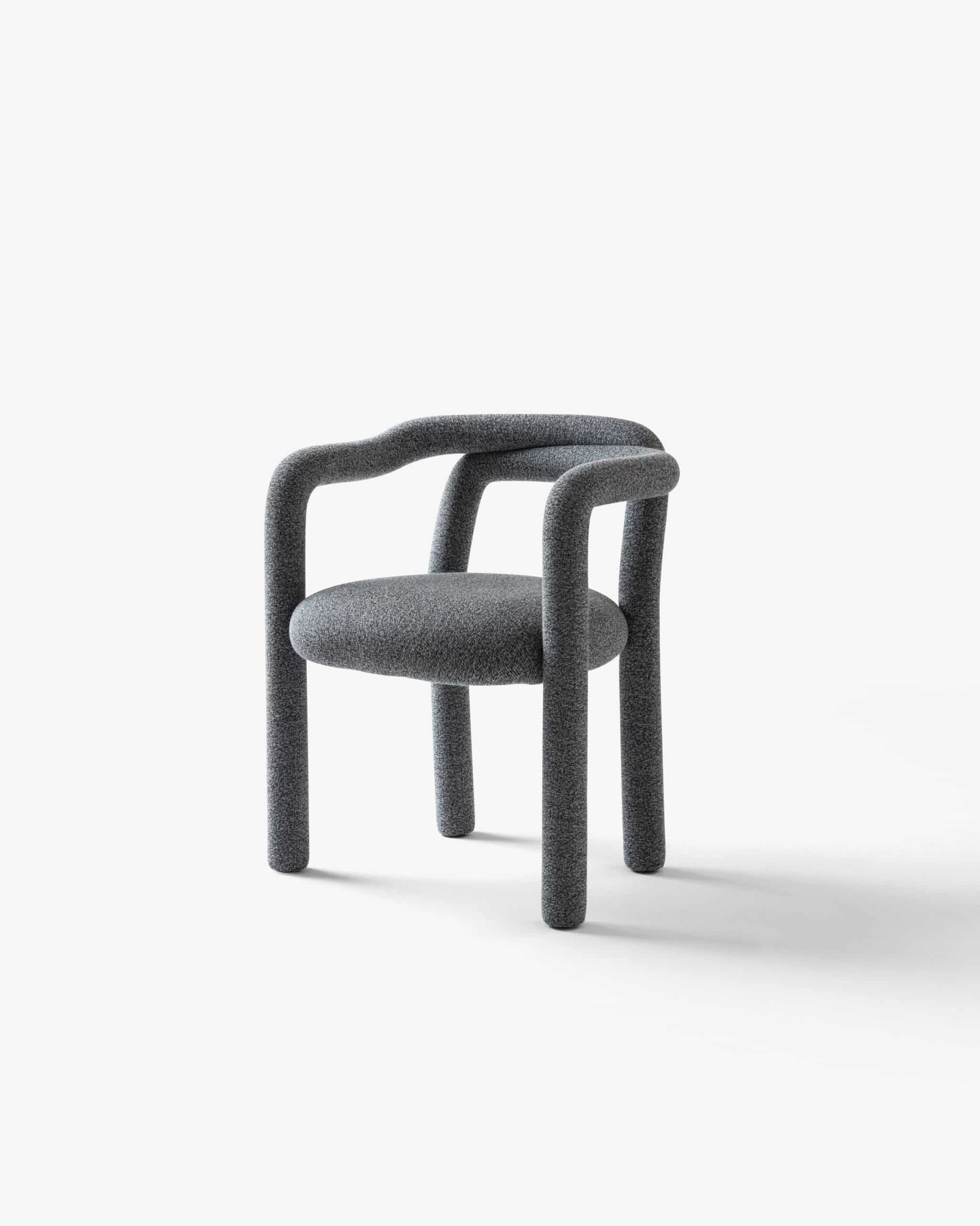 A cadeira Tubo é uma síntese macia. Num percurso sensorial e fluido, o tubo materializa um desenho longo e sinuoso que percorre as partes da cadeira em um fôlego só. Toda estofada em tecido WE–KNIT — malha 3D feita a partir de PET reciclado — protege e acolhe o gesto de sentar, mimetizando articulações humanas.