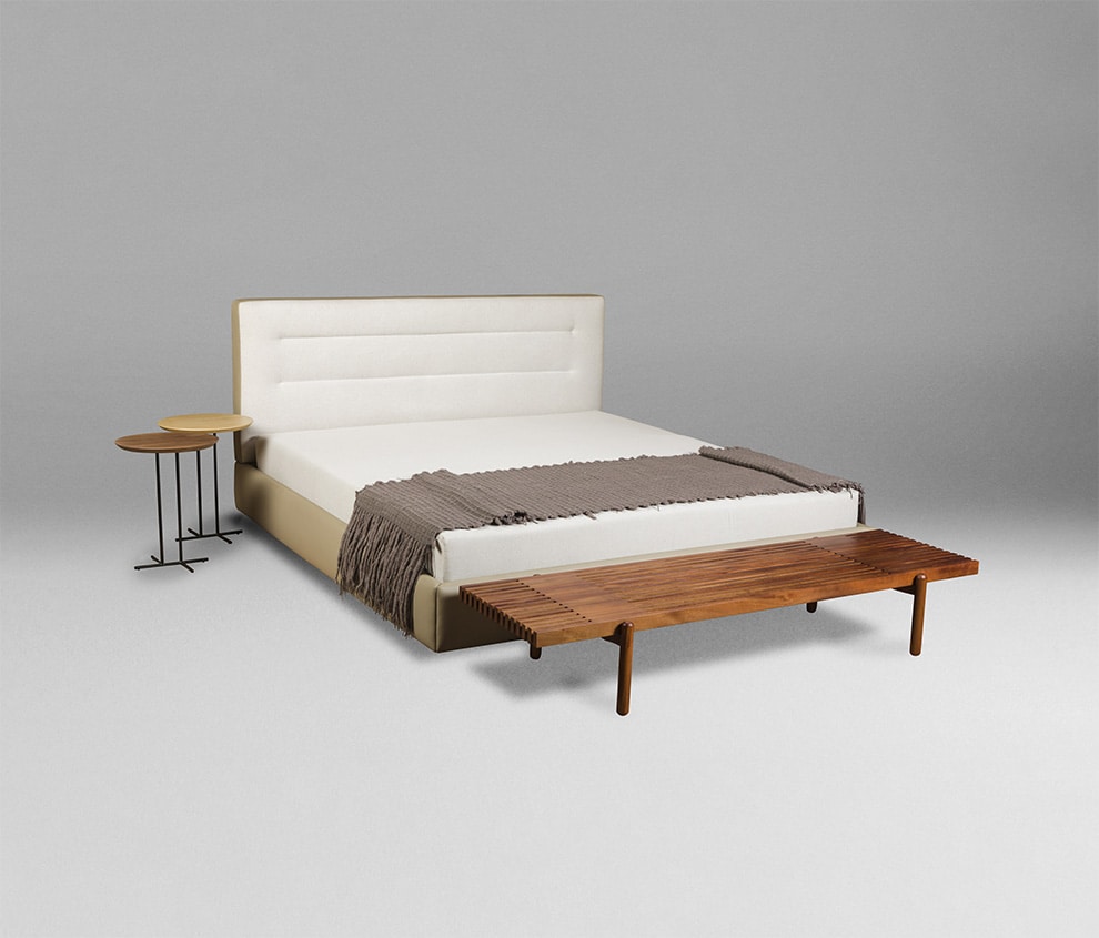 Na Cama Bridge o conforto emerge da simplicidade das formas associadas ao acabamento primoroso. A base estofada complementa a forma da cabeceira espessa, onde os detalhes da costura criam um aspecto sutil e delicado, que revelam o cuidado da Neobox com cada detalhe.