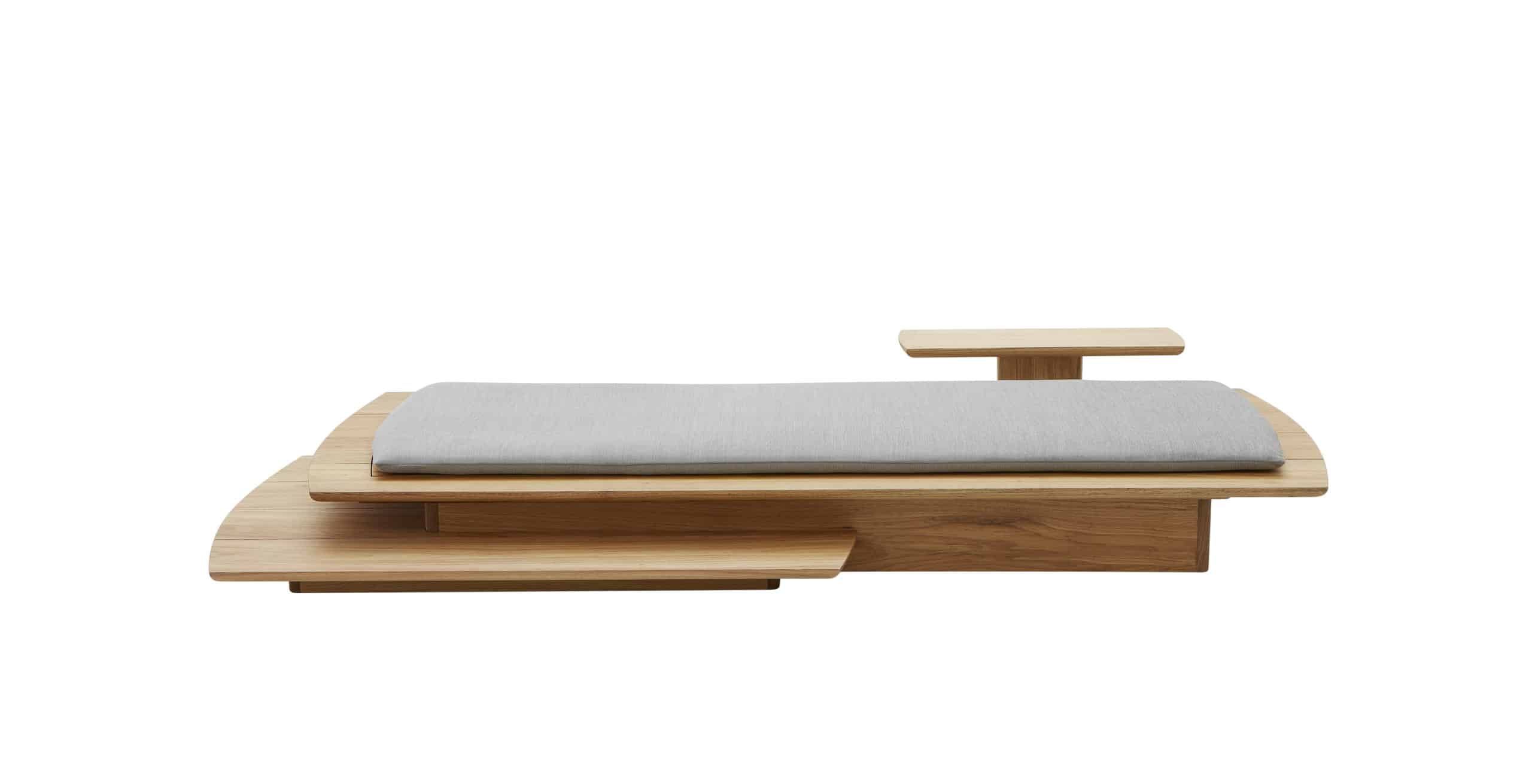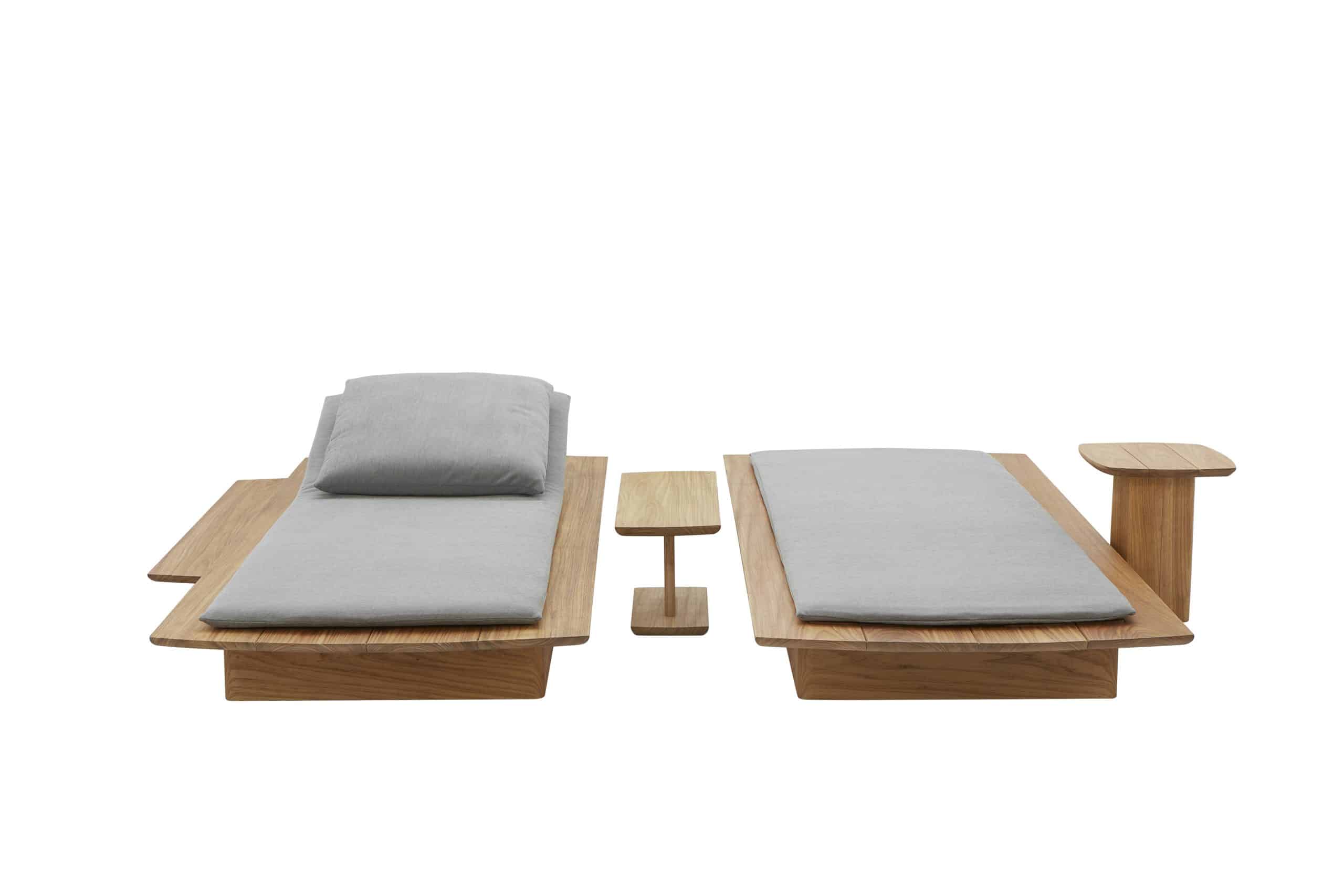 Tratam-se de volumes longitudinais que funcionam como platôs, possibilitando distintos apoios e funcionalidades, e trazendo conforto a ambientes externos. Possui estrutura em madeira maciça, graduador em alumínio polido, e almofadas de assento e decorativas que podem ser guardadas no compartimento abaixo do assento, dentro de sua estrutura em madeira. A linha move é composta por espreguiçadeira, mesa lateral, e um apoio que se encaixa de forma simples tanto na cabeceira quanto nos pés da espreguiçadeira.