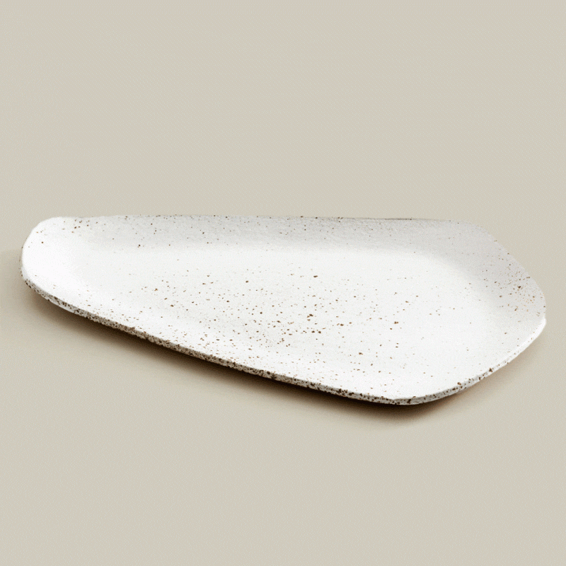 Objetos utilitários produzidos em cerâmica. Serviço de jantar orgânico e irregular, movimentando o layout na decoração de mesas. Disponíveis nos tons grafite e branco. Peças de cerâmica com formato irregular, sujeito a pequena variação entre medidas.