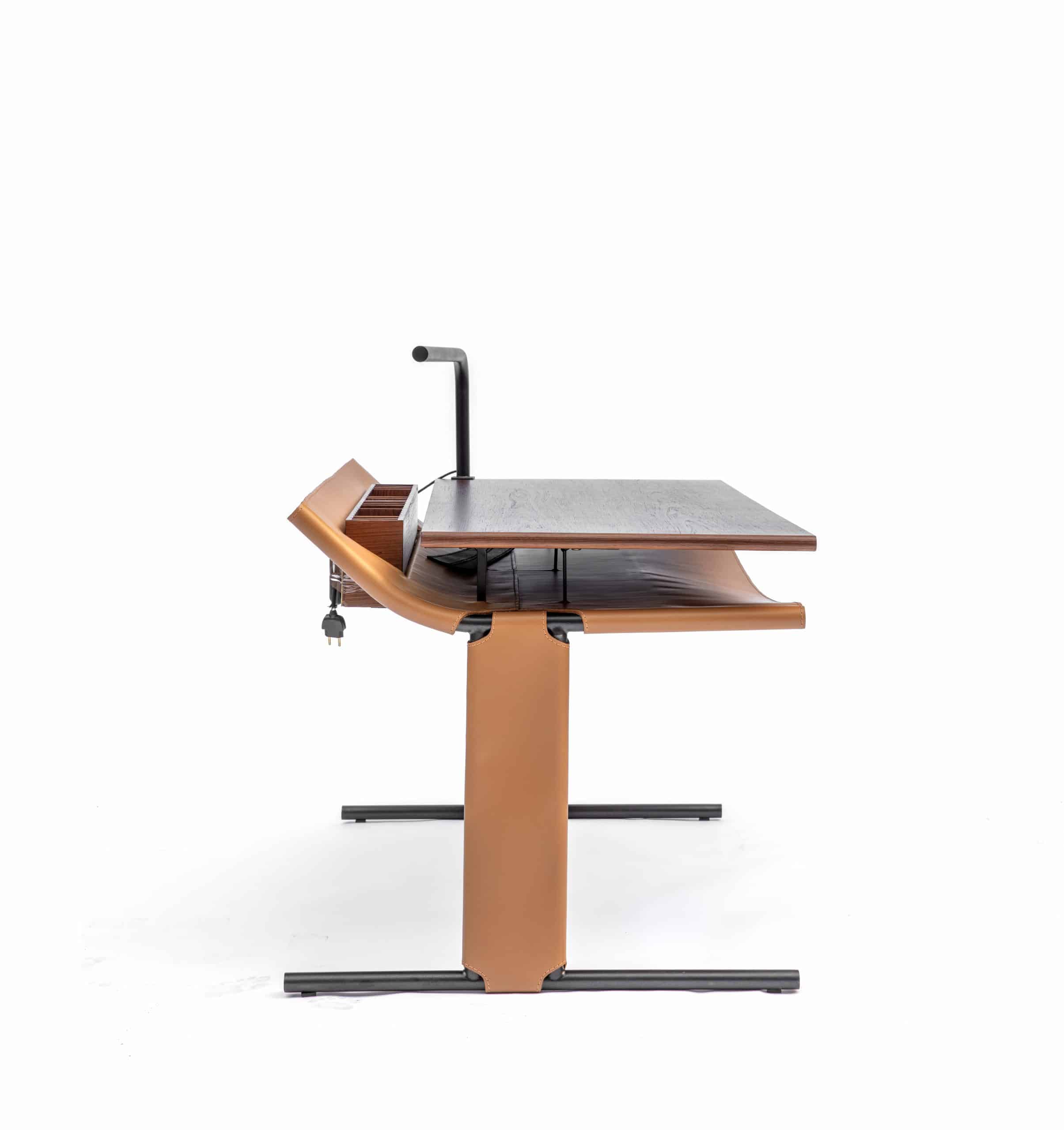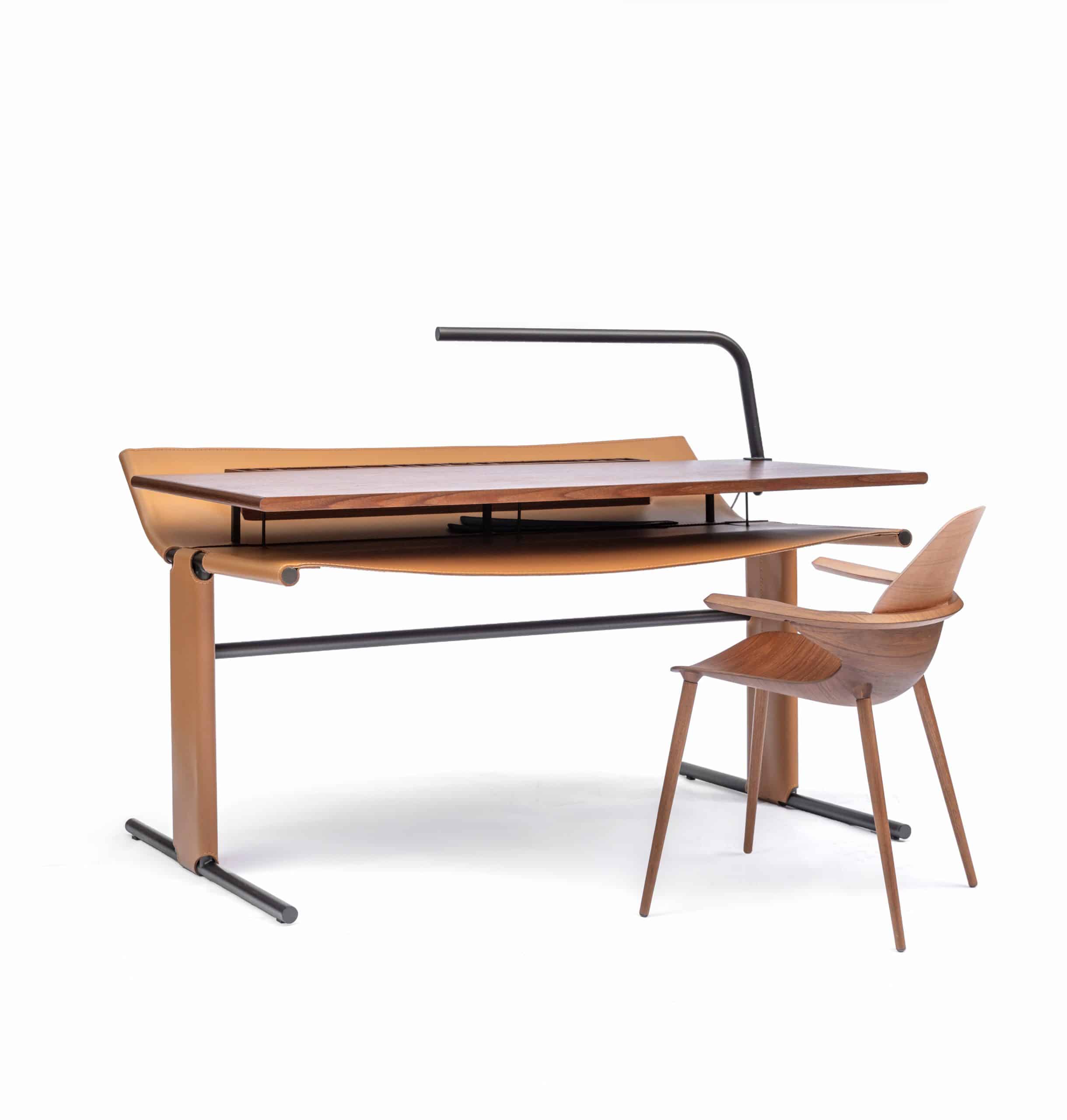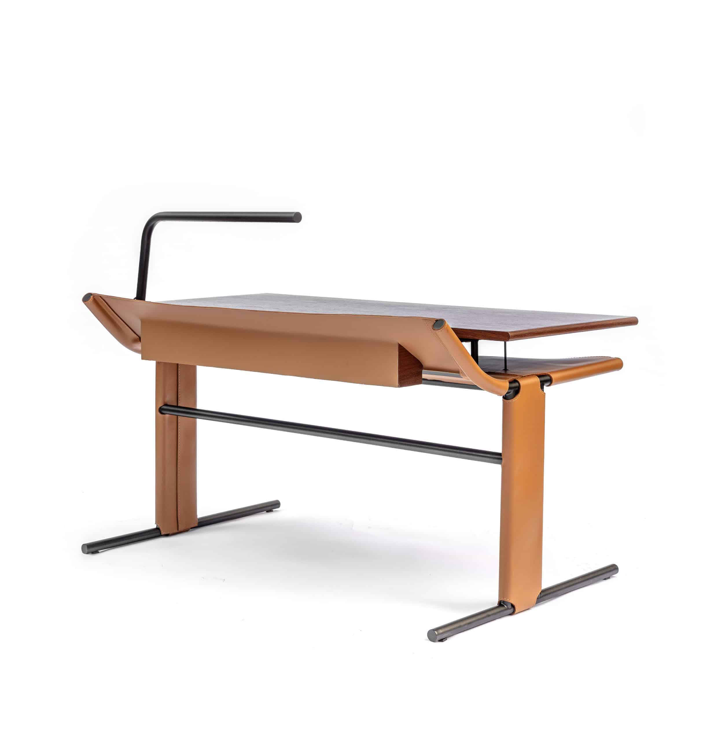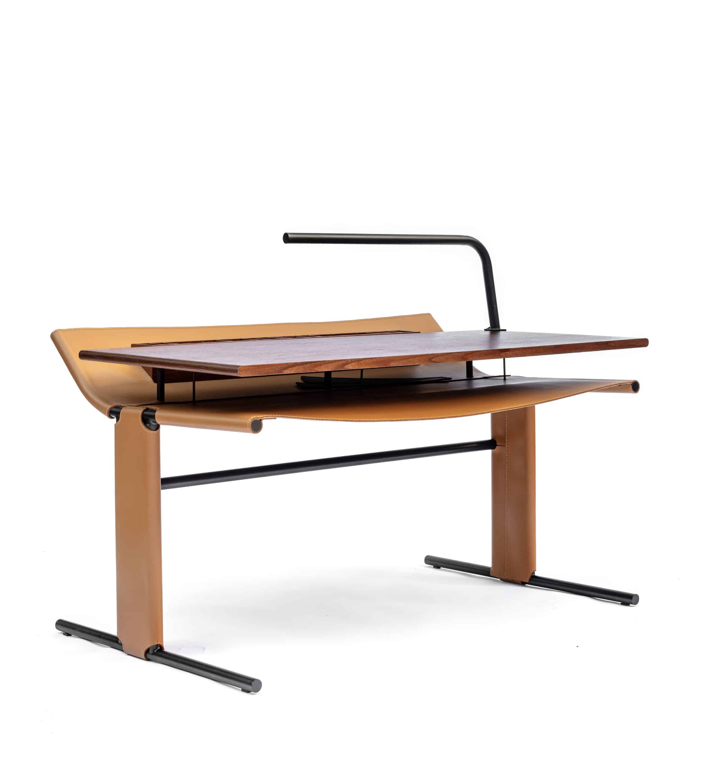 Em homenagem a Carlos Drummond de Andrade, o poeta mineiro, a escrivaninha Drummond é produzida em metal com detalhes em couro e madeira, acompanhada de uma luminária.
