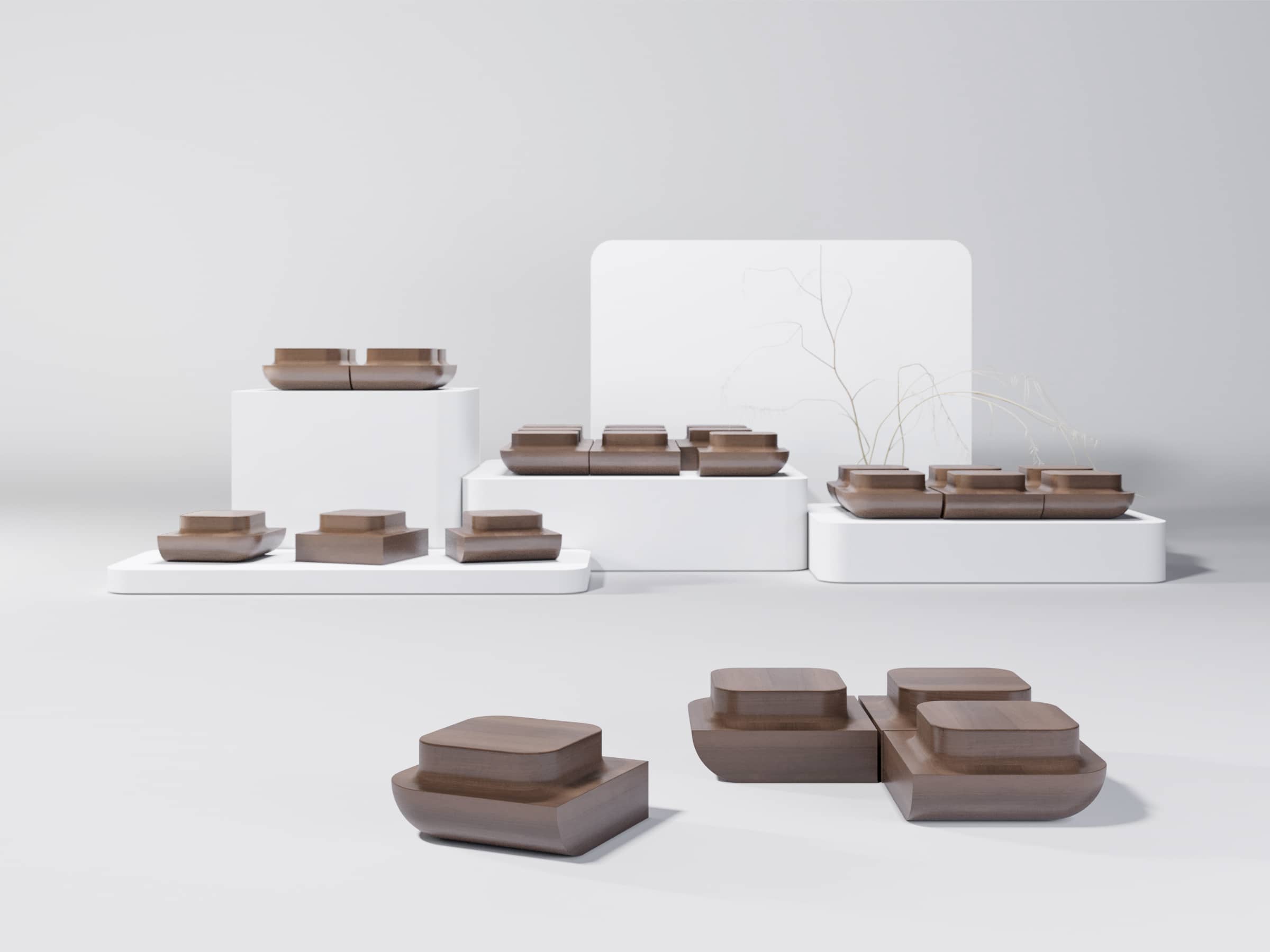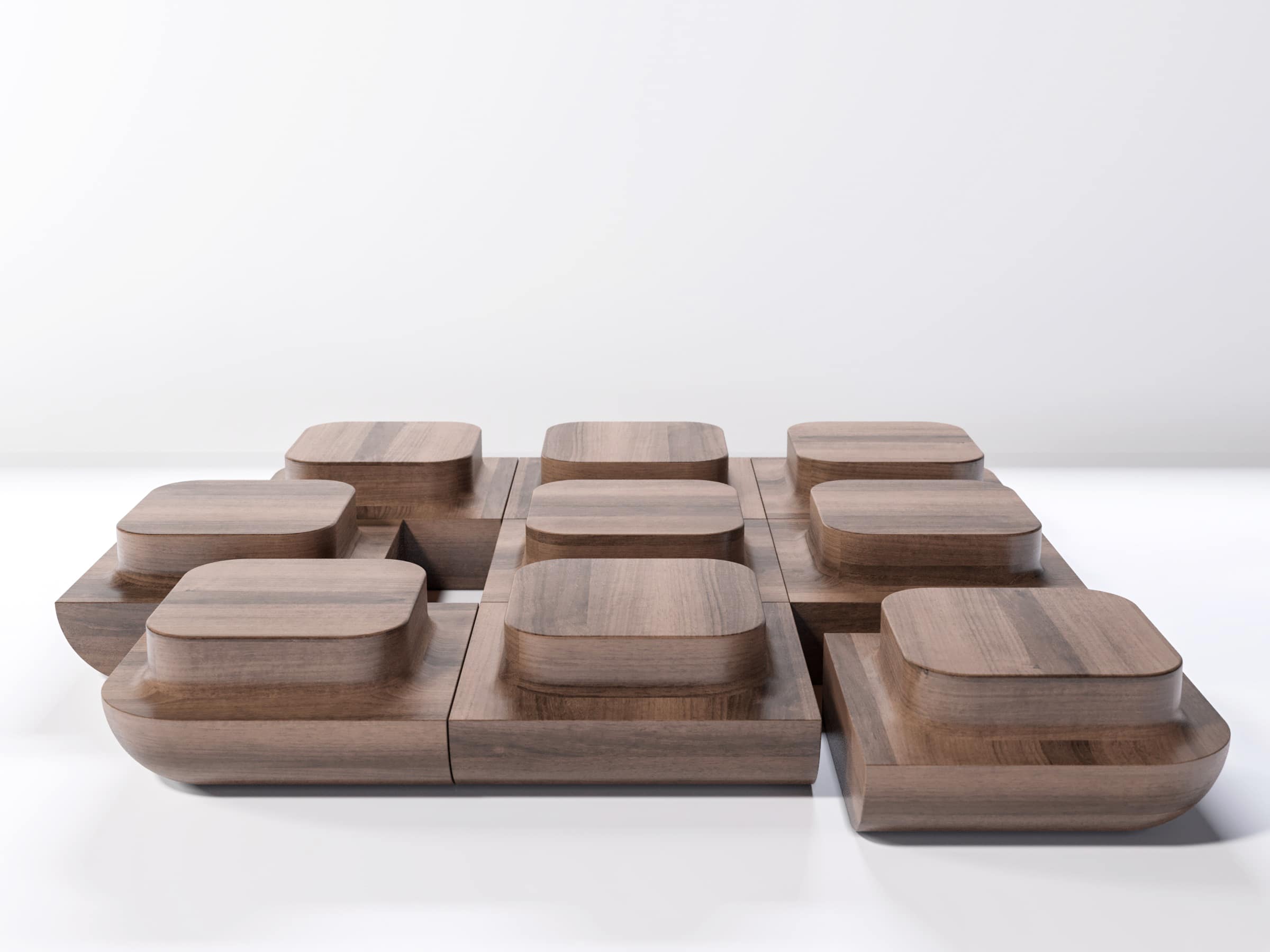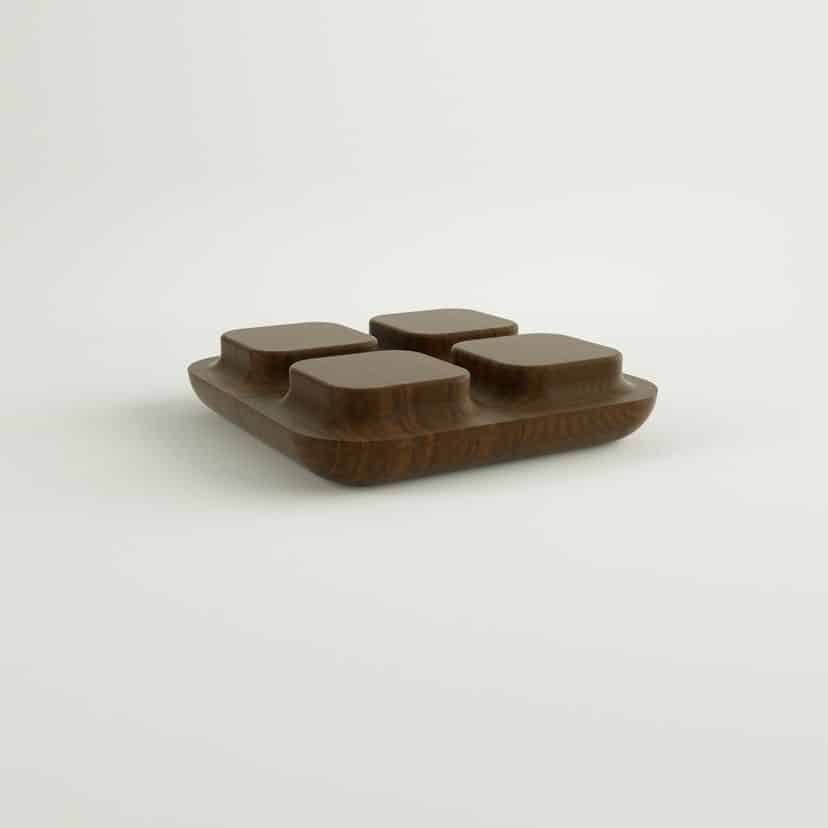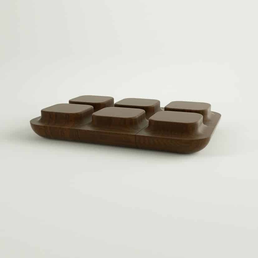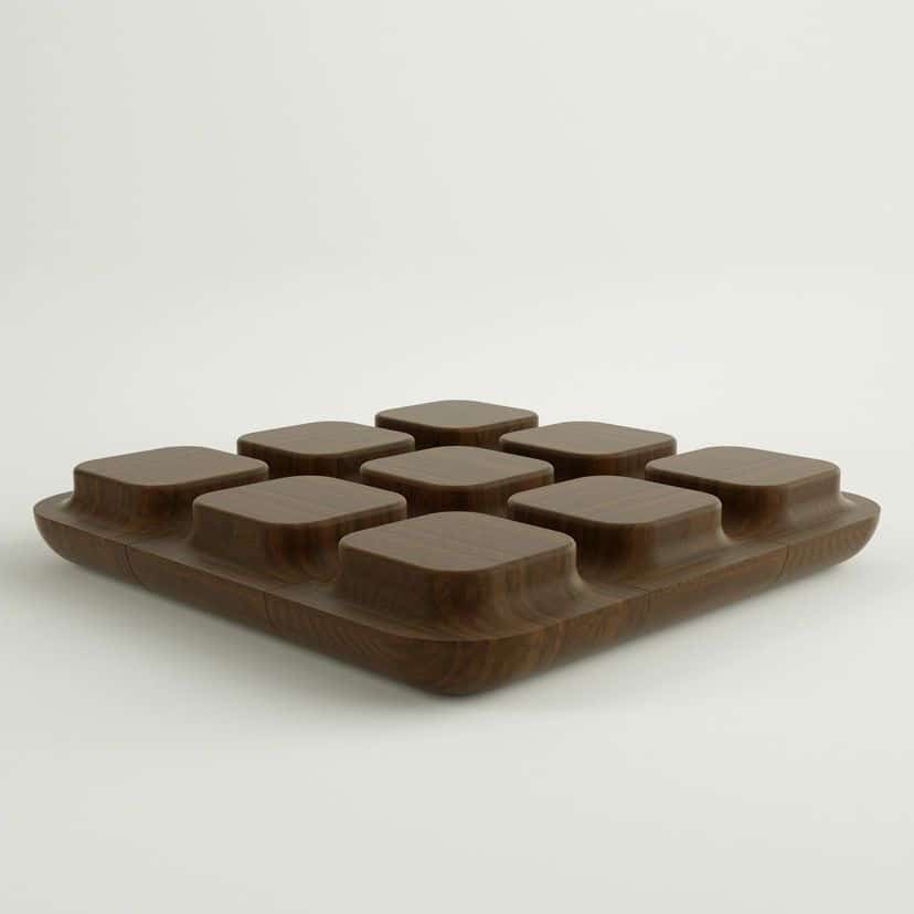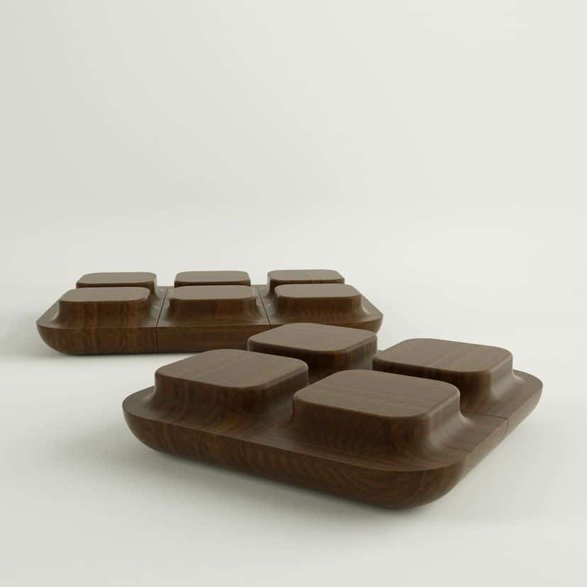 A mesa de centro Garoto recebe esse nome em homenagem à icônica barra de chocolate Garoto. Composta por módulos quadrados, ela pode ser configurada para criar mesas quadradas ou retangulares, dependendo do número de peças escolhidas.