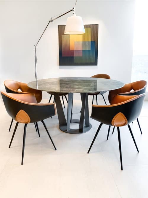 As mesas desta linha exploram formas que se contrapõem em uma articulação aleatória de hastes estruturais para traduzir a solidez de um móvel contemporâneo que prende o olhar.
