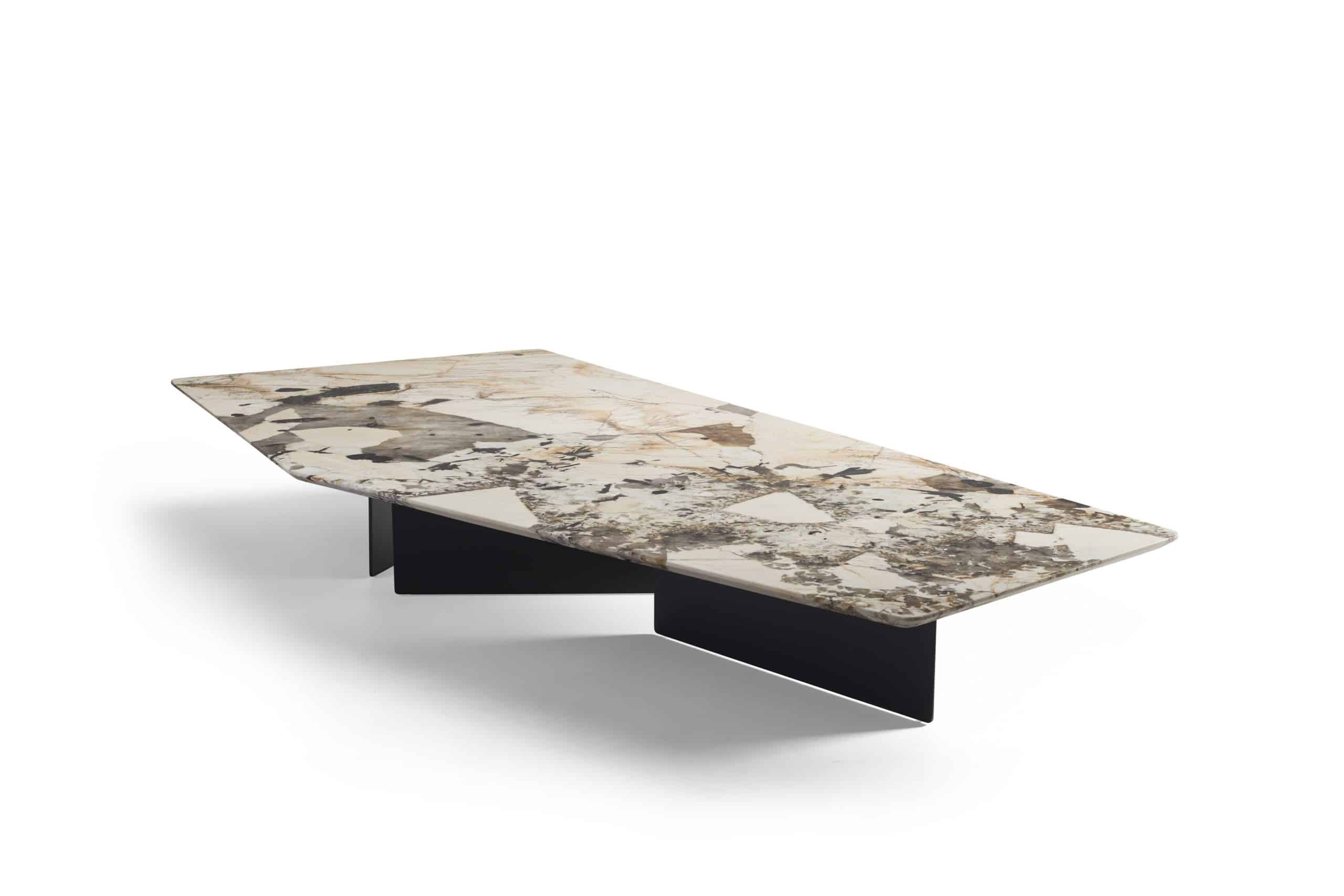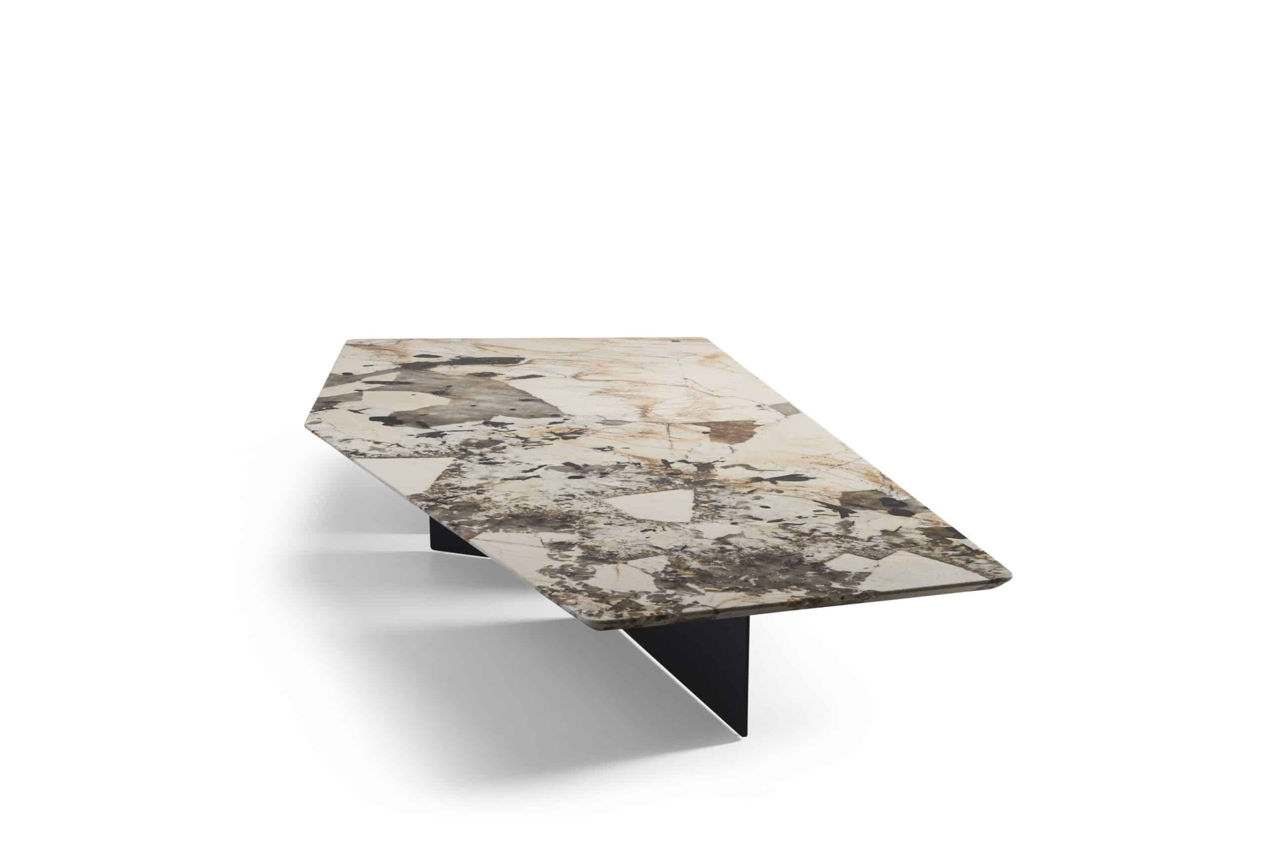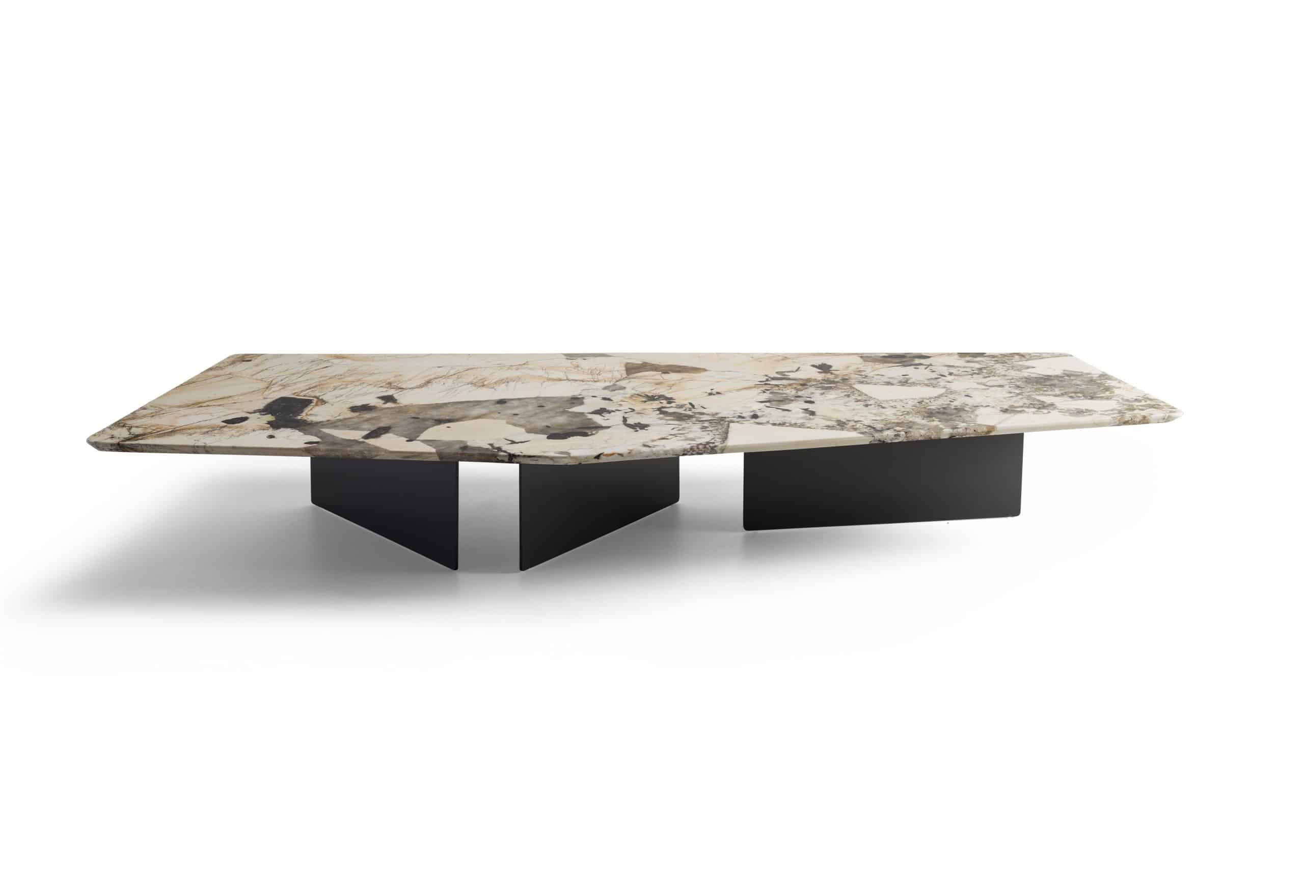 A mesa de centro Pier nos remete a uma obra de arte. É uma peça icônica que traduz um design arrojado. Seus pés em chapa de metal posicionados de formas diferentes, contrastam com seu tampo de formato irregular, podendo este ser produzido em mármore ou lâmina.
