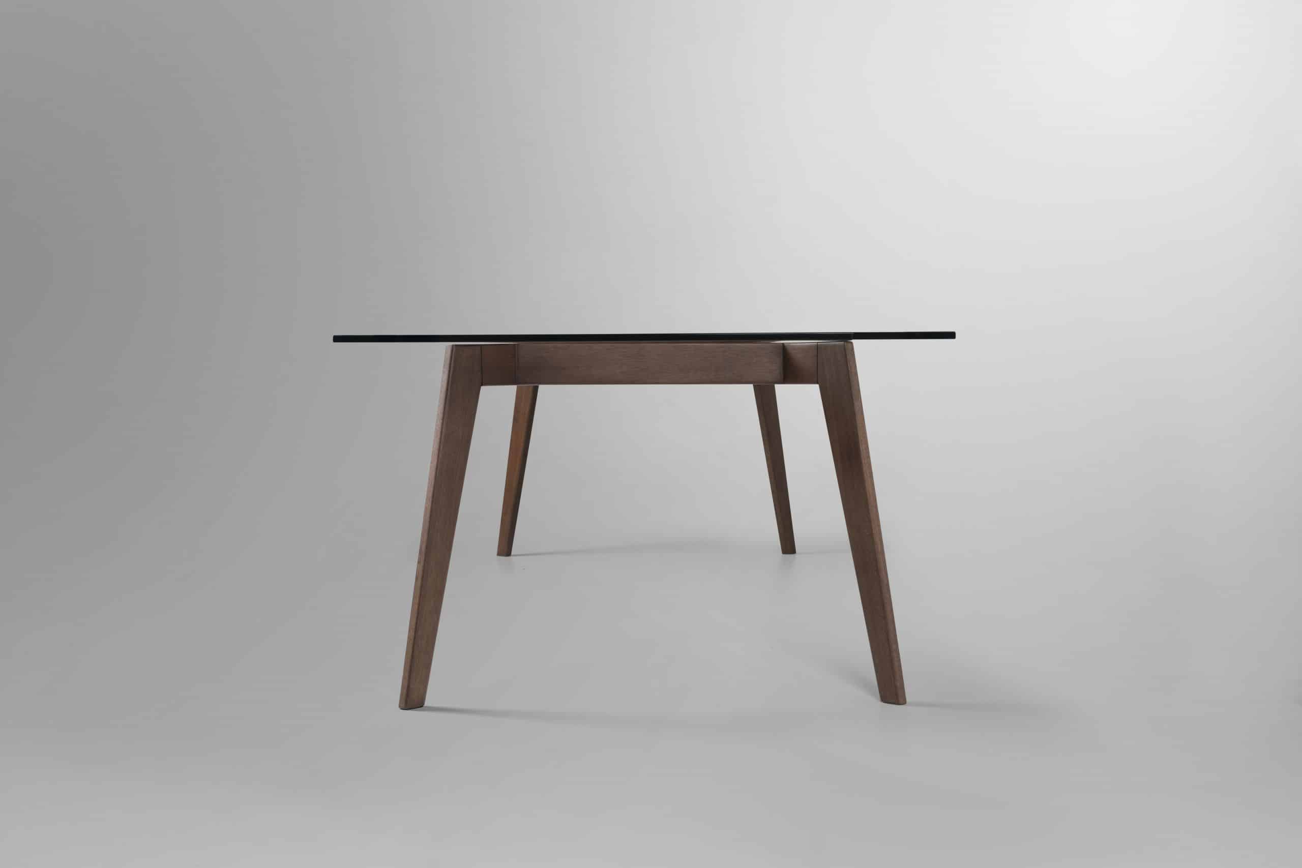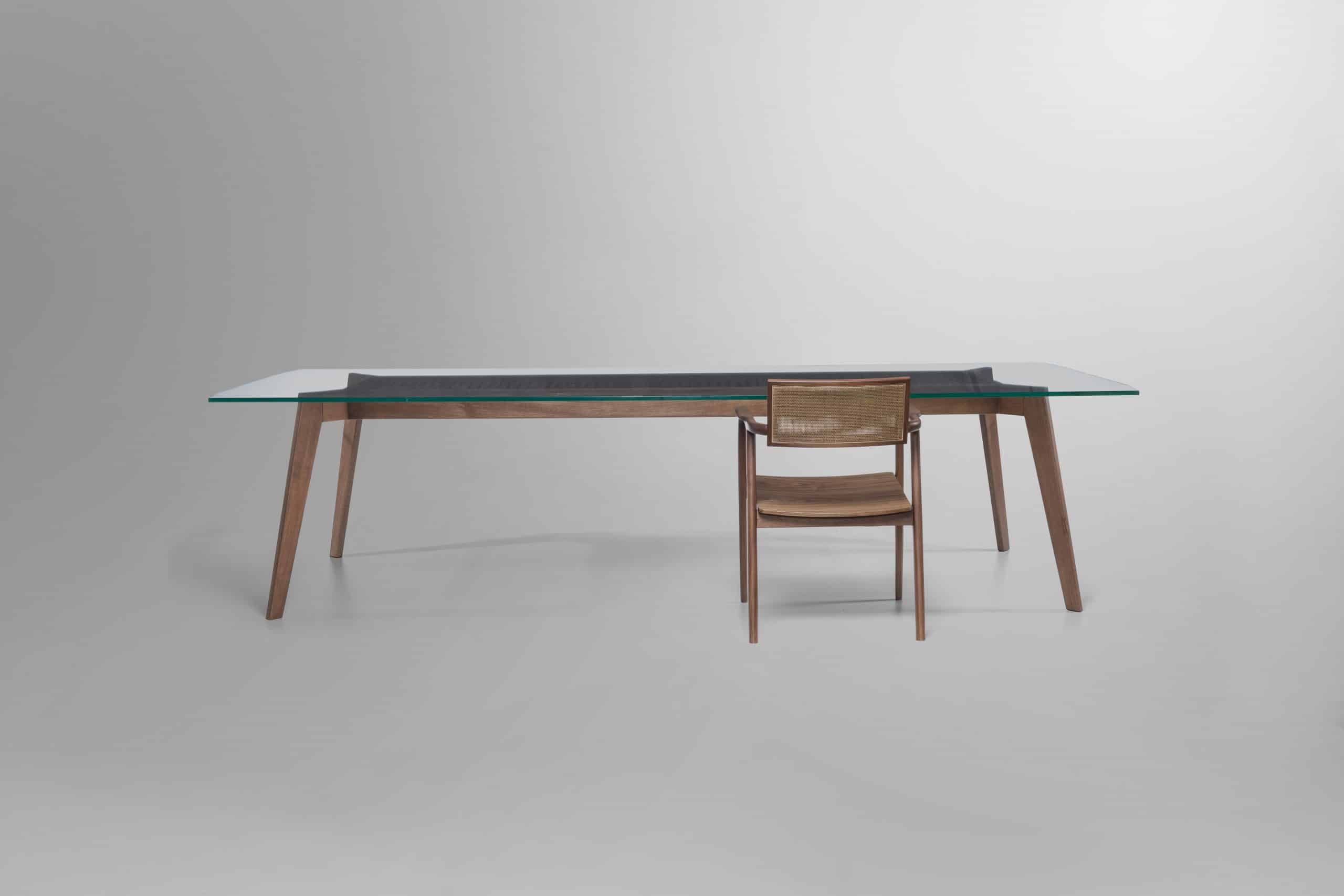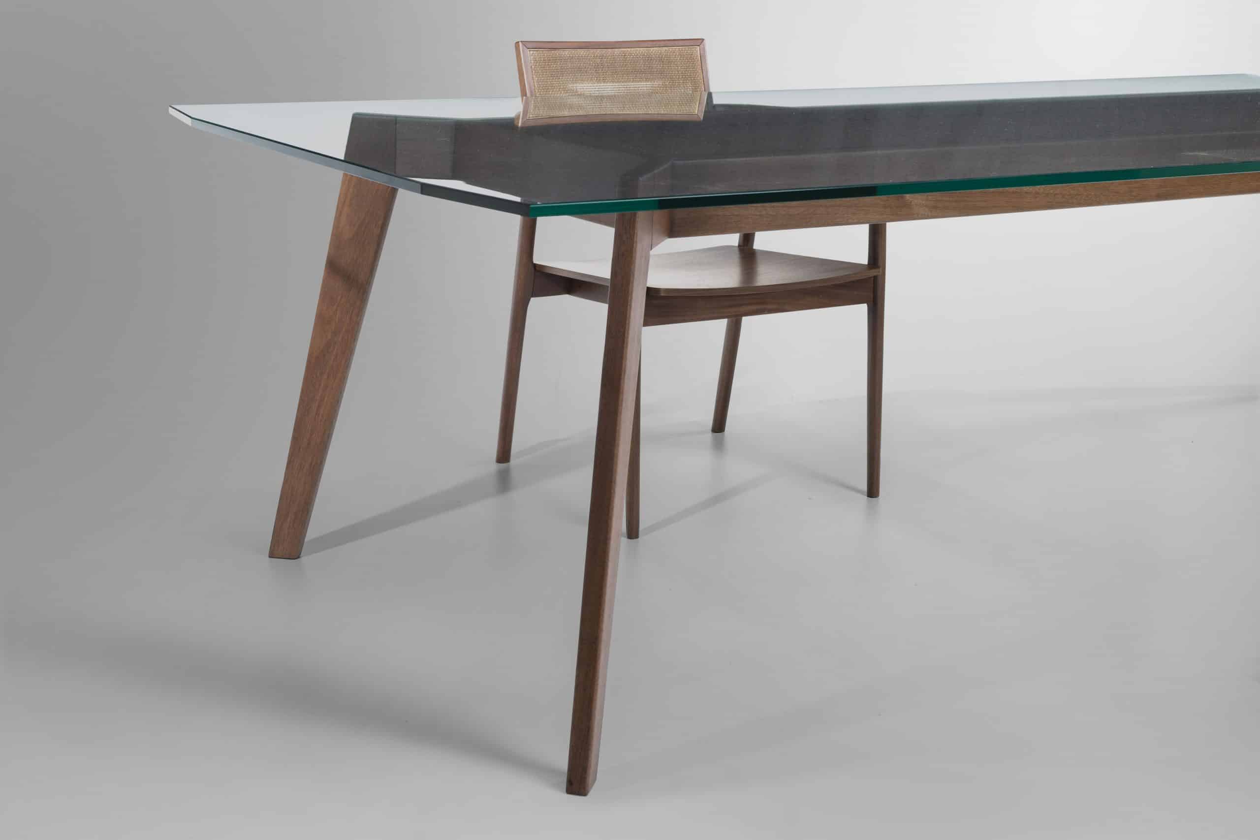 A mesa de jantar Cage reflete o requinte e primor de uma peça produzida em madeira, onde é possível perceber todos os detalhes e qualidade da junção dos componentes. Os pés inclinados e esguios conferem sutileza e complementam a leveza do tampo em vidro, visual que adquire ainda mais valor quando observamos os detalhes em tubos de madeira no centro da peça.