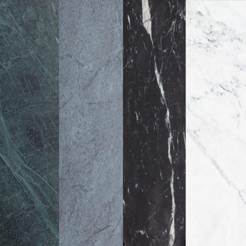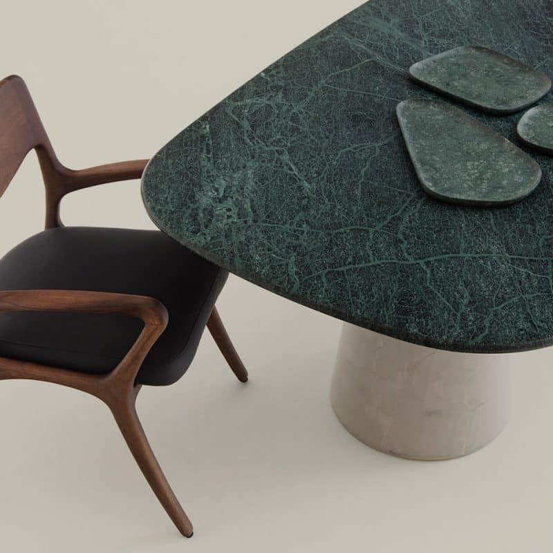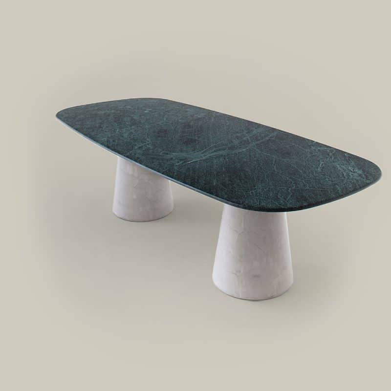 Mesa com tampo em marmore com usinagem boleada e acabaento fosco. Base cônica de multilaminado. Disponível em diversos acabamentos.