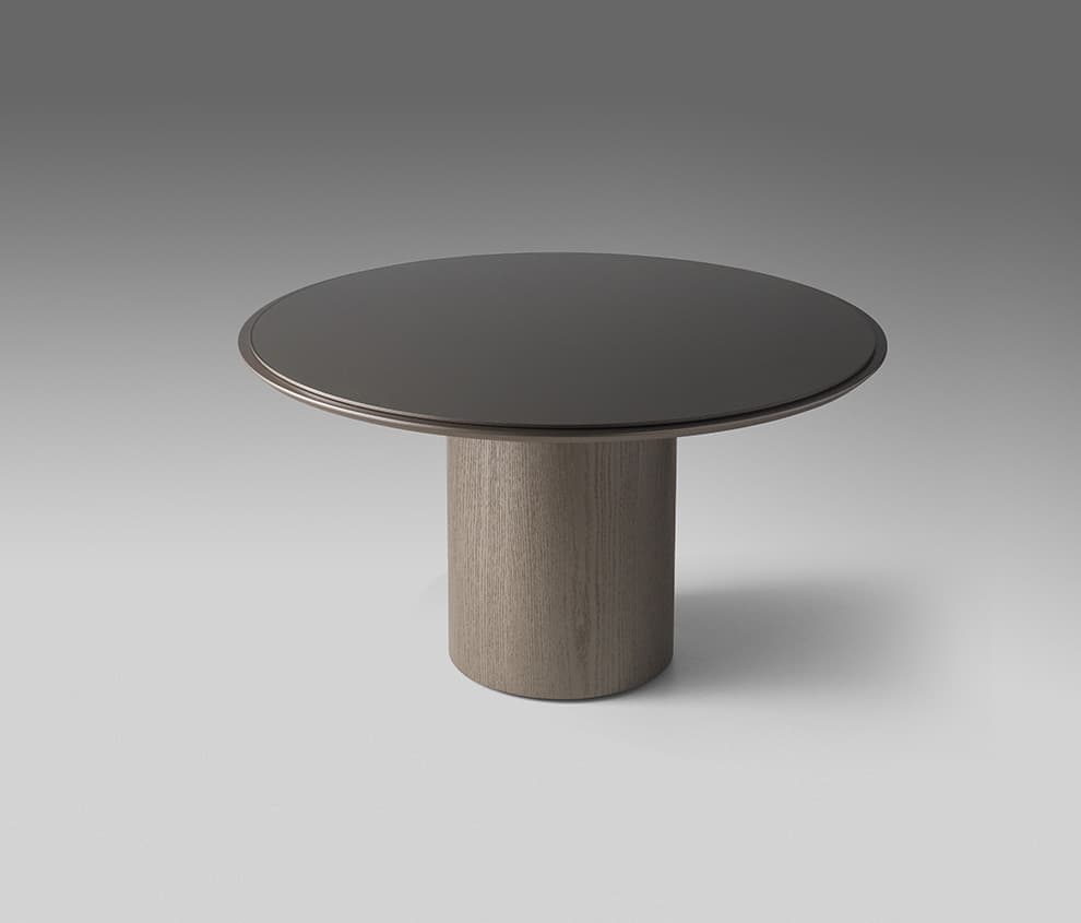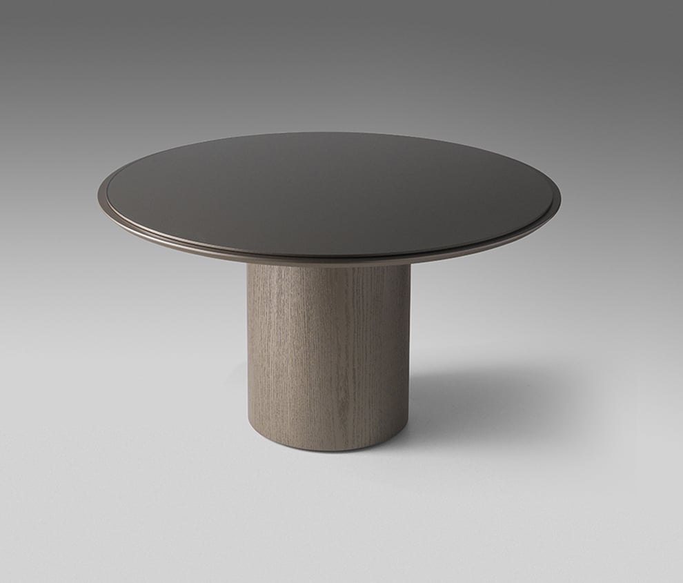A Mesa Linter Bax caracteriza-se pela sua robusta base cilíndrica revestida em lâmina de madeira. A sobreposição de tampos arremata a composição de materiais, já que a mesa possui dois: em vidro e madeira e com diâmetros diferentes. Conferindo um desenho único para a superfície.