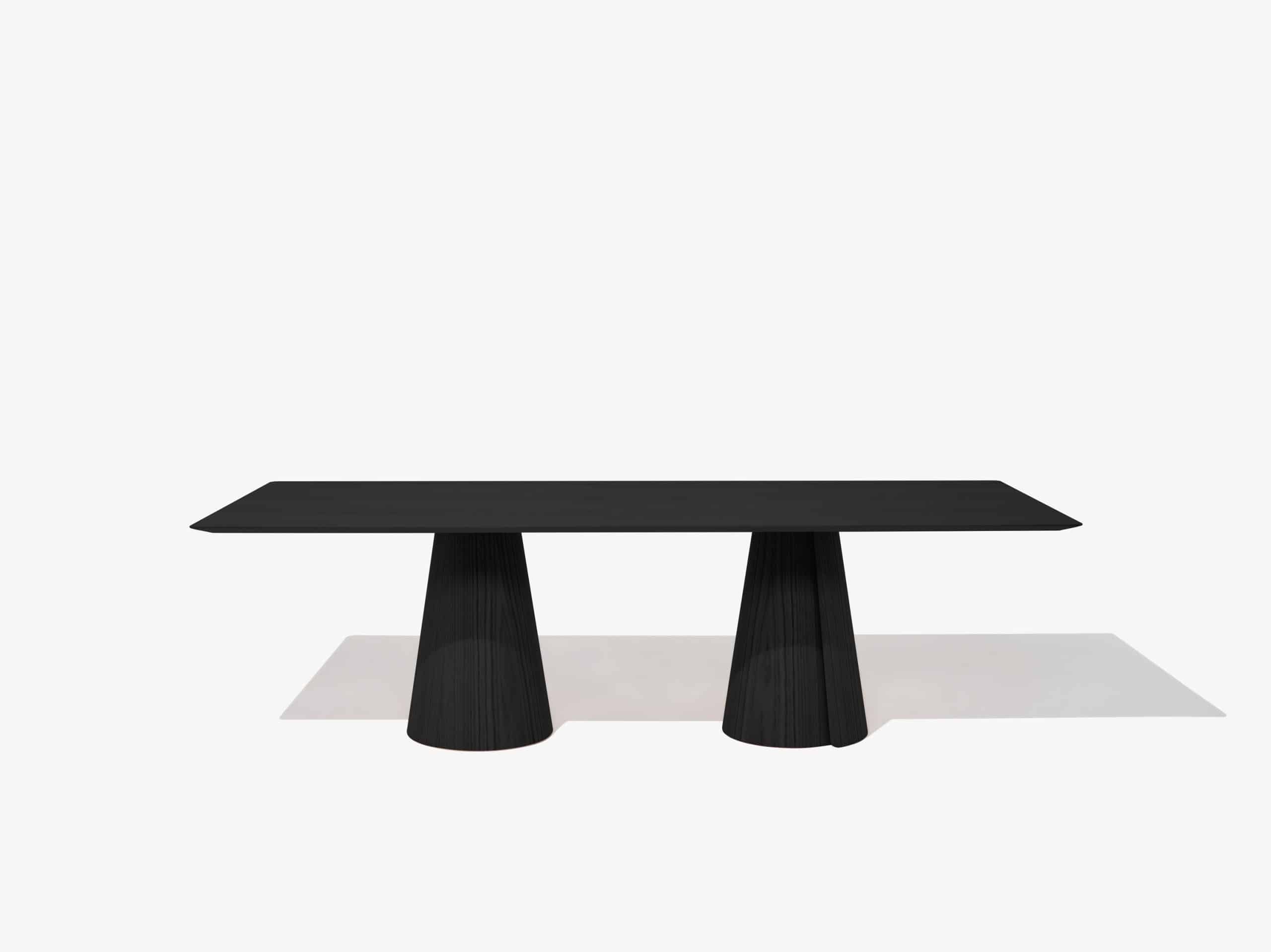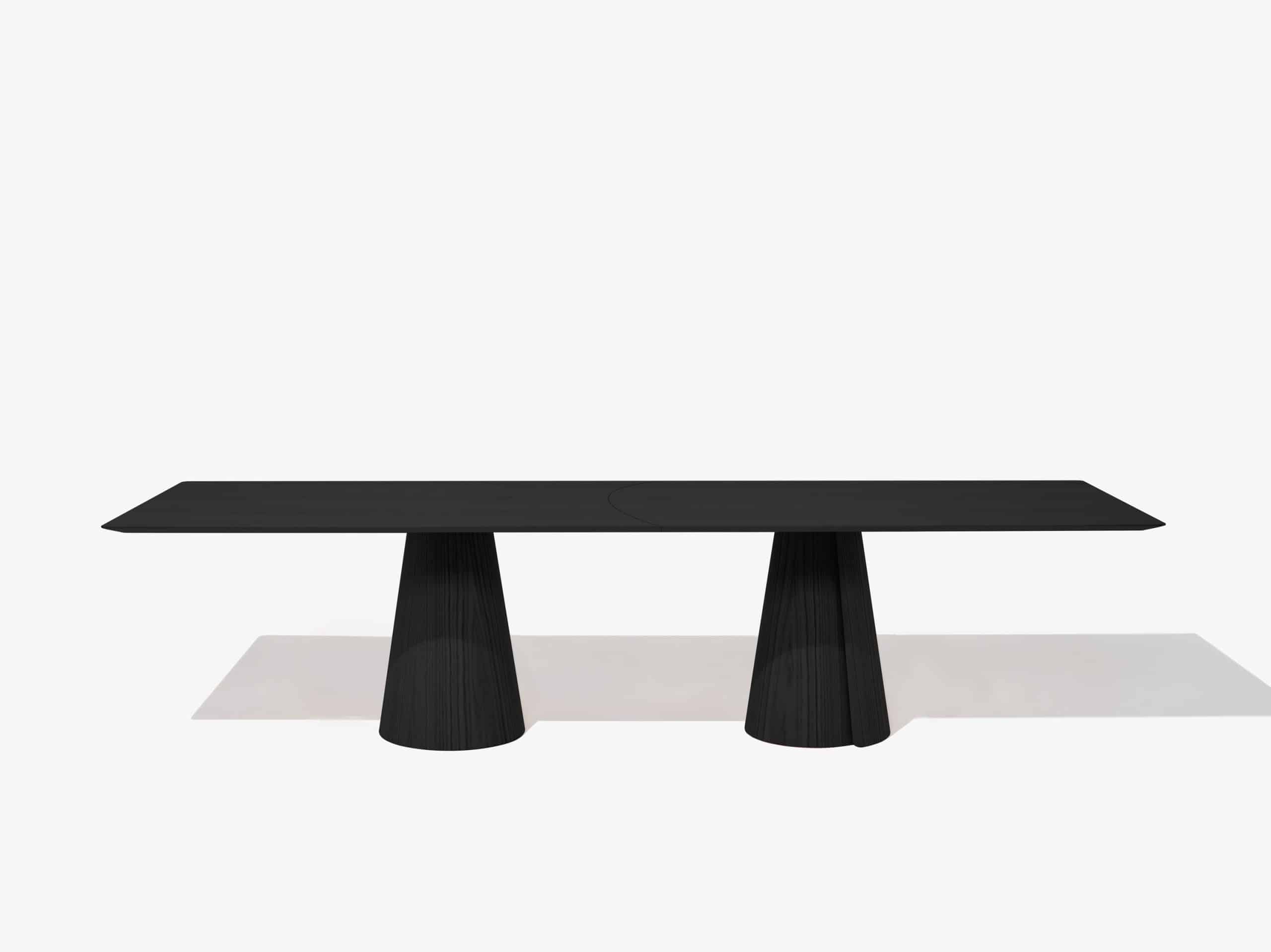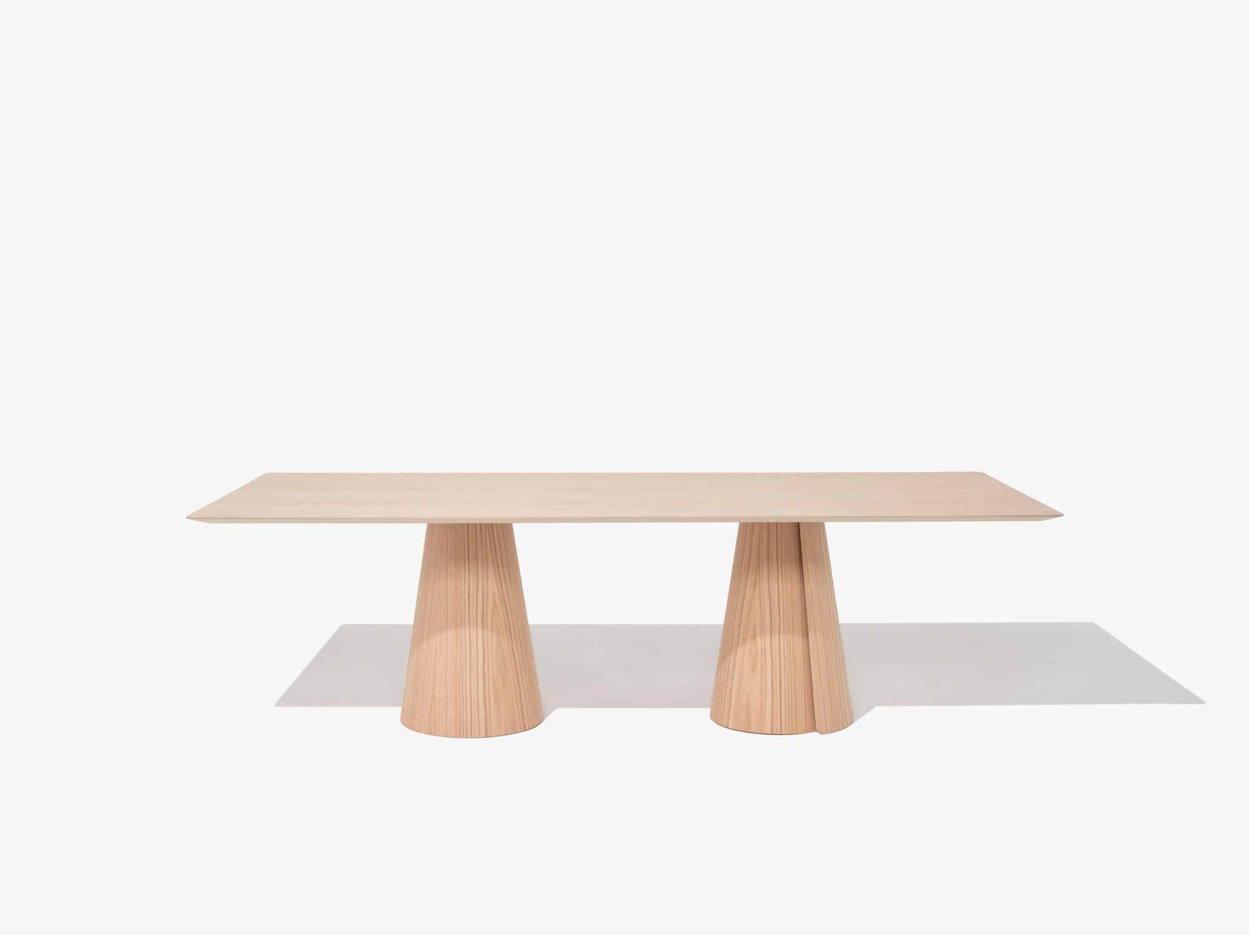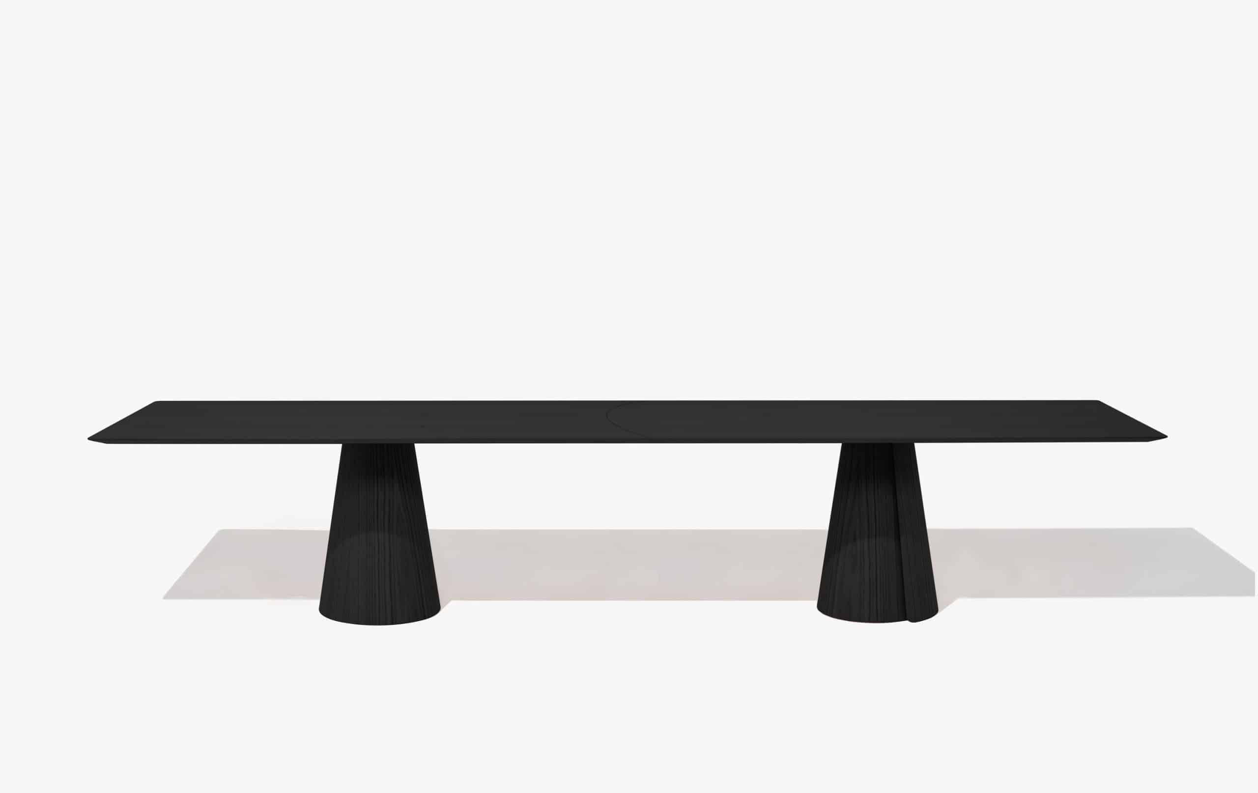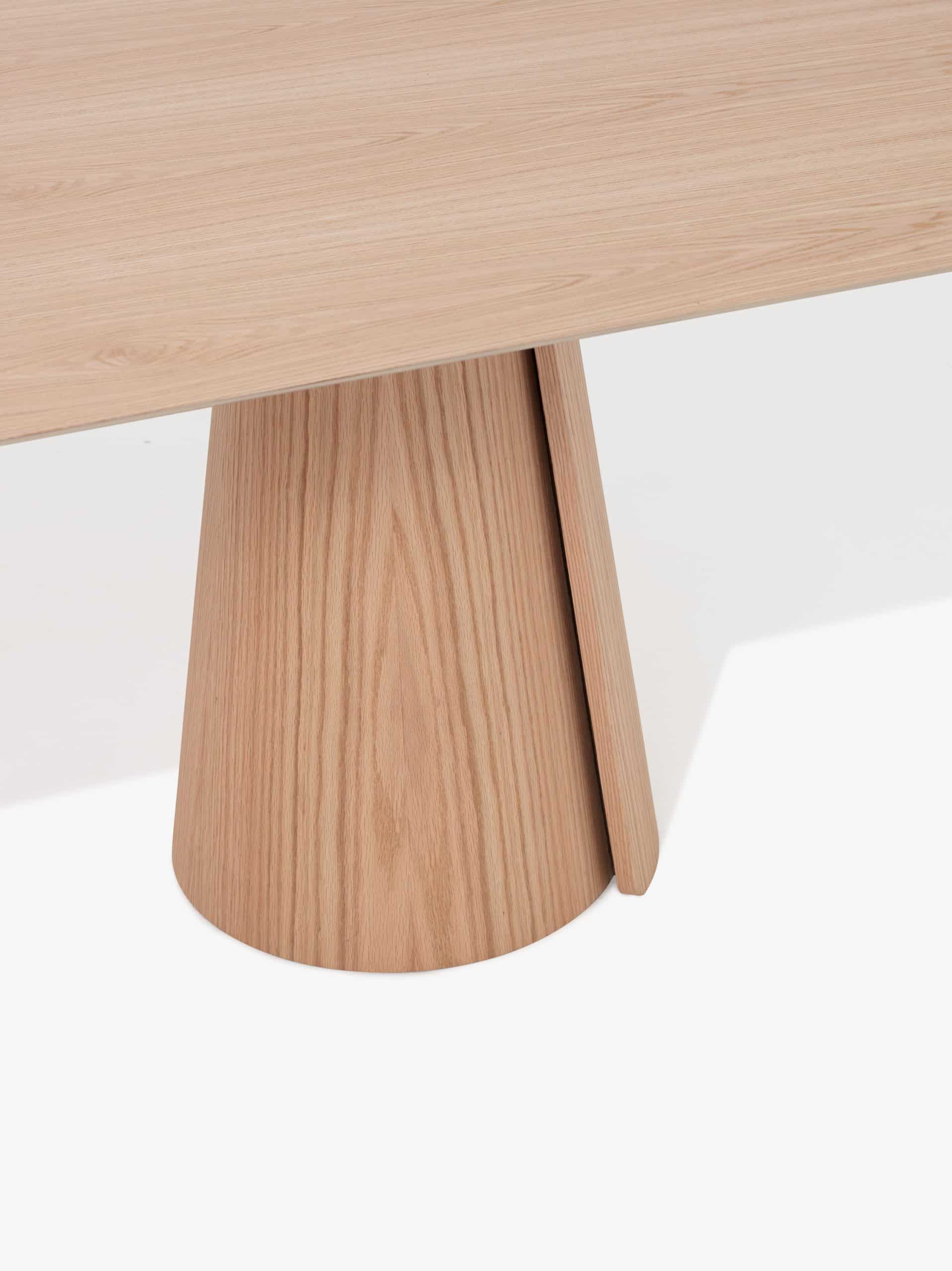 A mesa Volta faz referência à natureza na sua impermanência. O detalhe da base sugere os movimentos naturais e remete às lógicas de construção da natureza, enquanto a superfície com veio evidente da lâmina natural de madeira reforça o conceito orgânico da peça. A nova adição à série Volta é formada por duas bases, estrutura de metal para reforço e tampo bipartido a partir de 320cm de largura.