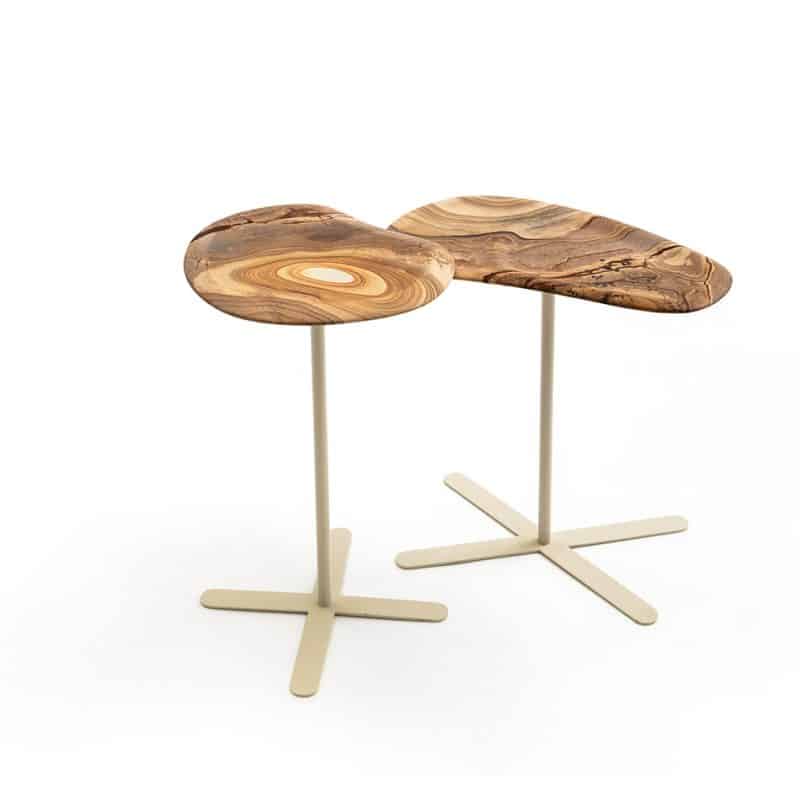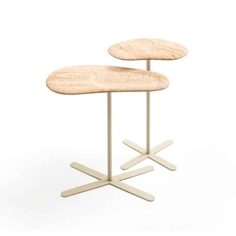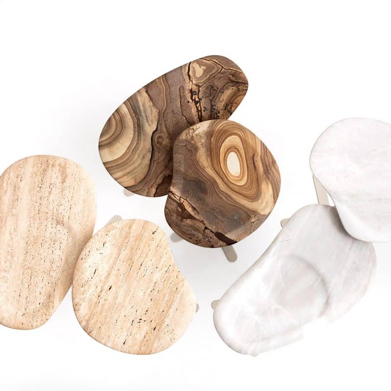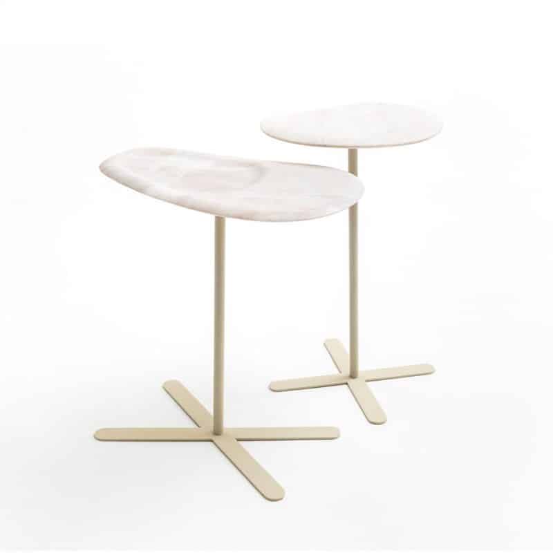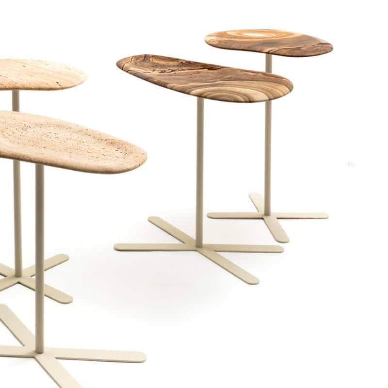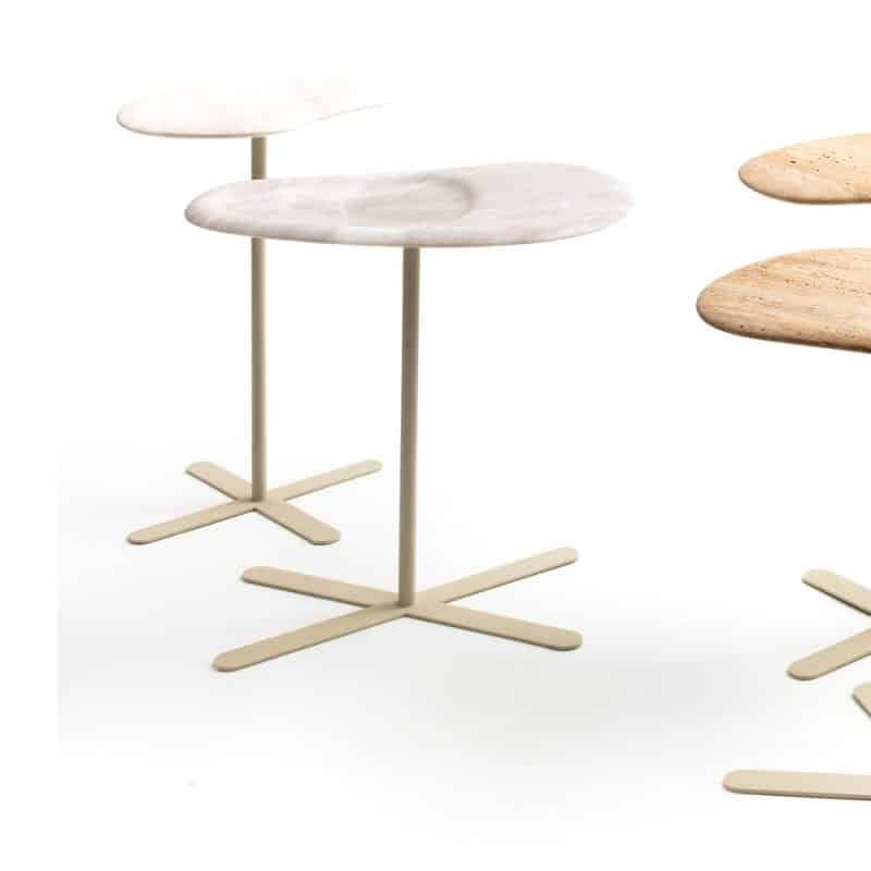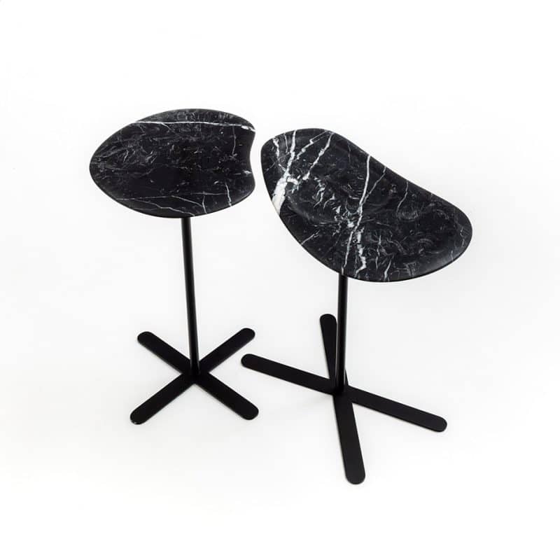 Mesas laterais com tampo de pedra usinada e base de aço com pintura eletrostática padrão para cada pedra: bege, cinza ou preto.