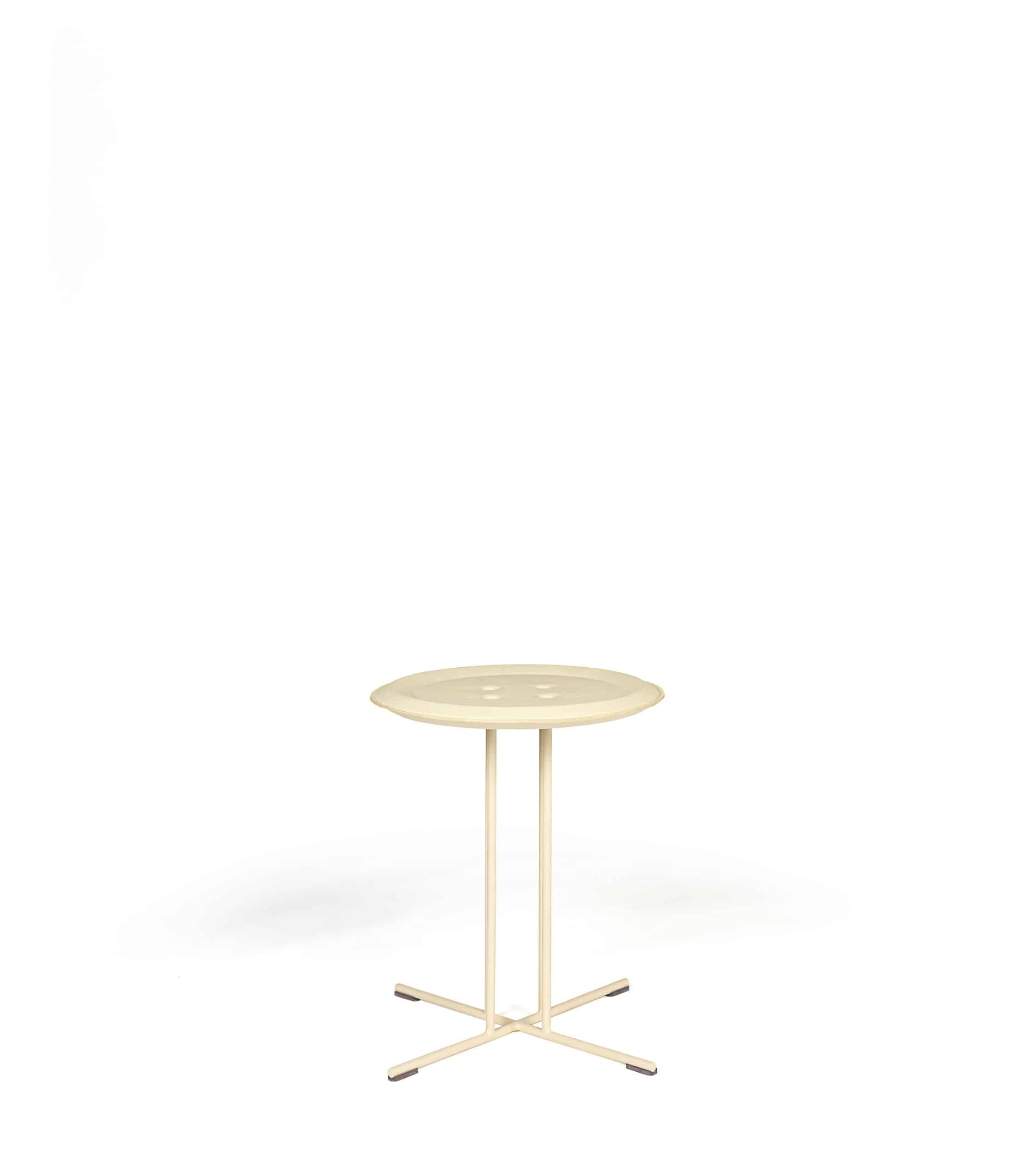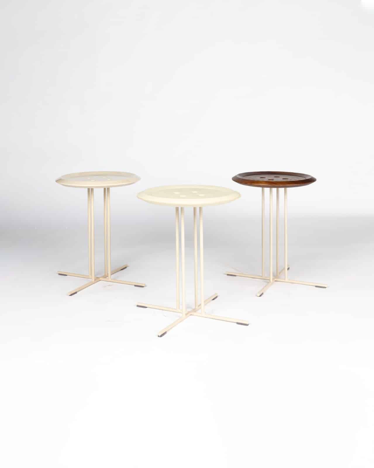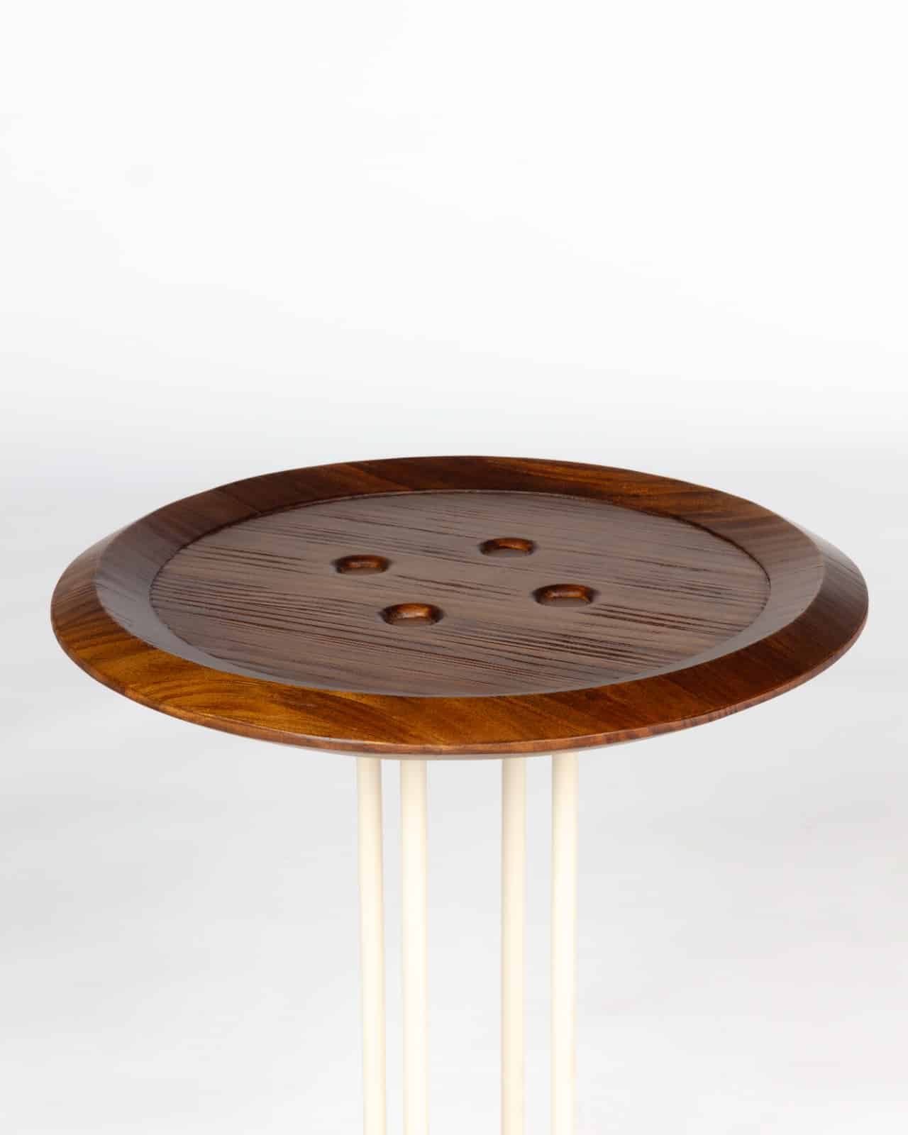 A mesa lateral Botão esbanja criatividade. A peça traz o design clássico do acessório da alfaiataria, produzida em madeira, com acabamento escovado, e pés em metal. Temos opções de tampo em madeira, laca e couro.
