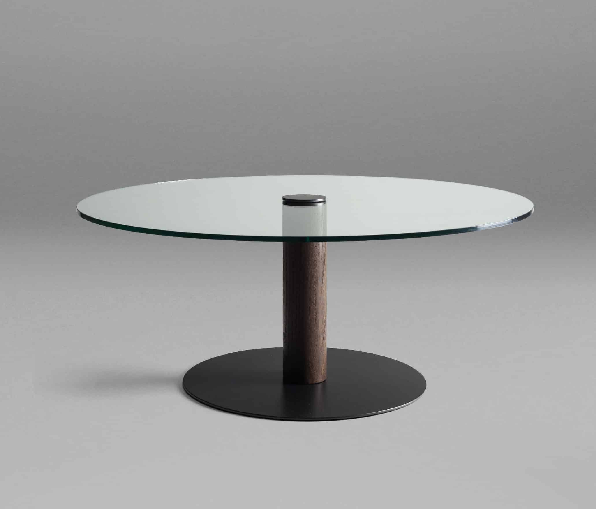 Com uma base em metal, seguida pelo pescoço laminado, a mesa Delta Lateral, exprime elegância e requinte. Seu tampo redondo em vidro, finaliza o design, traduzindo leveza à peça.