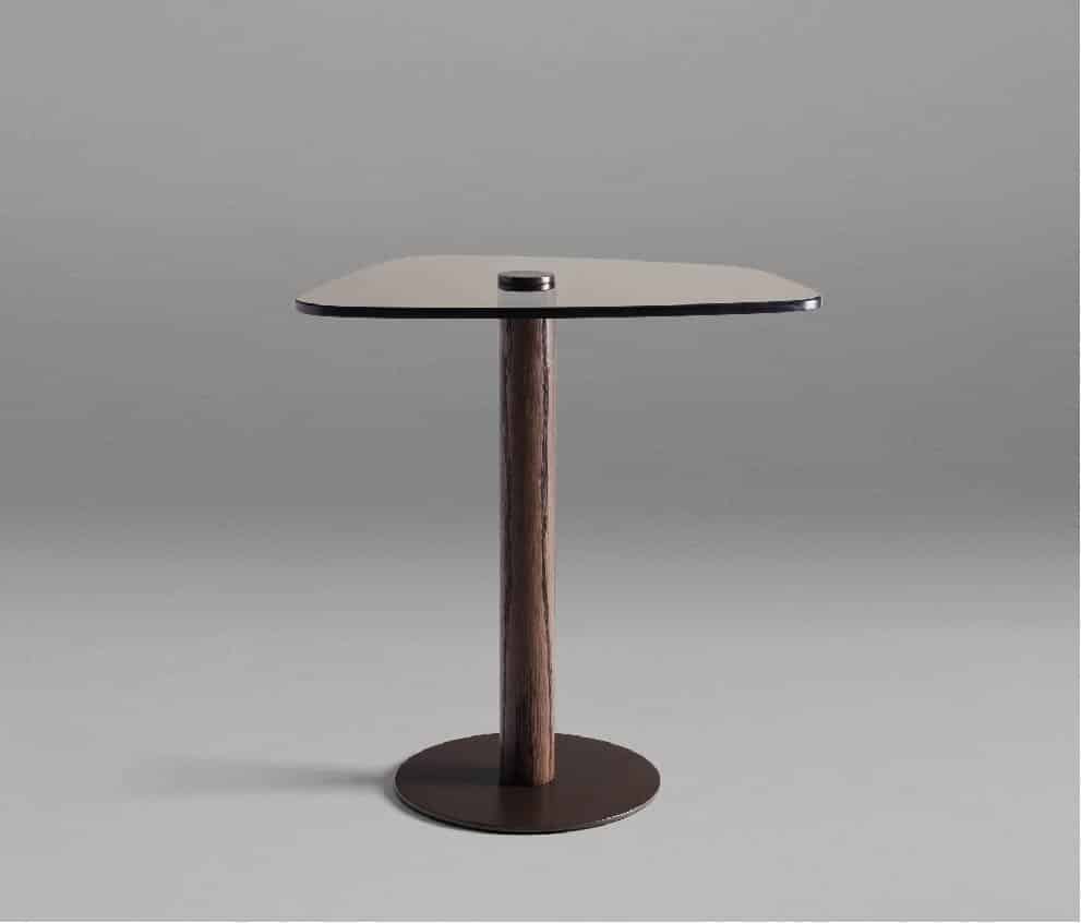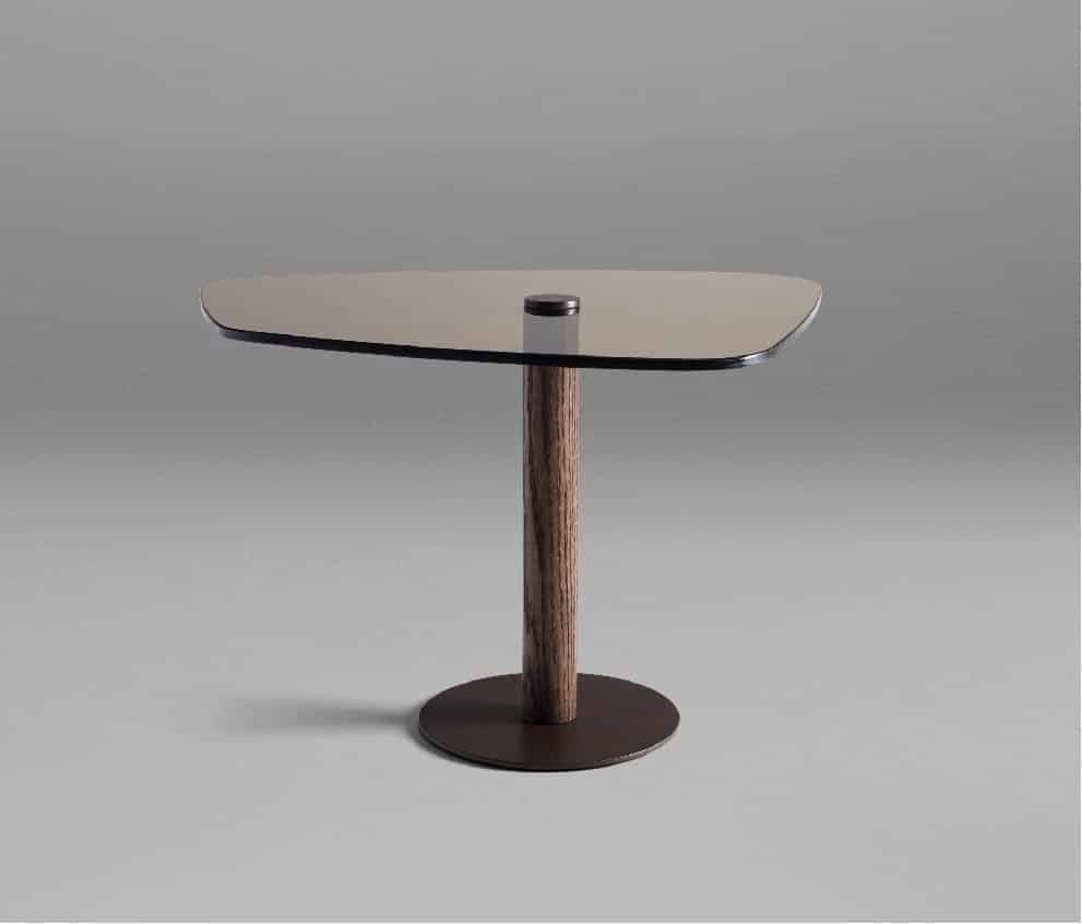 Além de proporcionar leveza e equilíbrio à mesa, seu tampo em vidro, de formato irregular e orgânico, é o destaque. Sua base tubular em metal laminado, confere elegância e sutileza à peça.