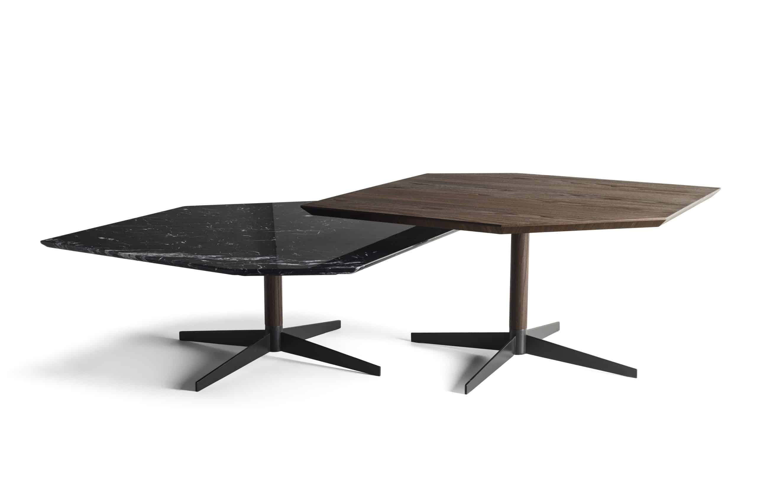 Sua base em forma de cruz traz leveza e equilíbrio ao produto. Fugindo do convencional, possui diferentes alturas que oferecem maior conforto e comodidade. Seu tampo, de formato irregular, pode ser confeccionado em madeira ou mármore e o acabamento chanfrado finaliza o destaque da peça.