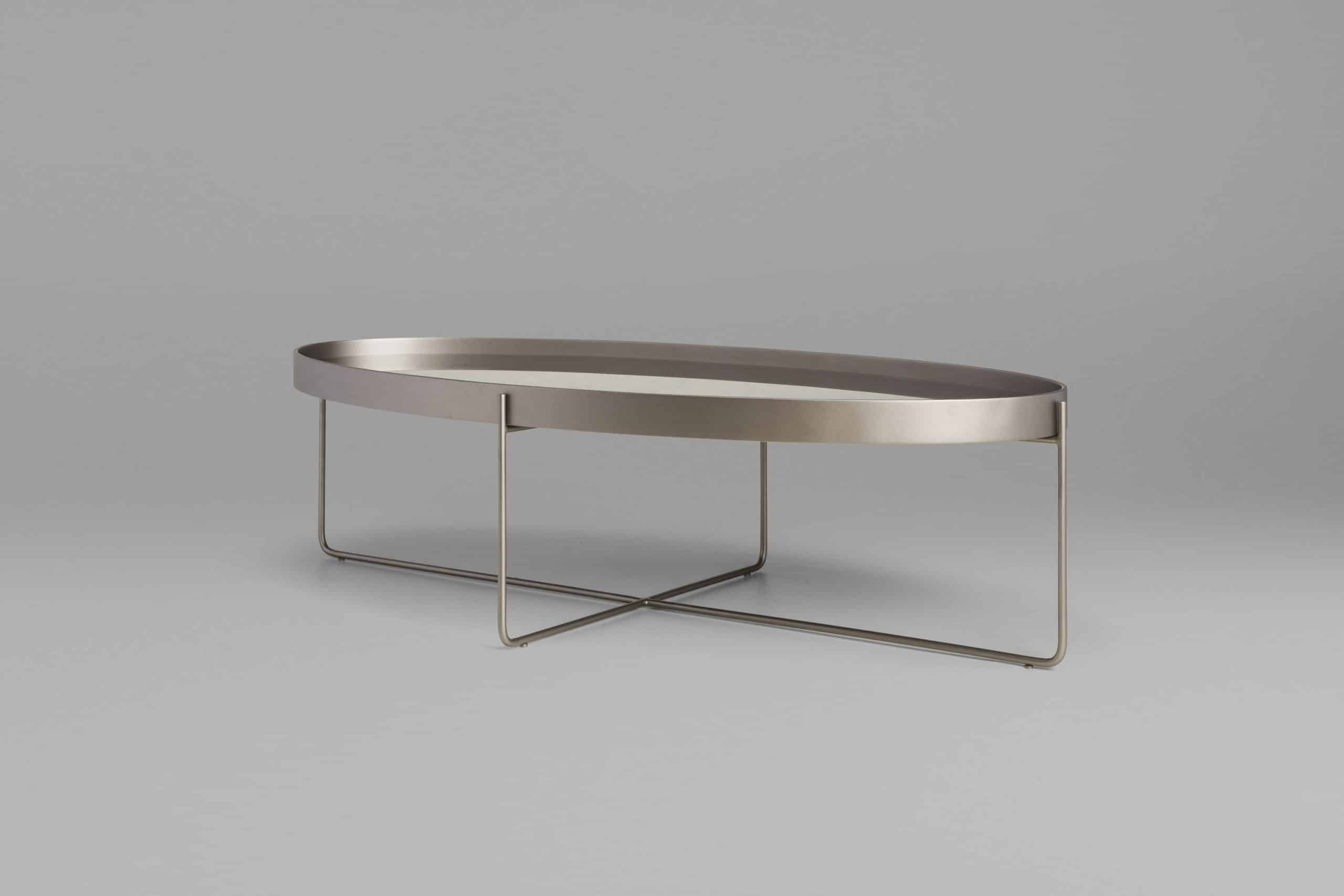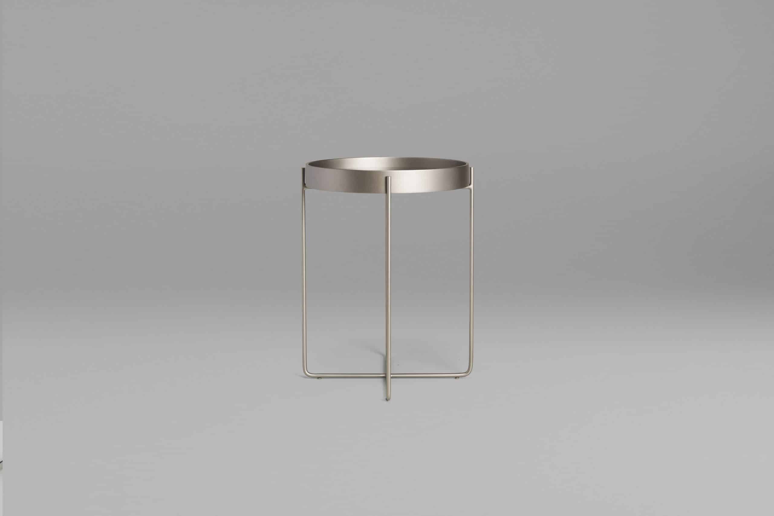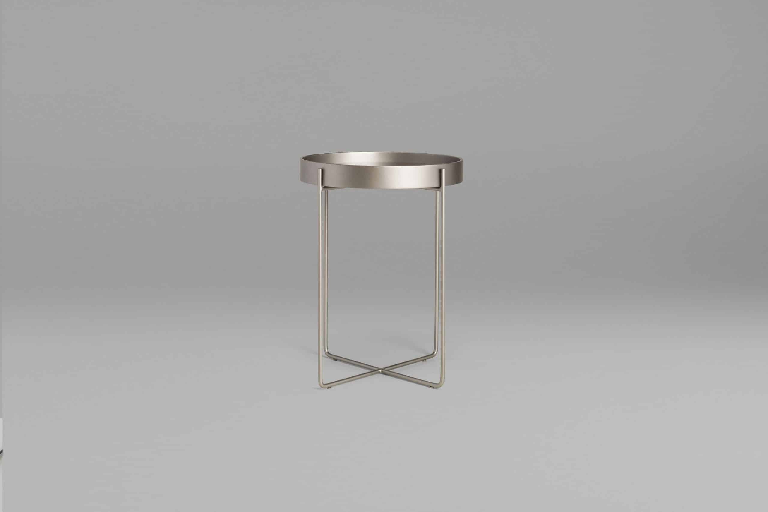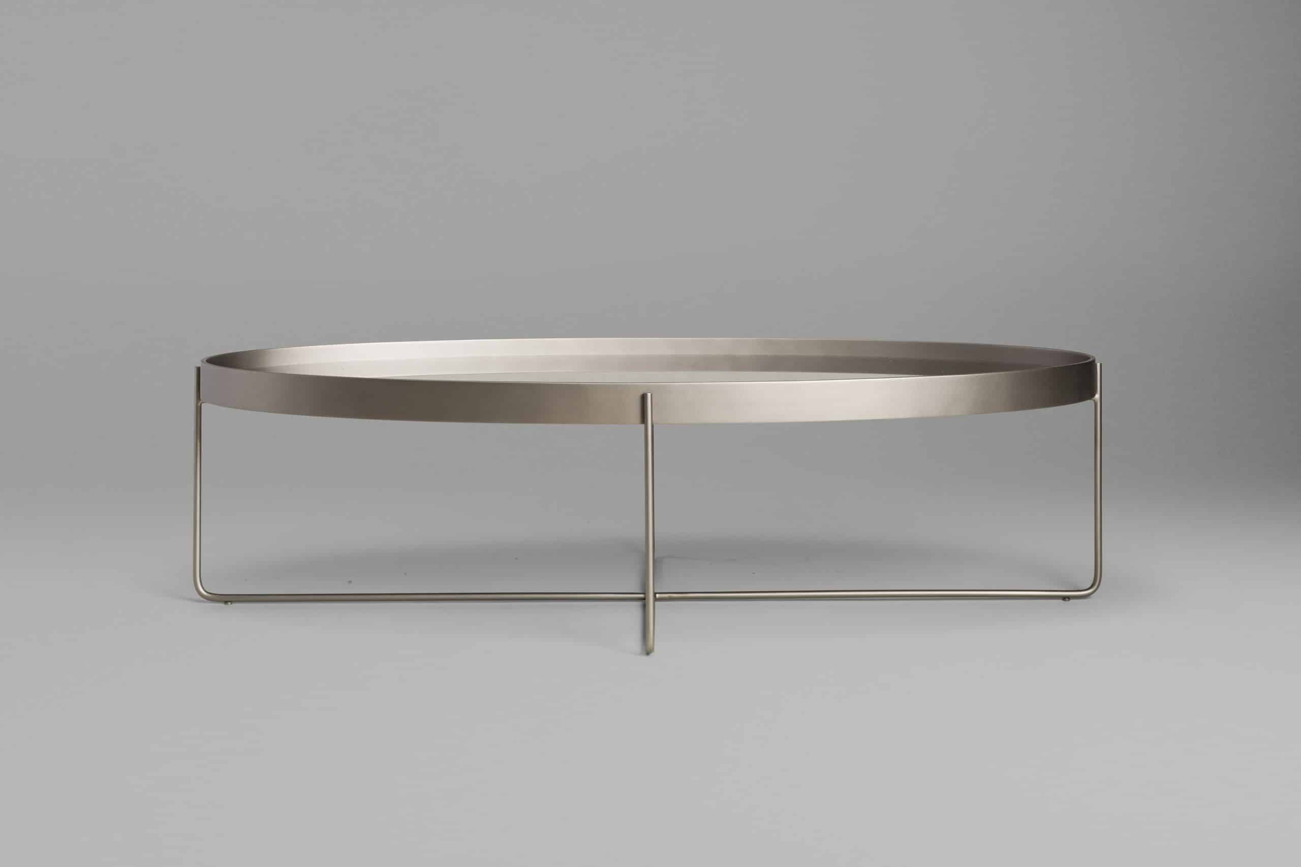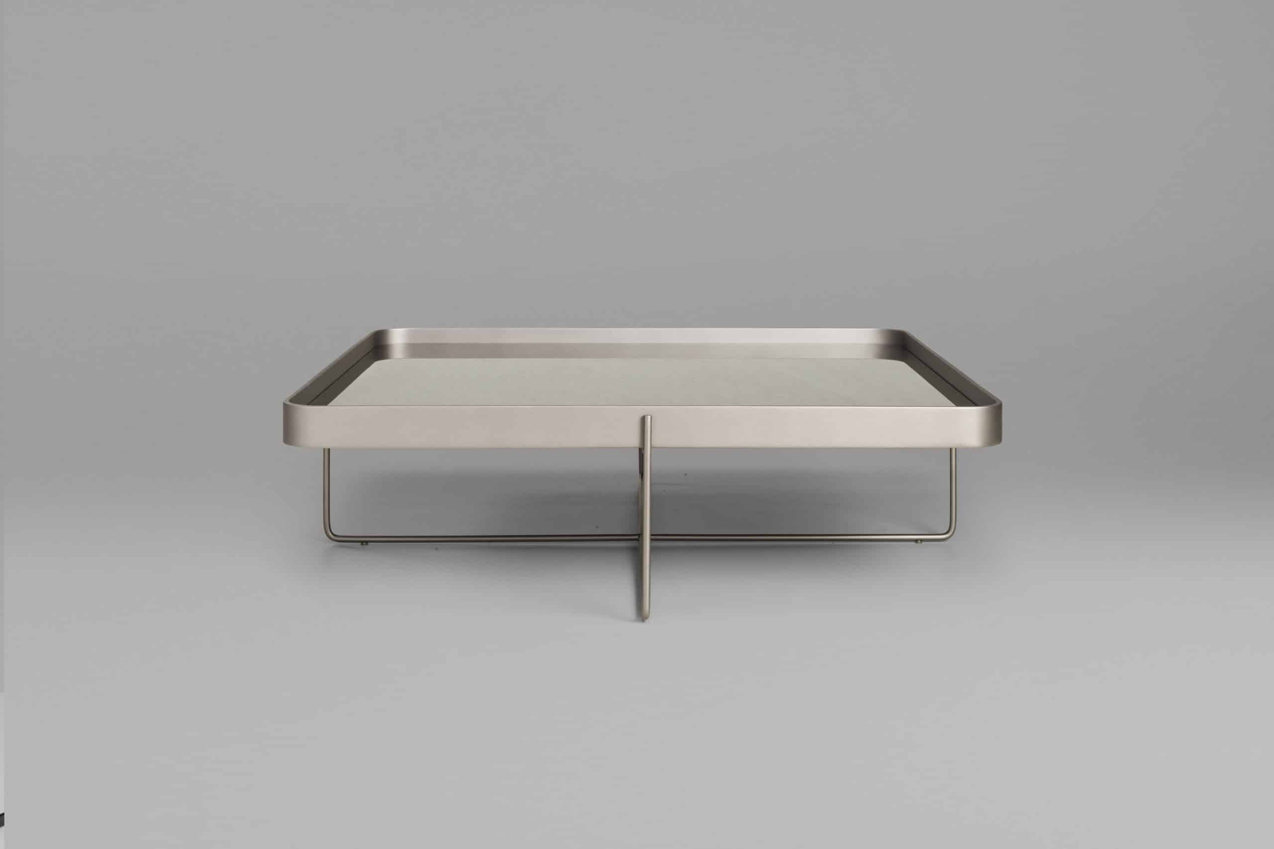 A mesa Tubos recebe esse nome tanto pela estrutura cilíndrica que compõe a base, quanto do tampo, que também sugere uma seção tubular. A estrutura metálica com base sobreposta em cruz tem as extremidades superiores alongadas para receber o tampo em madeira laminada. As bordas do tampo conferem um detalhe especial para essa mesa.