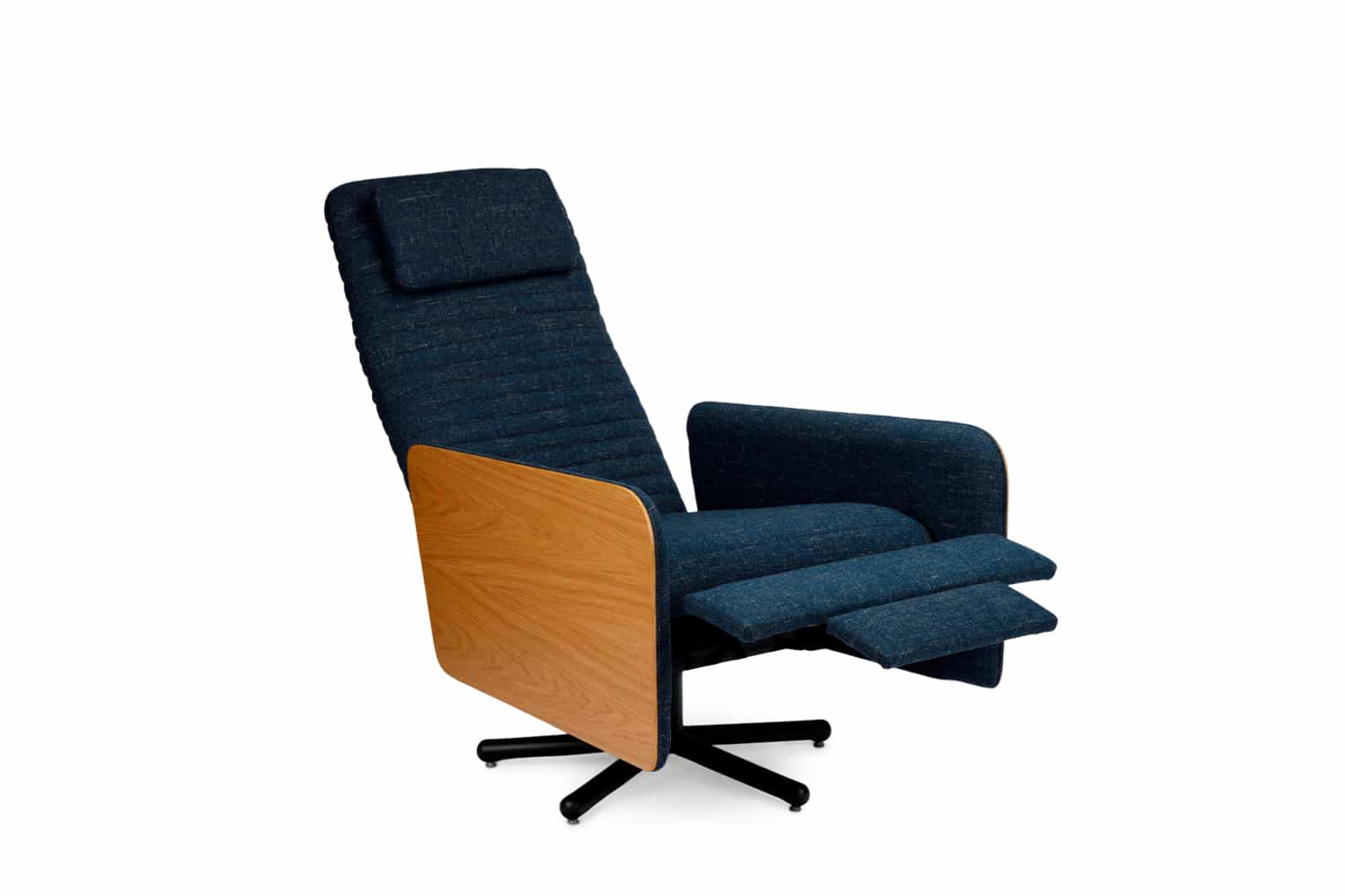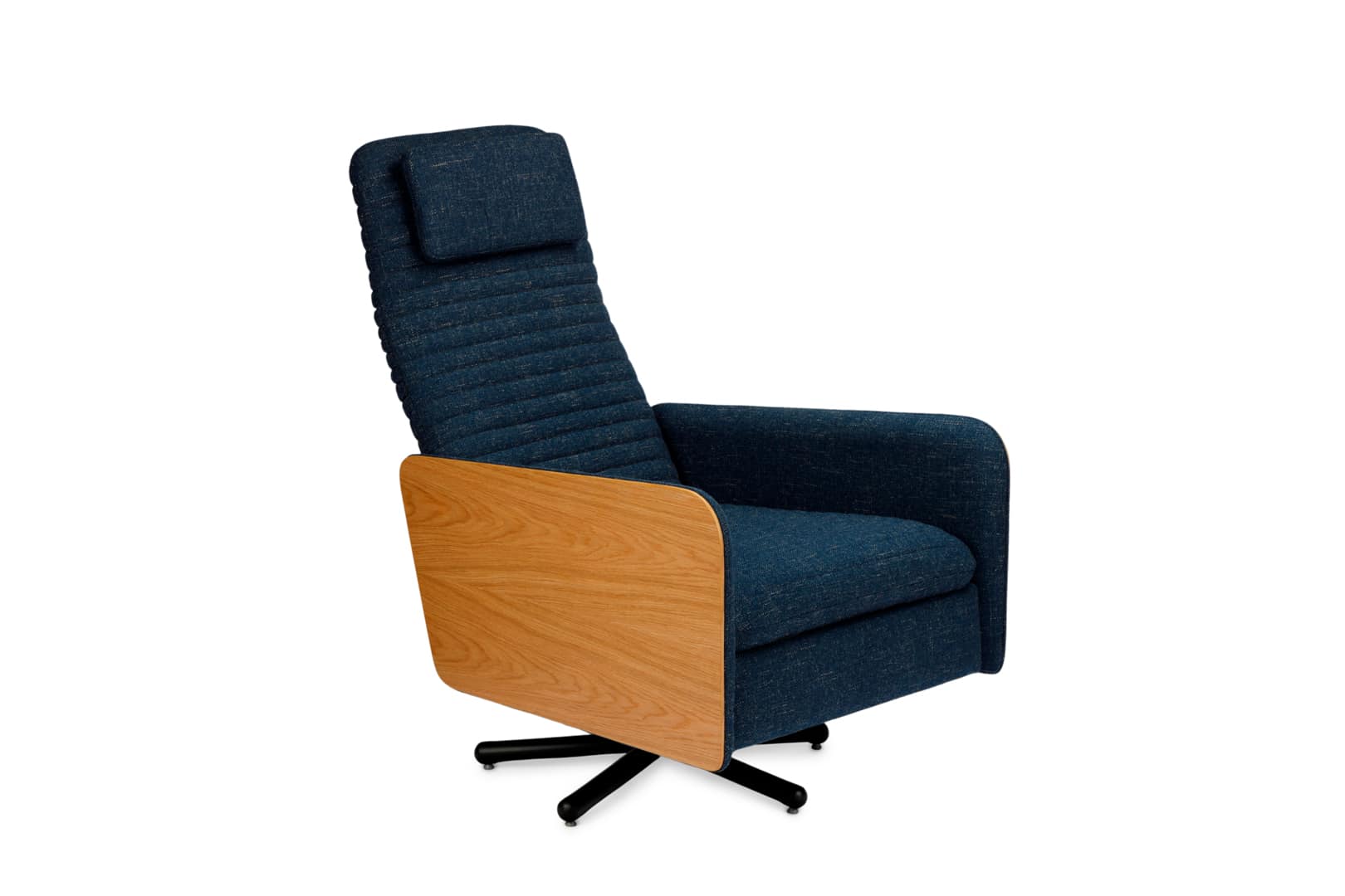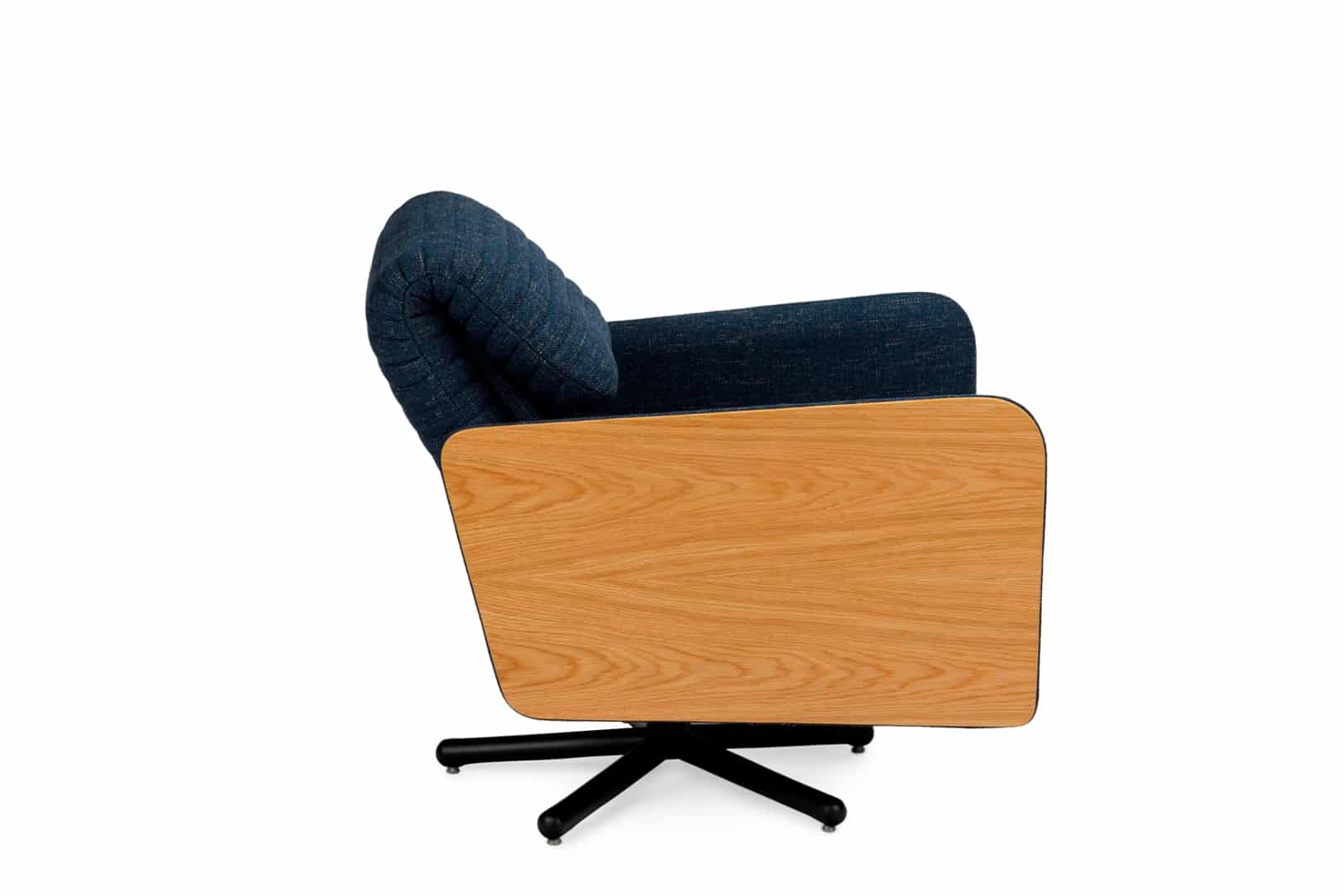 Mecanismo em aço carbono, base em alumínio, laterais com lâmina de madeira natural e estofado em espuma.