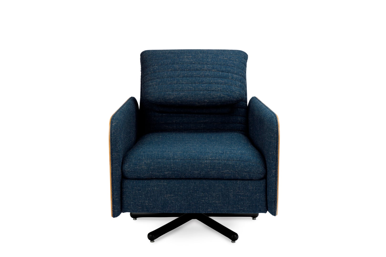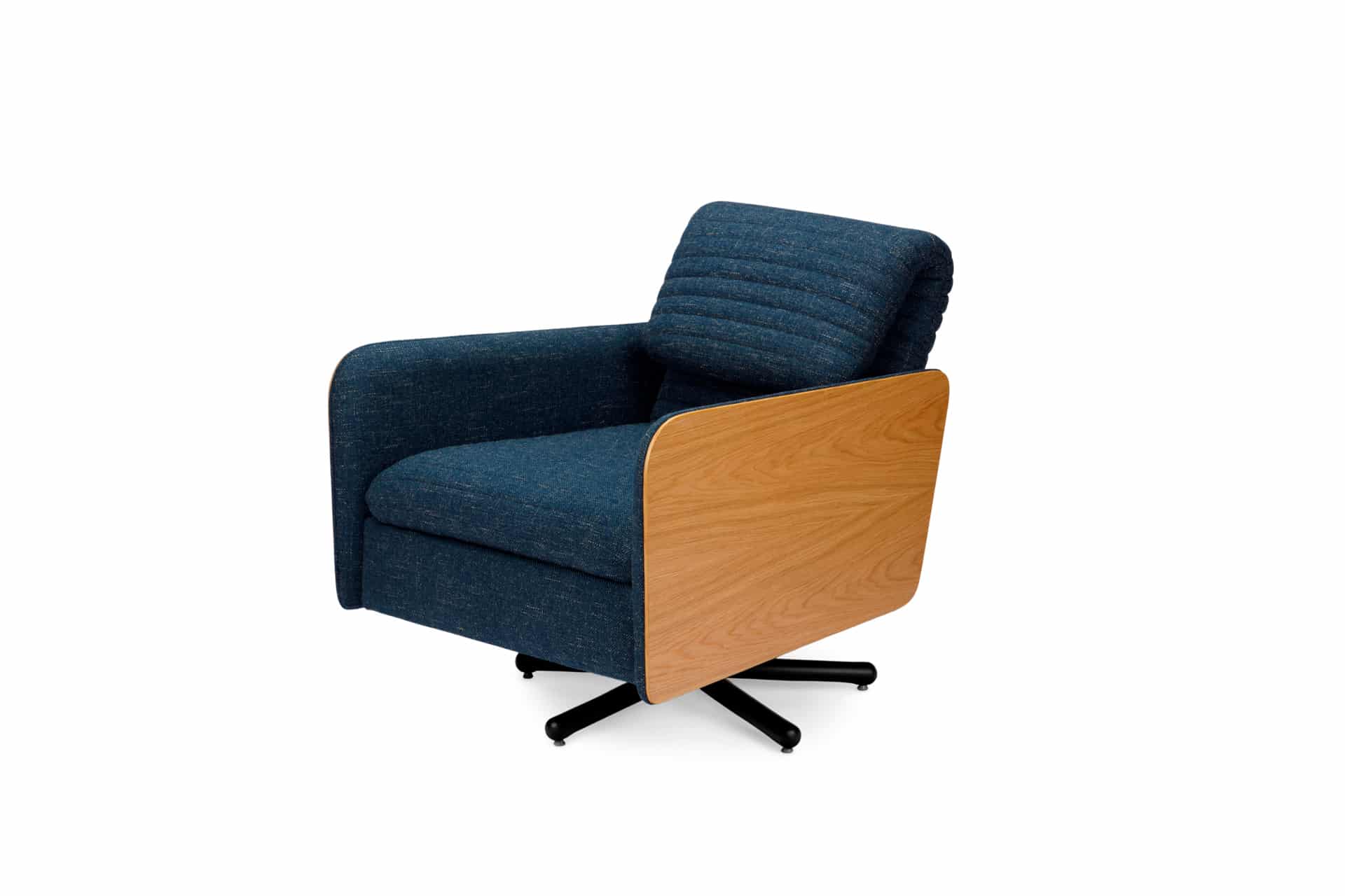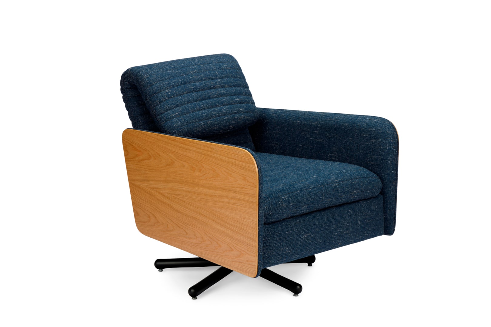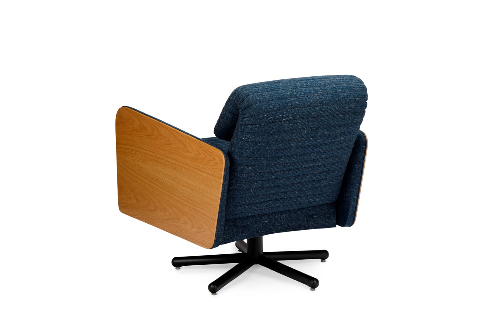 Mecanismo em aço carbono, base em alumínio, laterais com lâmina de madeira natural e estofado em espuma.