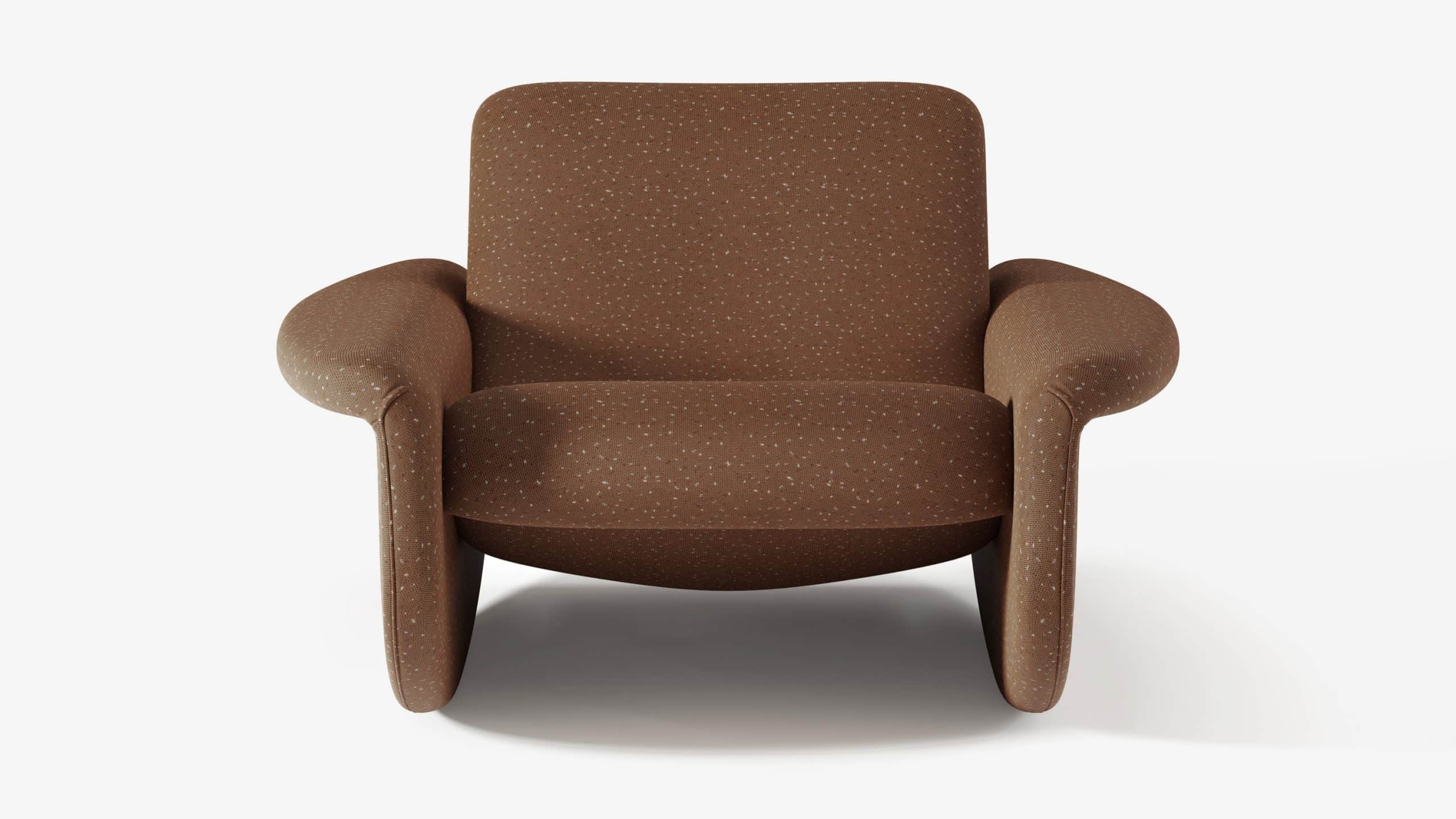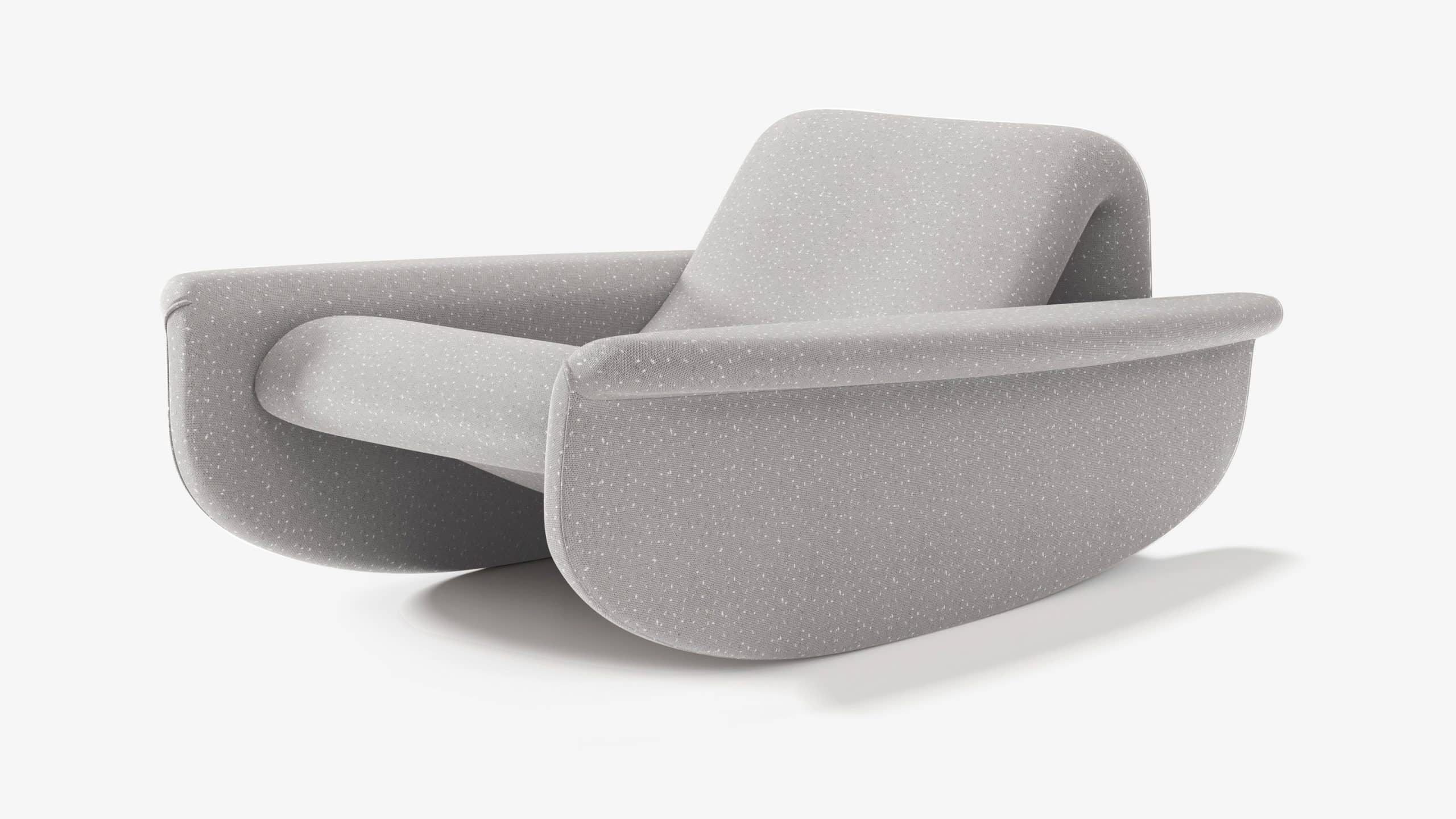 Canoa é uma poltrona de balanço que embala como o mar e evoca a sensação de estar sobre as águas. Seu desenho é curvo e sinuoso e seu assento tem ângulo acolhedor, onde o corpo fica quase deitado, relaxado e entregue à deriva. A altura consente o vaivém e os pés, próximos do chão, dão firmeza pro ritmo — como dois remos, dão fluidez ou pausa ao descanso. Há, também, calmaria nas águas. O estofado é coberto pelo tecido WE—KNIT — malha 3D feita de PET reciclado, a partir de garrafas que são retiradas dos oceanos.