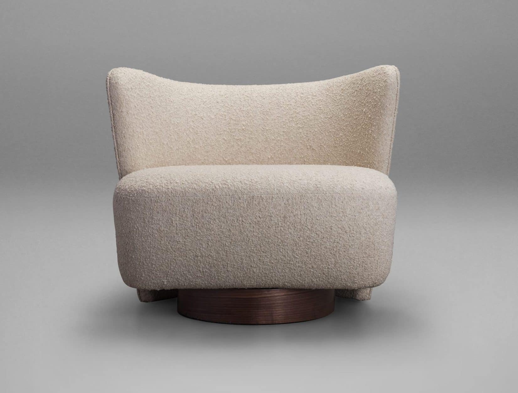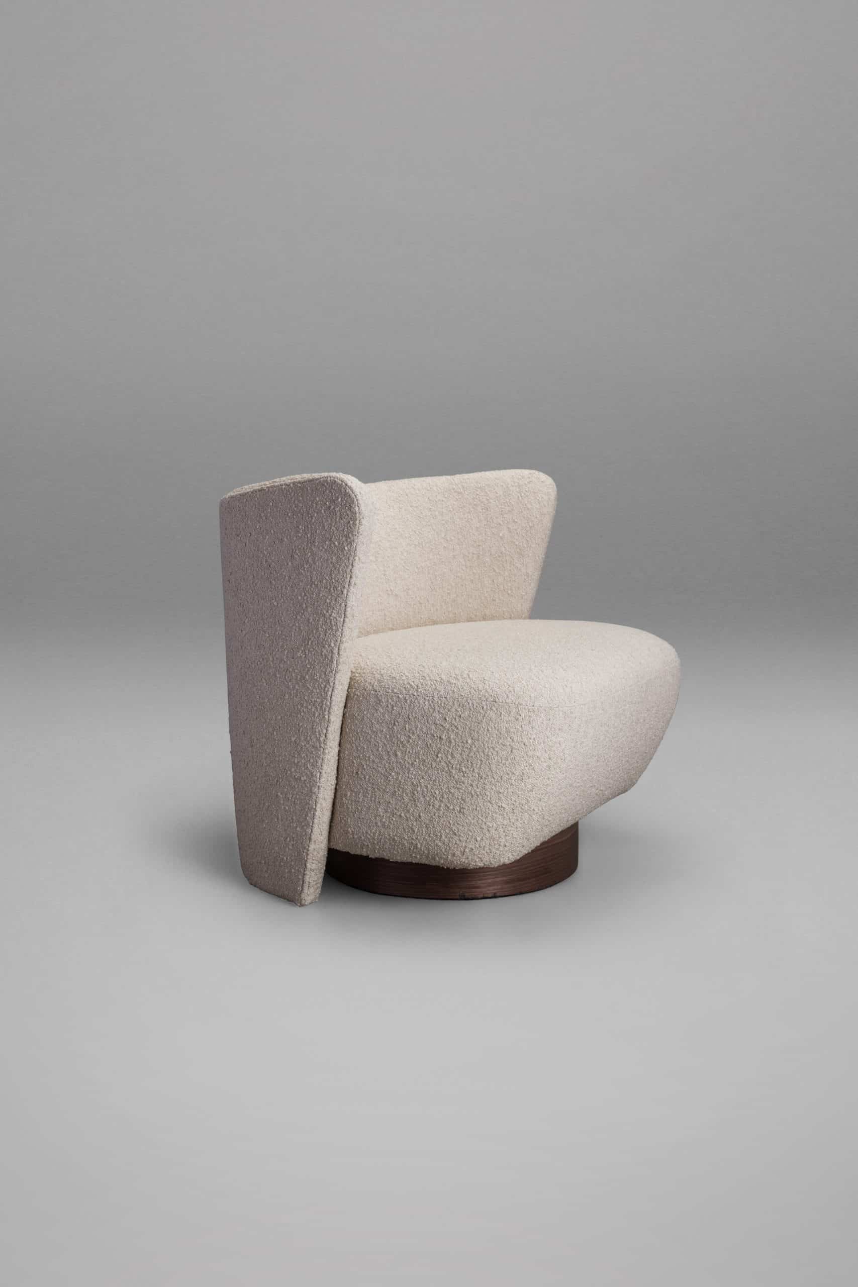 A Poltrona Espaldar G reúne de modo único a sobreposição e mistura de formas, resultando em uma poltrona que atrai pelo movimento, conforto e elegância. O espaldar abraça parte do assento equilibrado sobre a base cilíndrica, revestida em lâmina de madeira. Um design único fruto da parceria entre a arquiteta Juliana Vasconcellos e a Neobox.