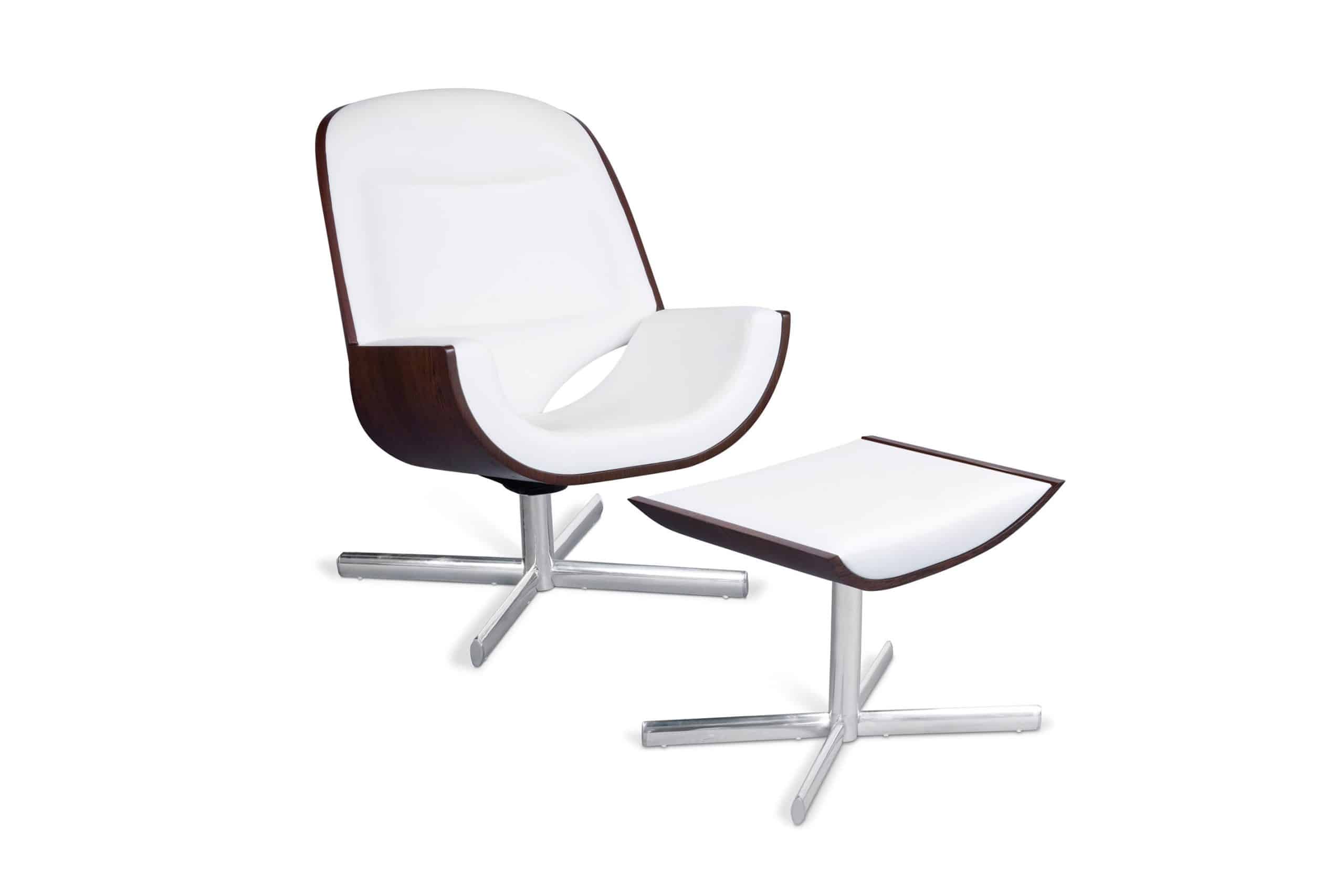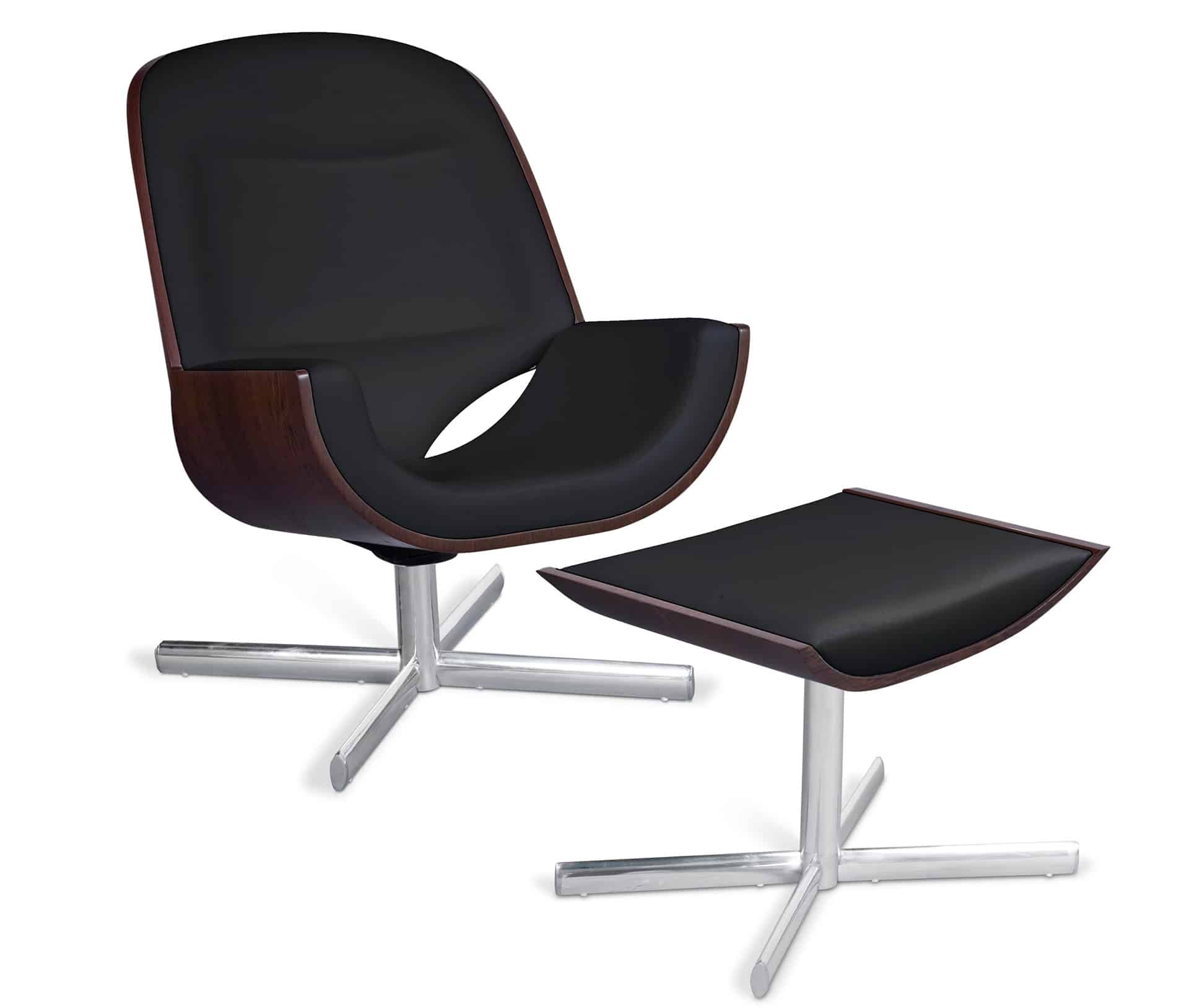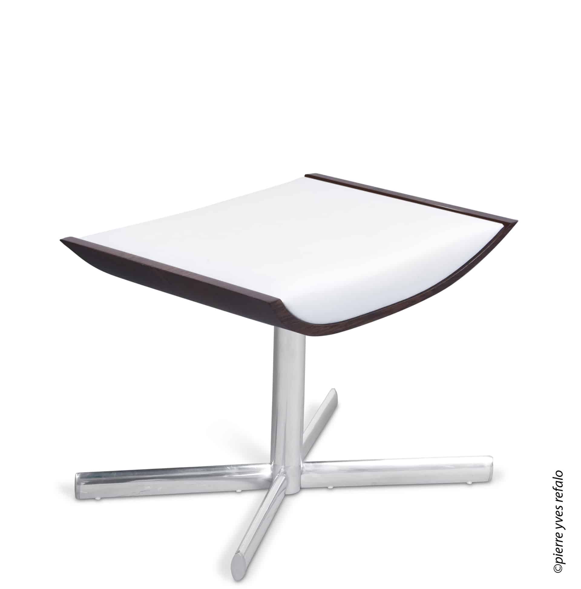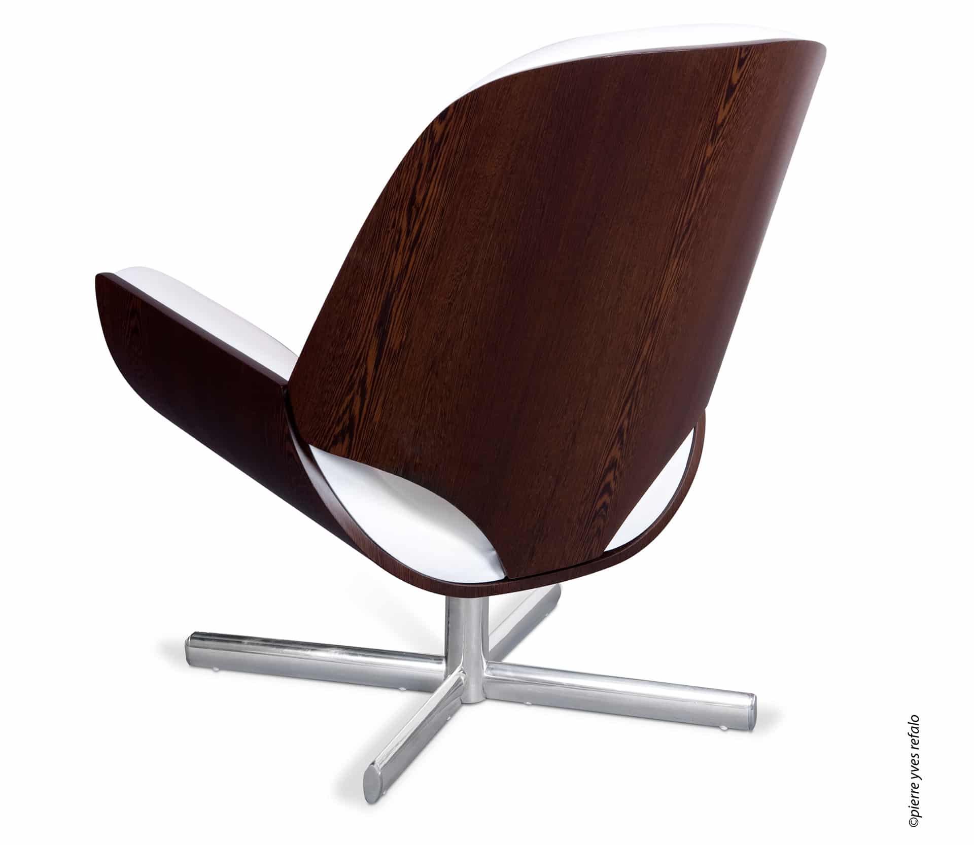Base giratória em alumínio polido e madeira multilaminada curvada.