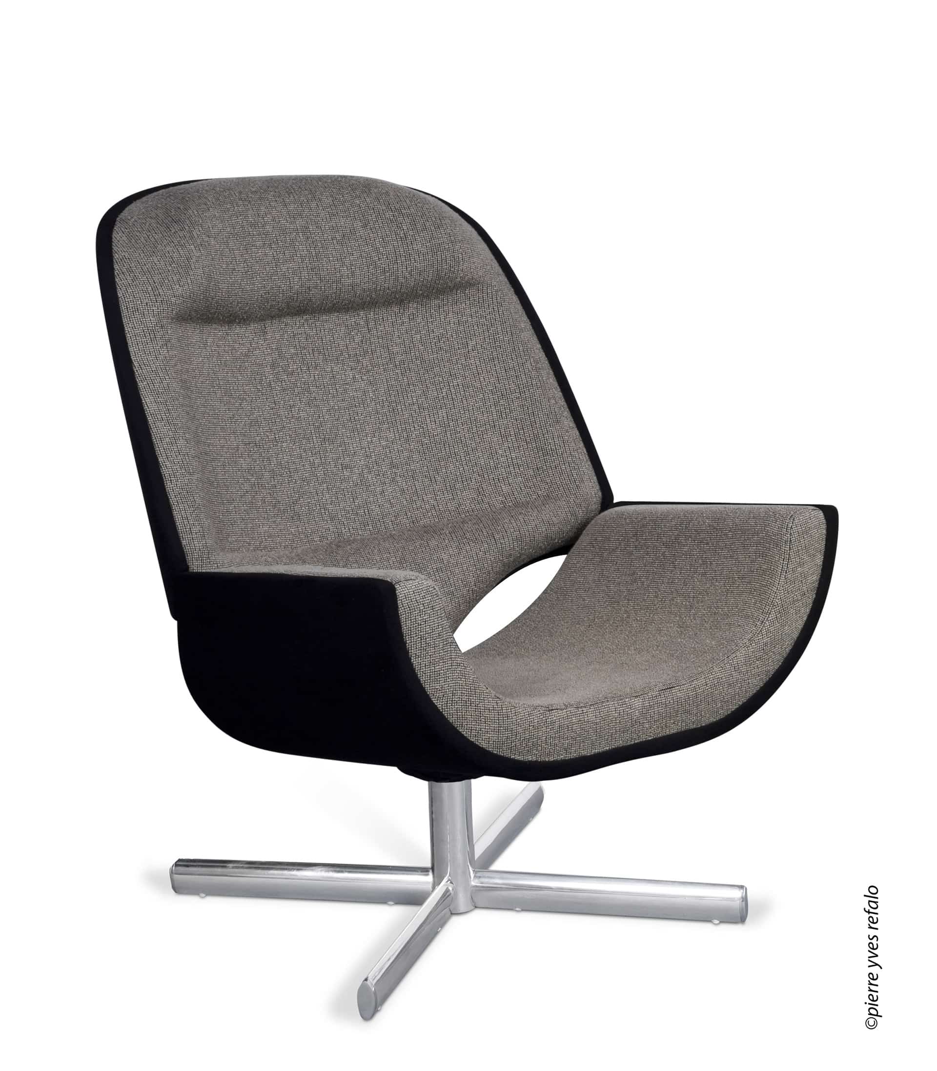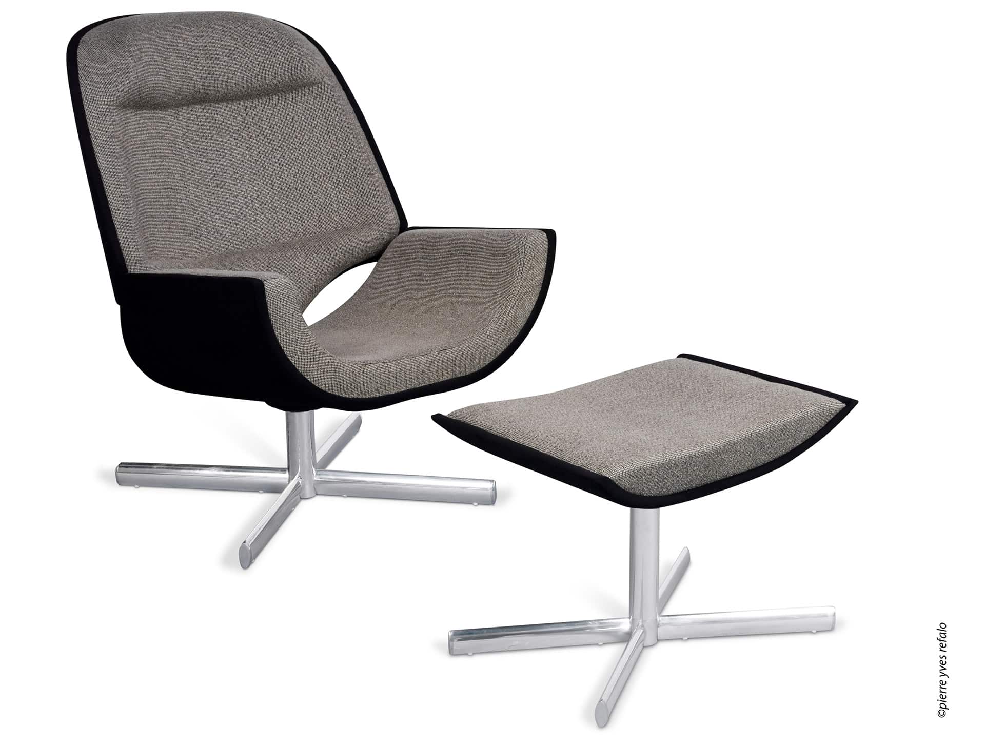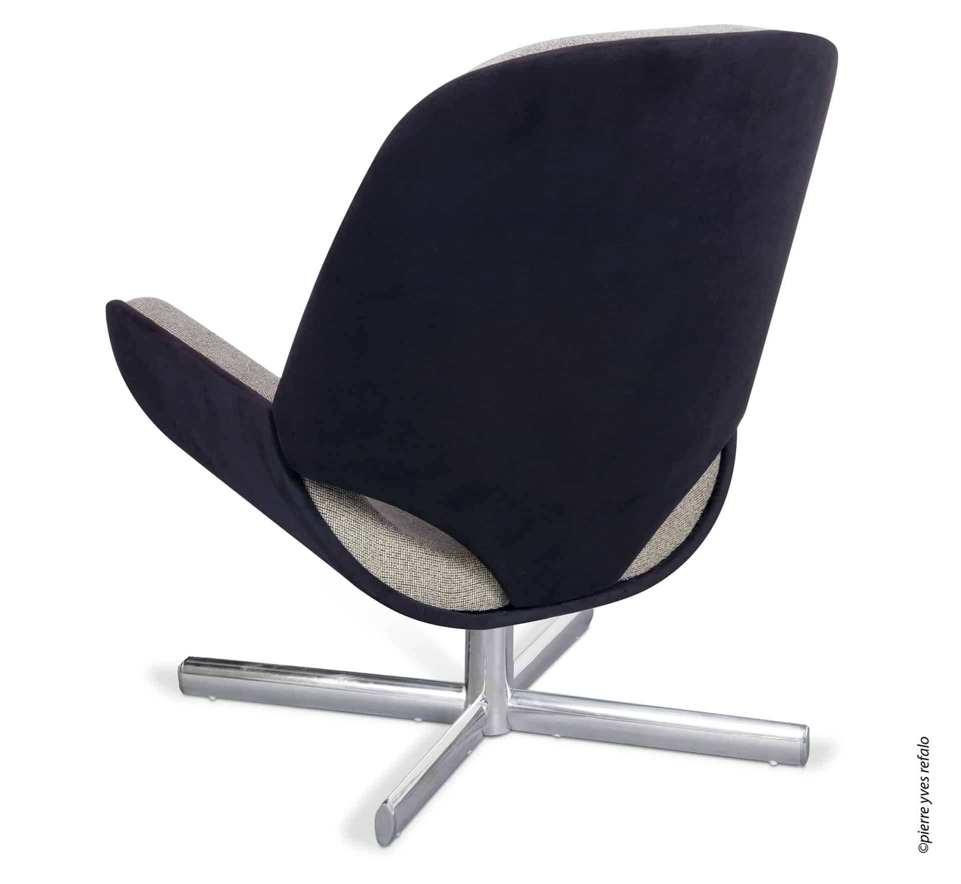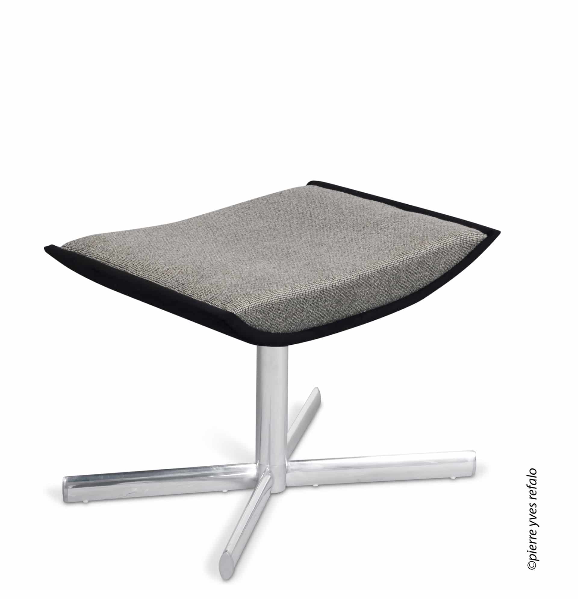 Base giratória em alumínio polido e madeira multilaminada curvada.