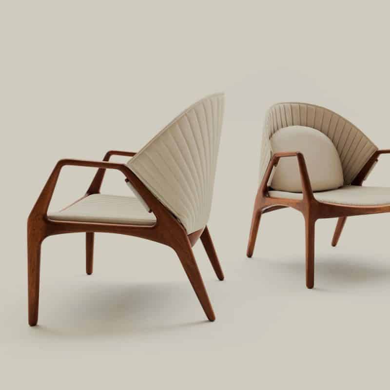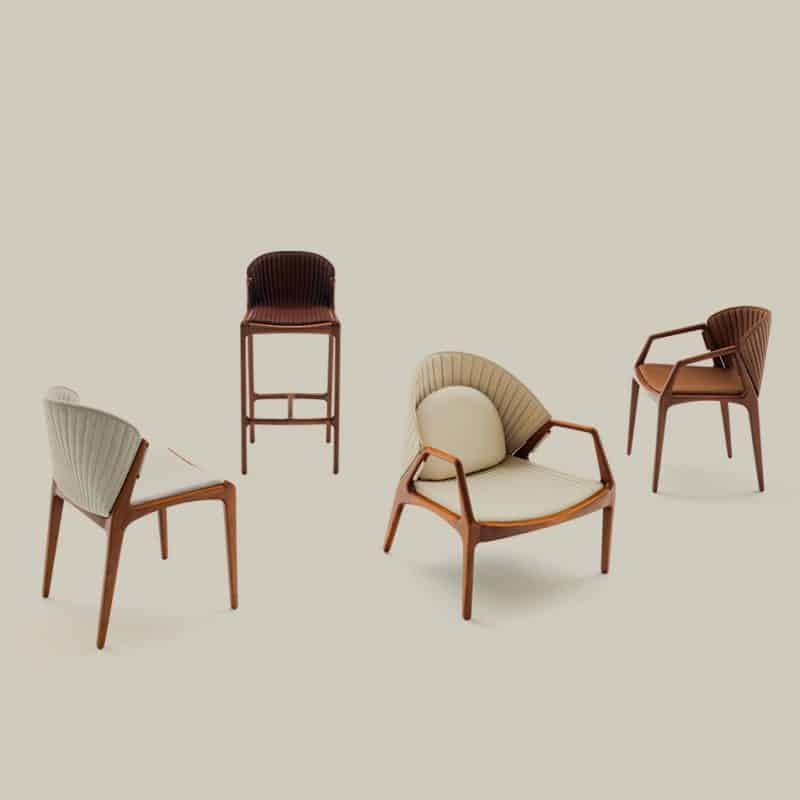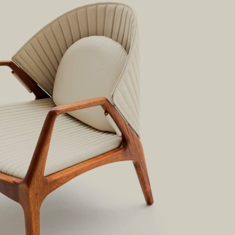 Estrutura em madeira certificada. Acabamento raiado nas arestas aumenta a durabilidade e conforto do mobiliário. Tapeçaria em couro e tecidos.
