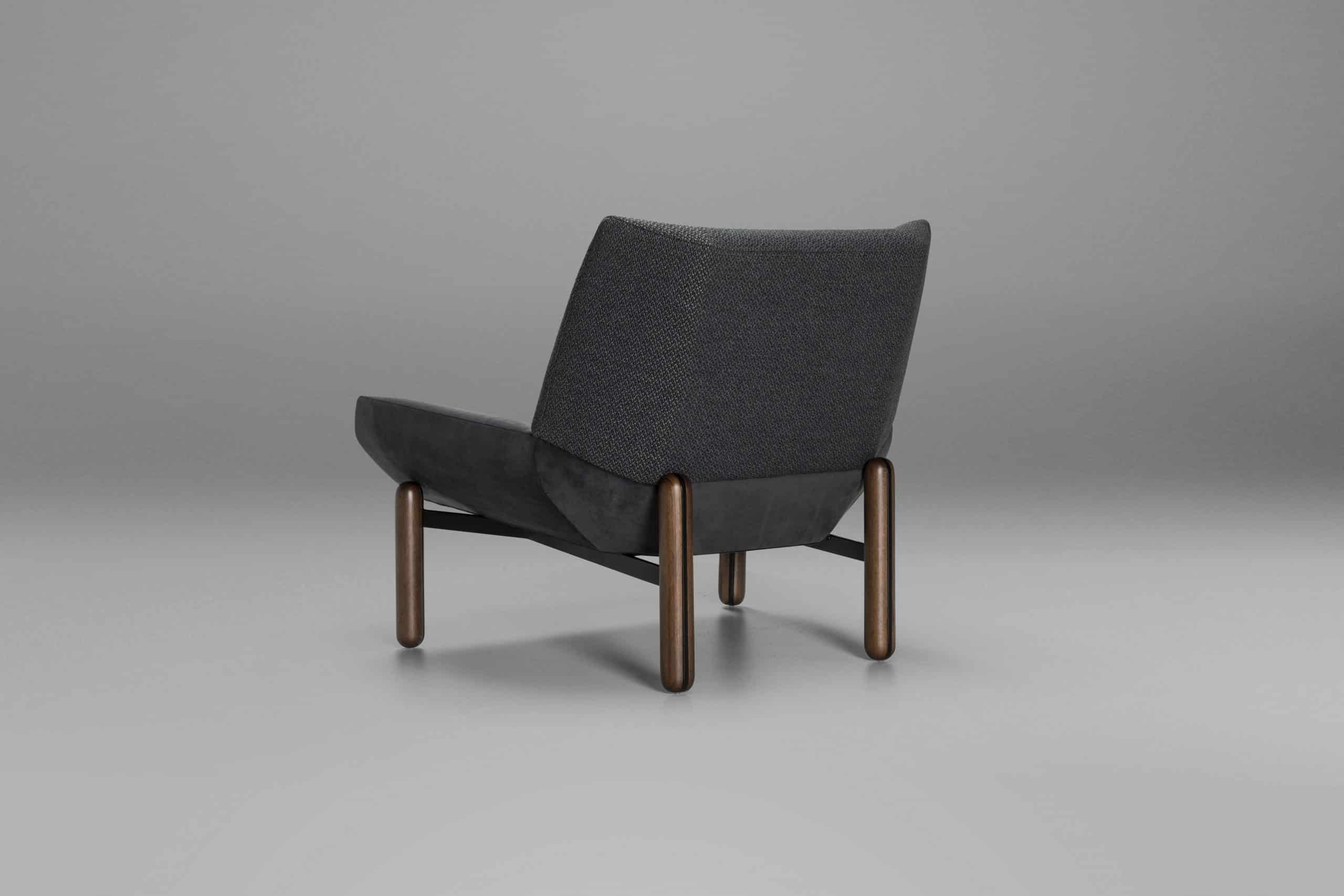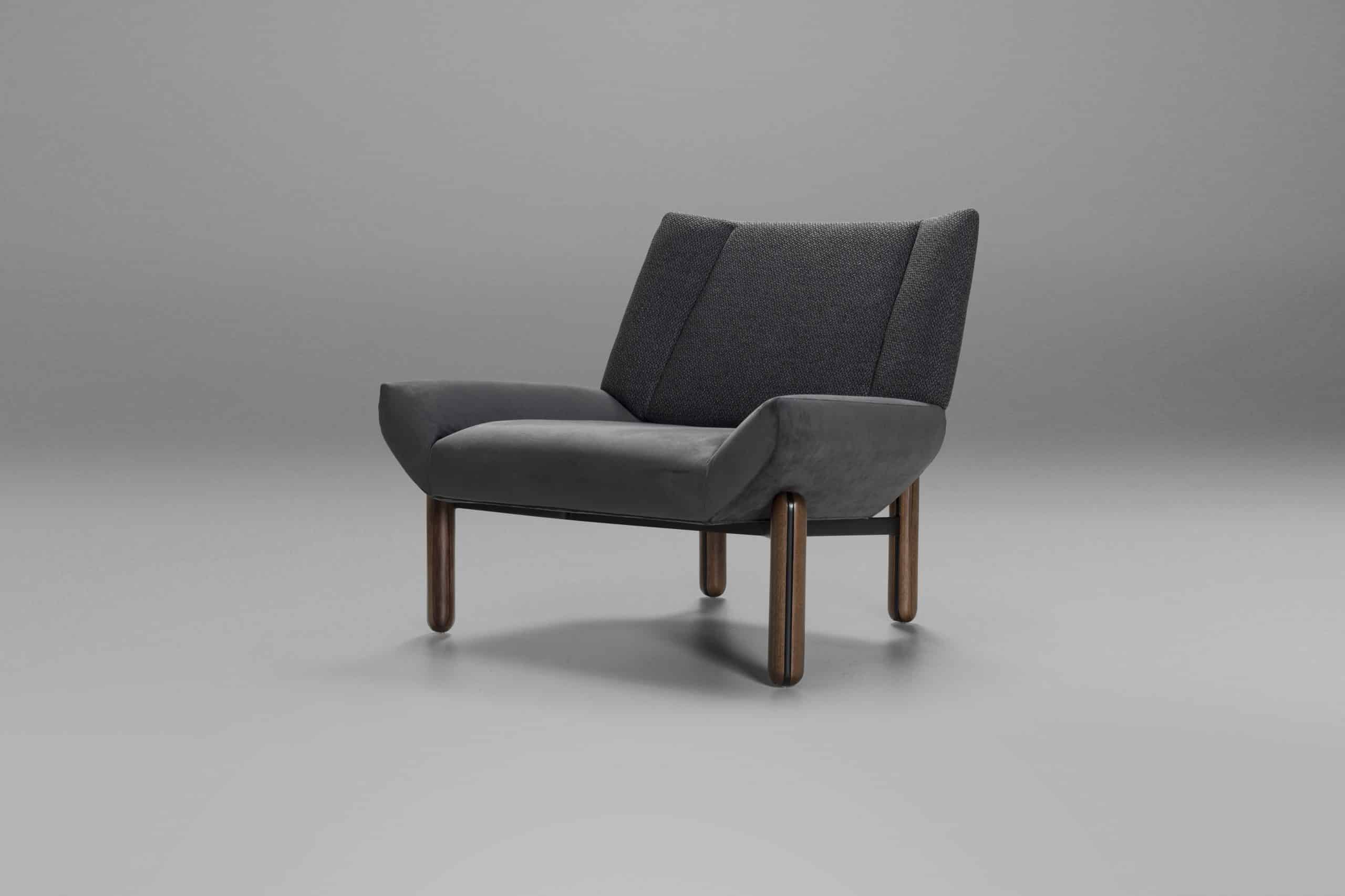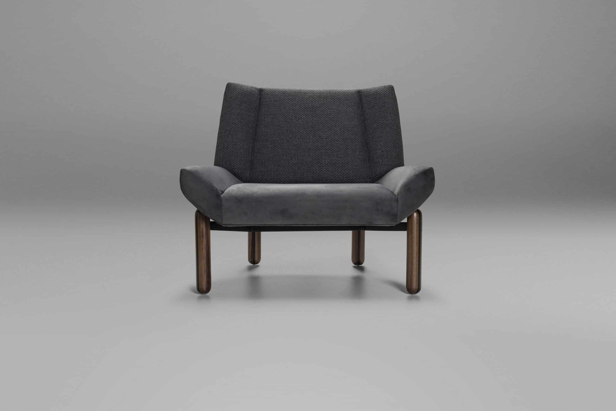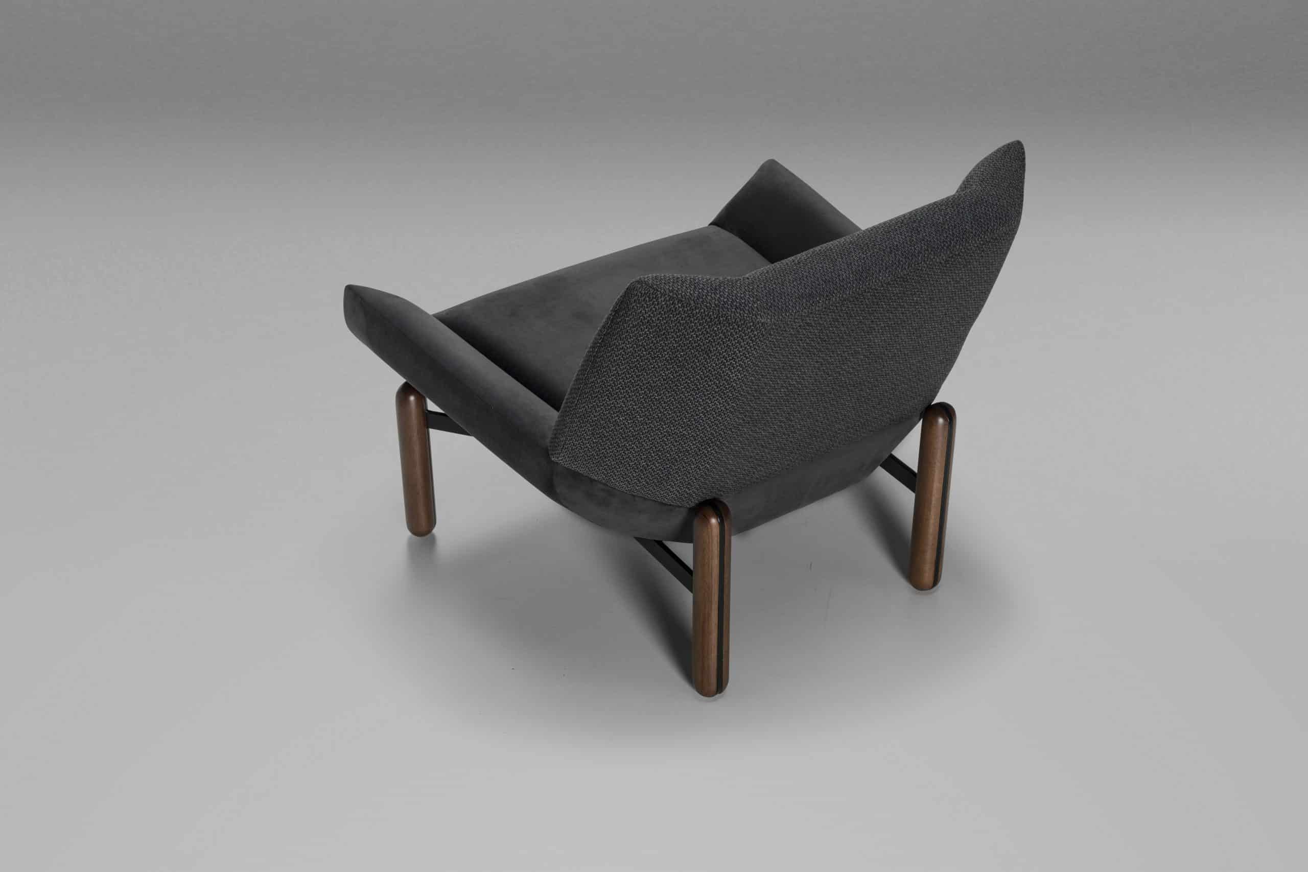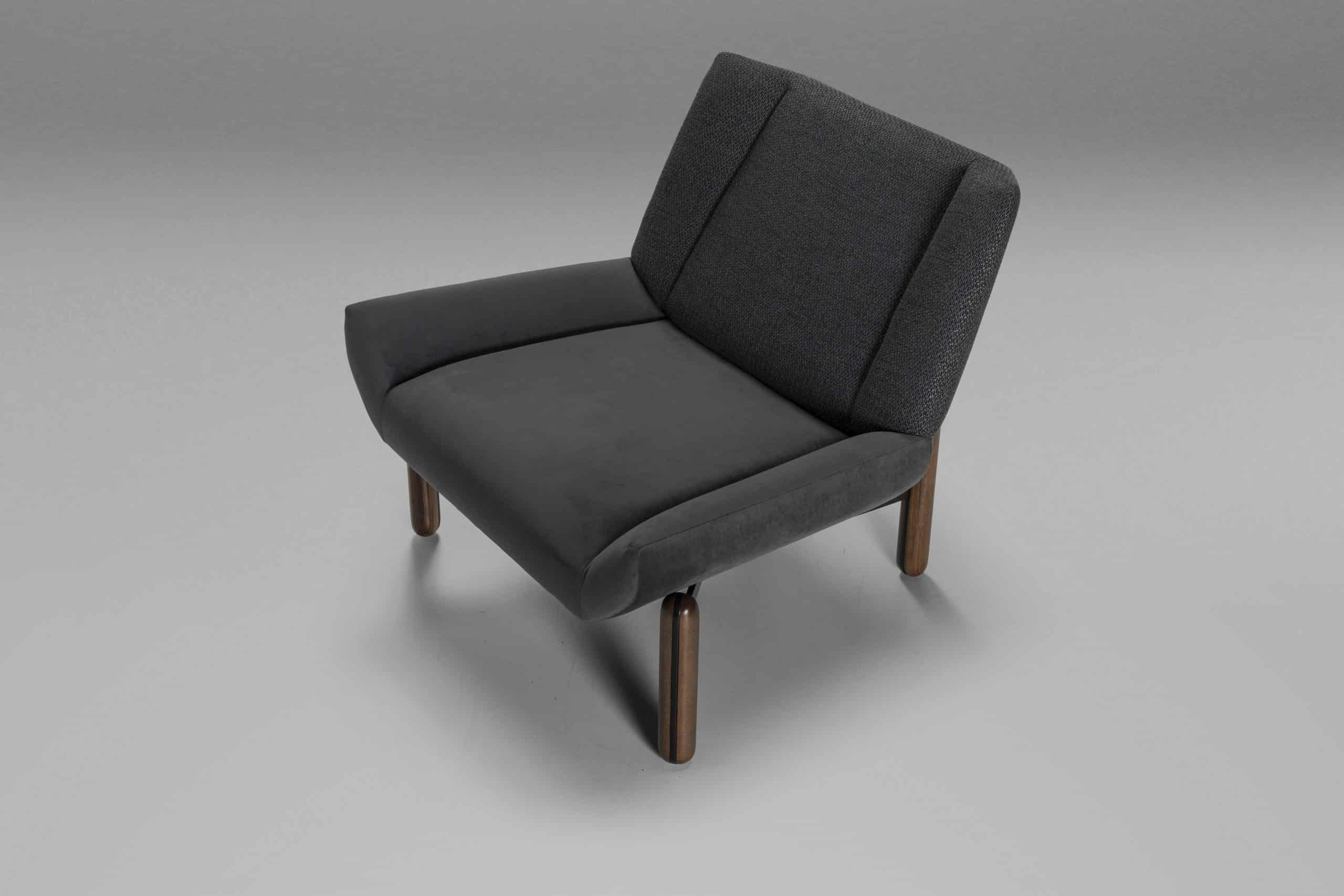Diversos aspectos conferem uma identidade única para a Poltrona Neo Náutica. Os pés em madeira maciça com base e filete metálico, despertam a atenção para a qualidade do encaixe entre os componentes e a sutileza da mescla de materiais. Juntamente com o assento, eles criam uma composição distinta de volumes. A forma do assento que se prolonga até o encosto em um movimento contínuo e angulado, atrai o olhar e convida a experimentar todo o conforto que essa poltrona oferece.