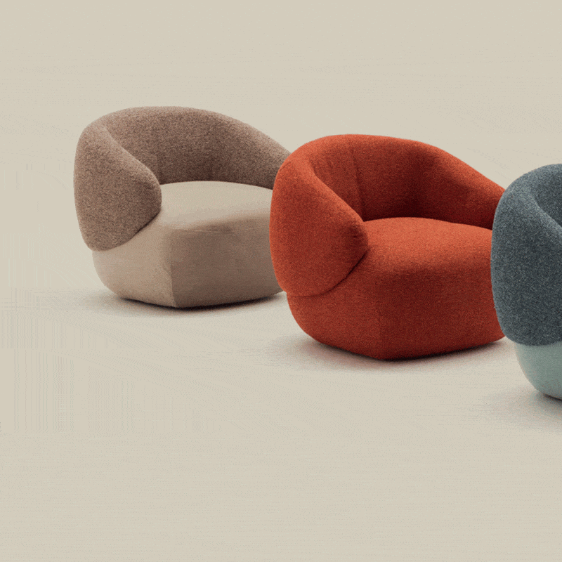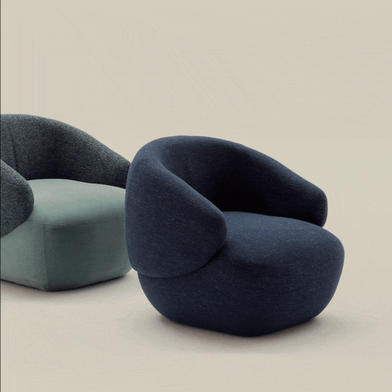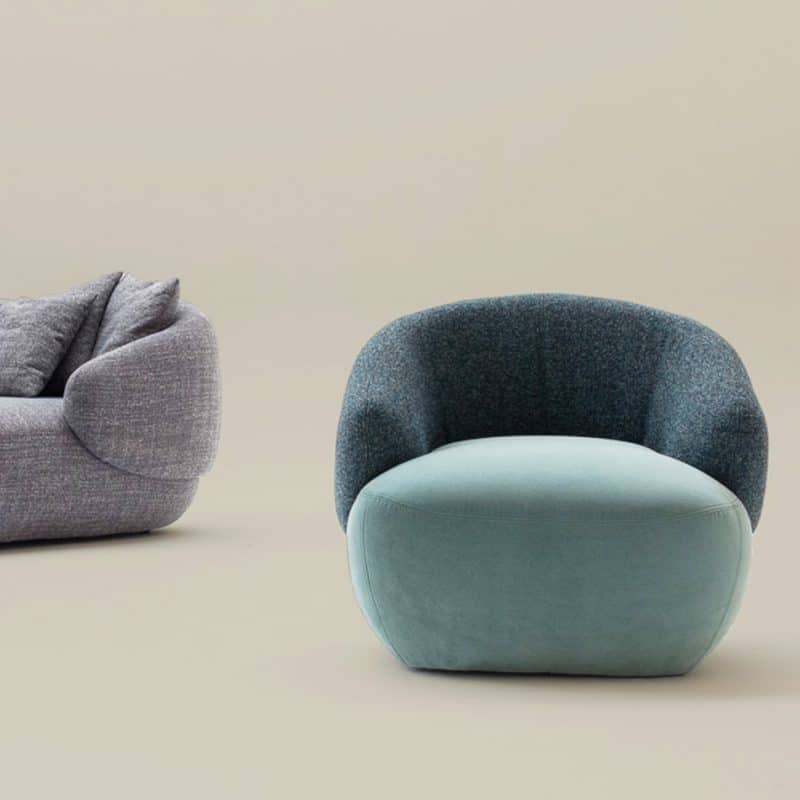 Poltrona estofada de dimensões pequenas com estrutura em madeira de reflorestamento. Opção giratória ou fixa.
