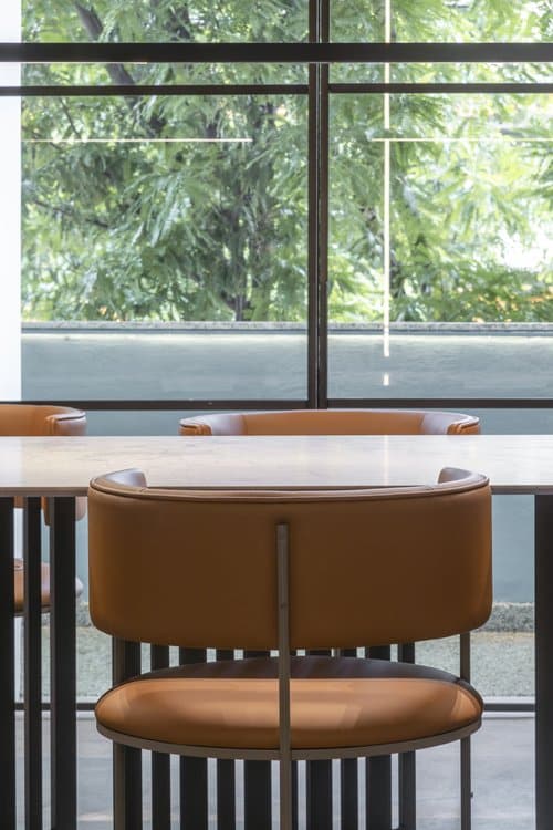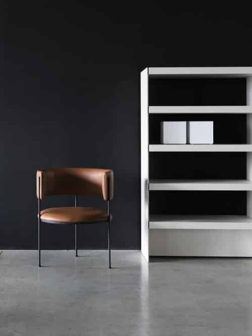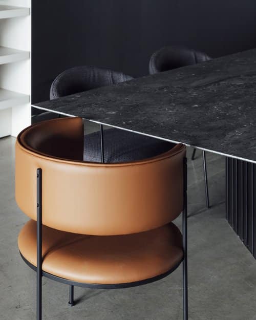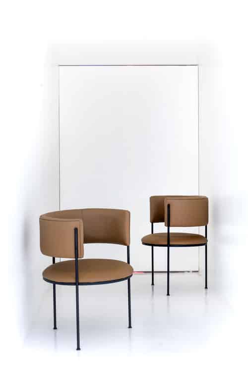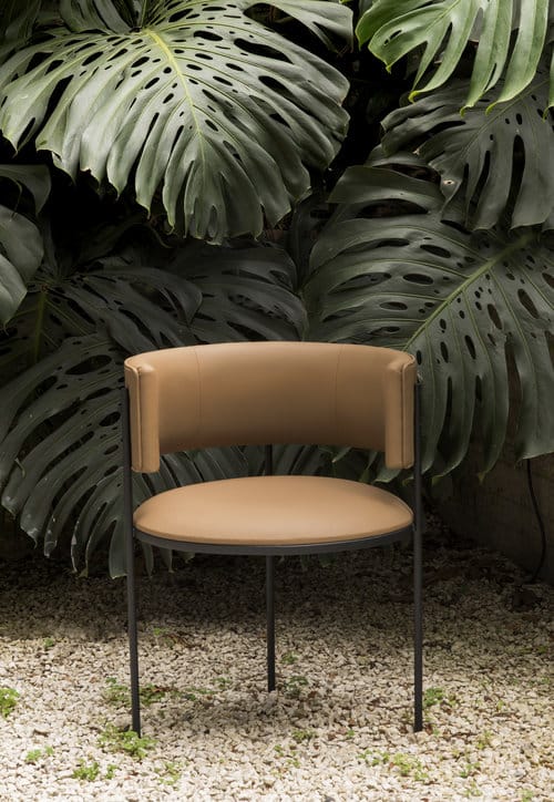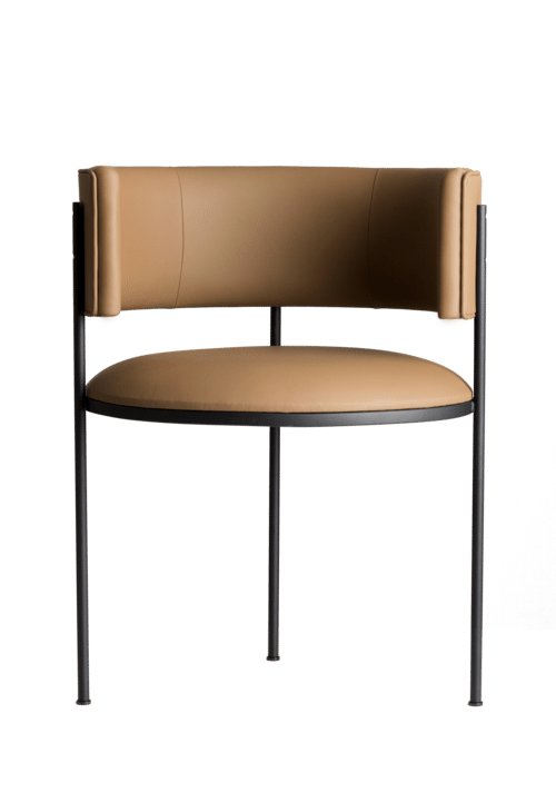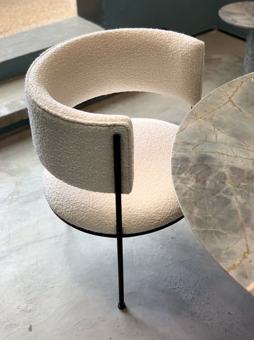 Estrutura em aço carbono com pintura eletrostática. Assento e encosto em couro natural ou tecido Bouclé.