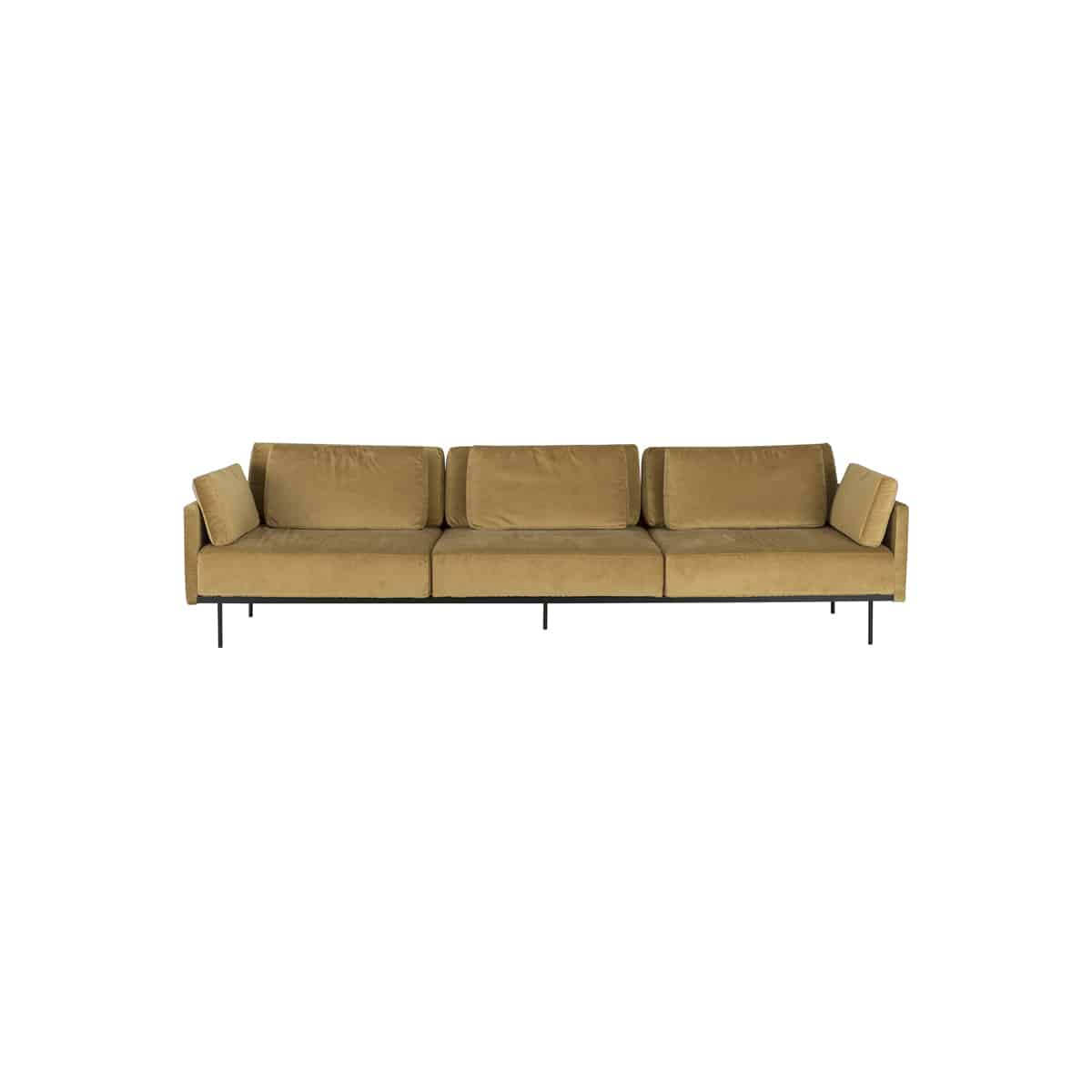 Kyoto é um sofá de rigor geométrico e leveza estrutural, elevado por base metálica de traços finos. O desenho é definido pela ortogonalidade do corpo principal em contraste com a disposição rítmica das almofadas, resultando em uma silhueta linear e equilibrada.